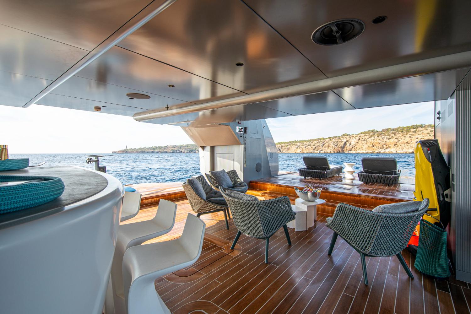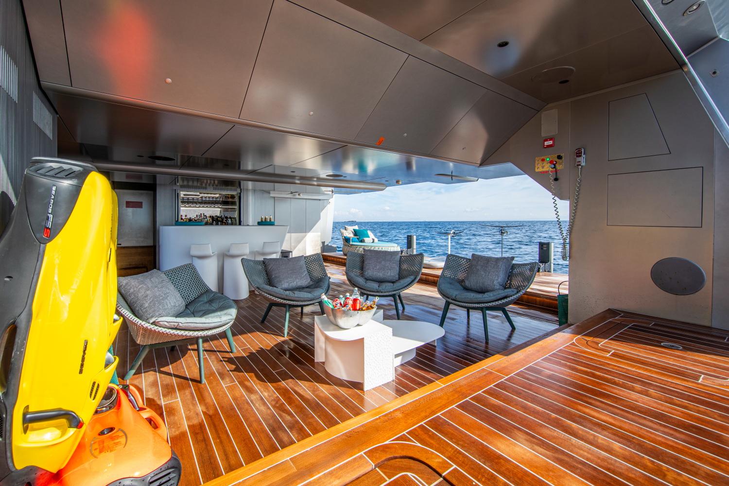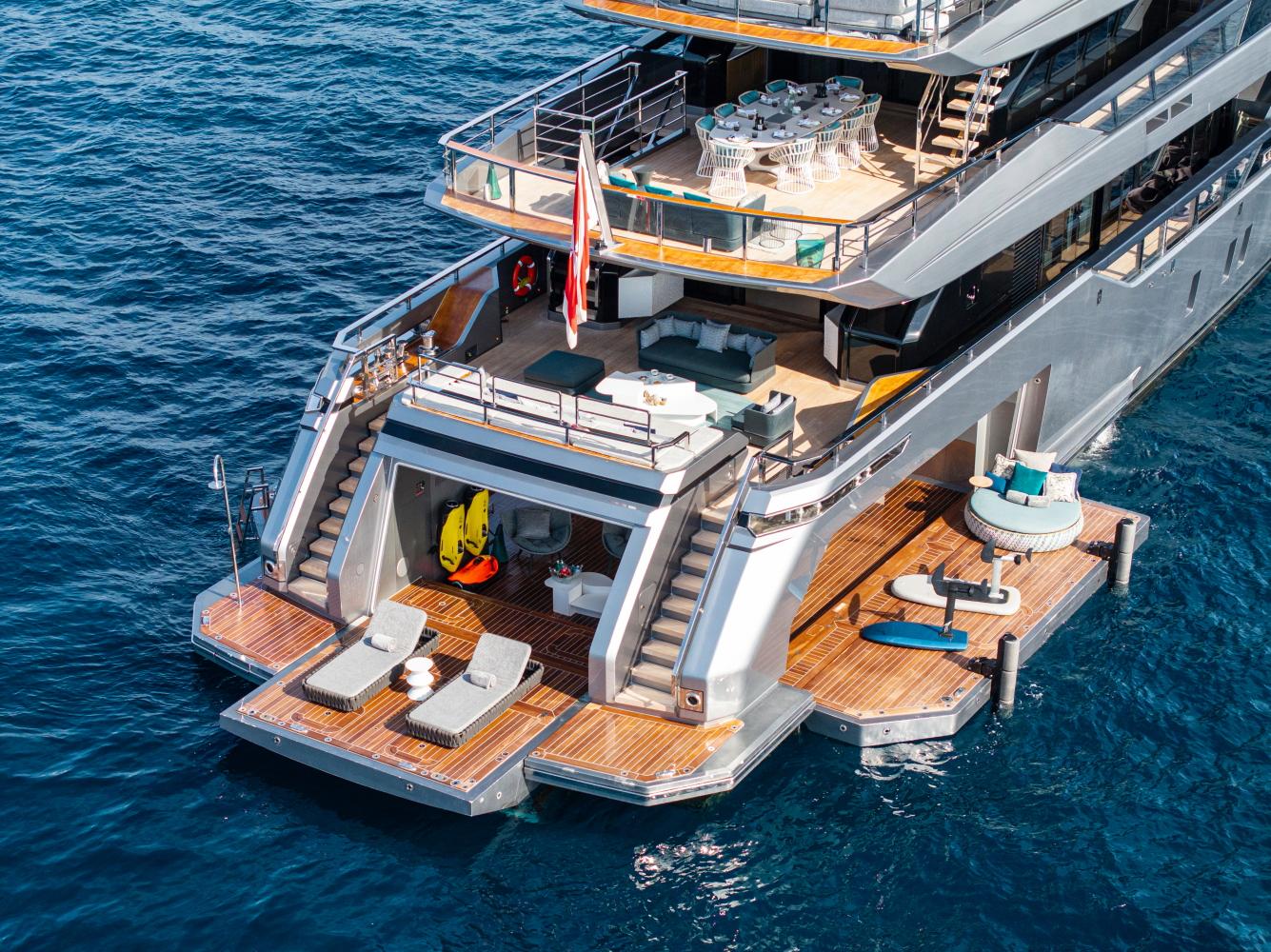 PANDION PEARL располагает просторным бич-клабом и полностью укомплектована двумя тендерами Williams длиной 6,35 м и 3,45 м, а также обширным набором водных игрушек и профессиональным оборудованием для дайвинга.