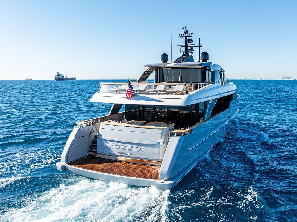 POBOY — трёхпалубная моторная яхта 2021 года постройки, находящаяся в состоянии «как новая», построенная верфью Sanlorenzo и недавно прошедшая рефит и полную окраску в 2025 году. Максимальная скорость составляет 17 узлов, комфортная крейсерская — от 12 до 14 узлов, что обеспечивается двигателями CAT C18 с наработкой чуть более 2 000 часов.