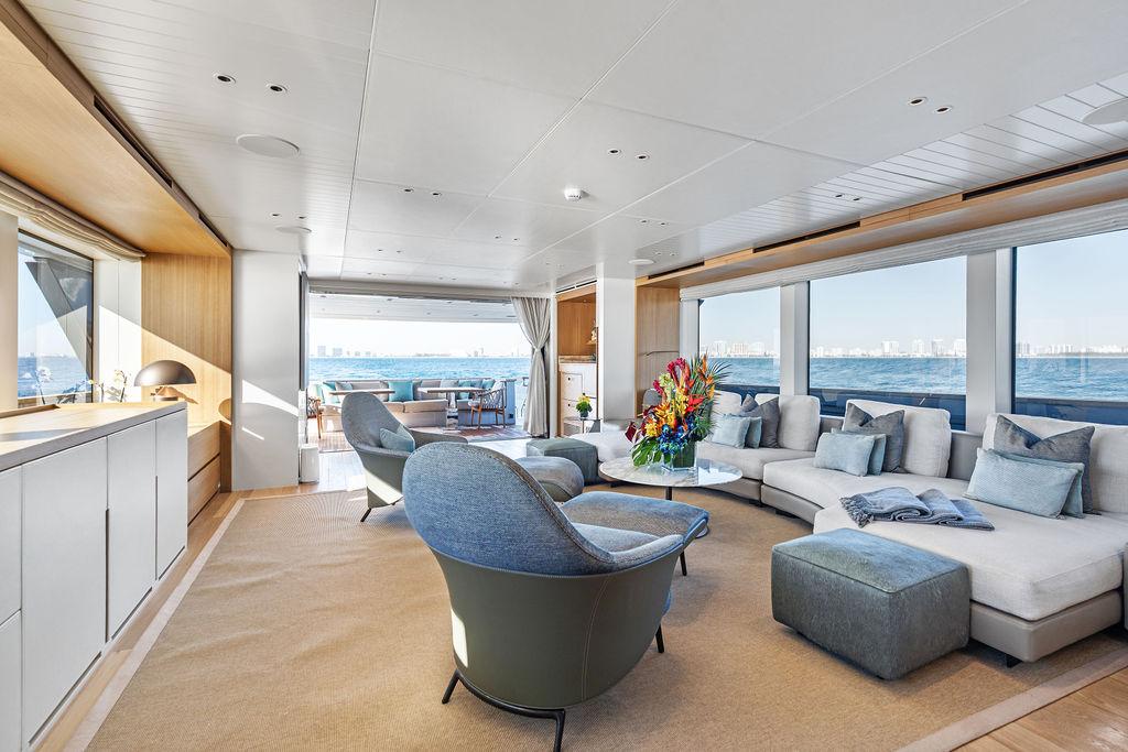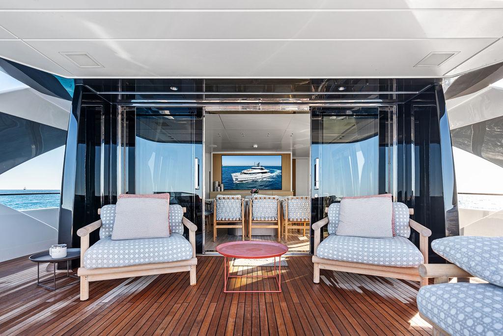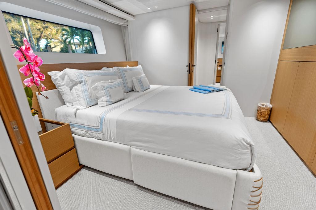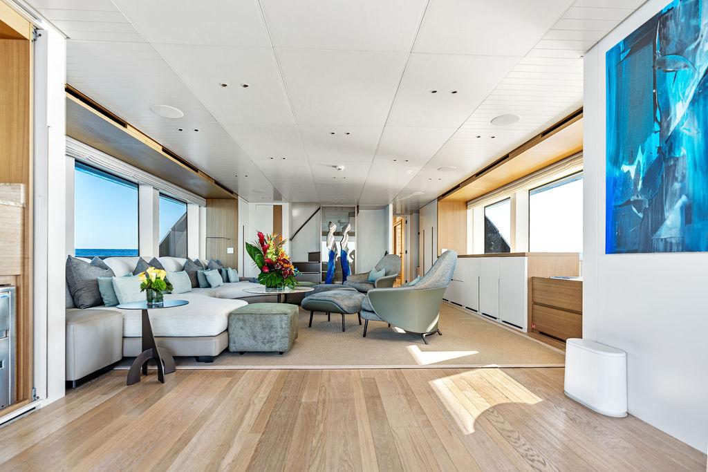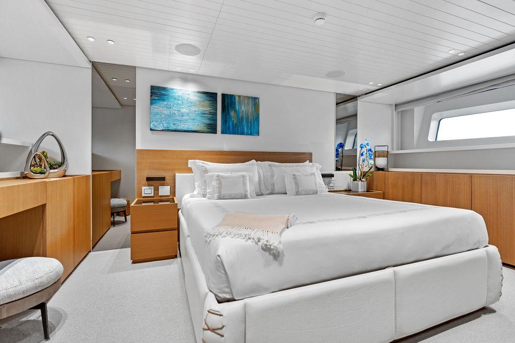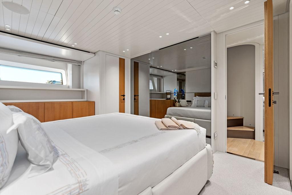 На нижней палубе расположены три каюты с ванными комнатами, включая VIP-каюту на всю ширину корпуса в носовой части и две двухместные каюты. Верхняя палуба (бридж-дек) предлагает обеденную зону на открытом воздухе с раздвижными дверями, ведущими на кормовую и боковые палубы. Перед рулевой рубкой находятся джакузи и дополнительная зона отдыха. Солнечная палуба оборудована баром и грилем, а также зонами для сидения и отдыха.