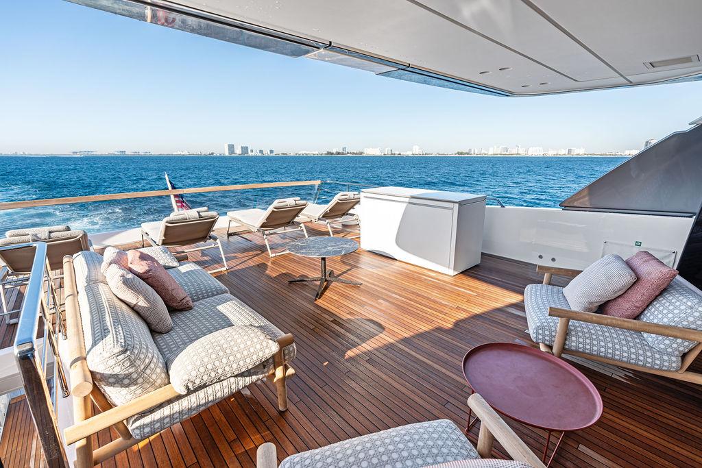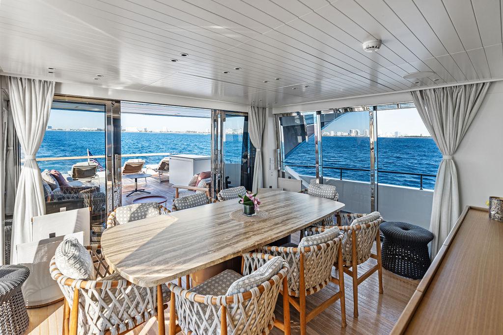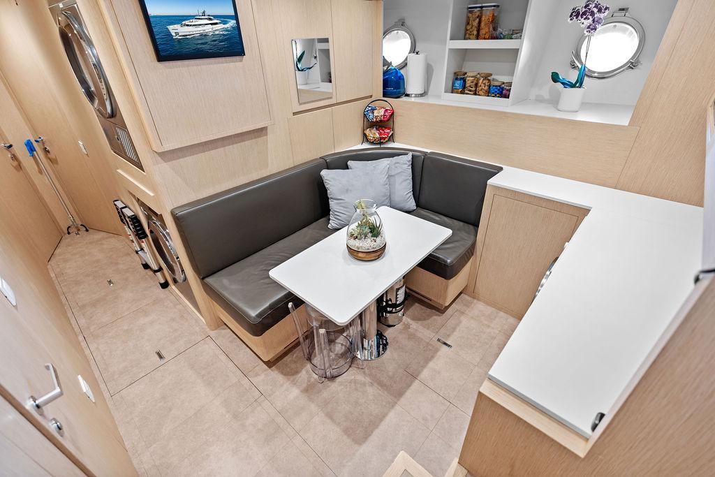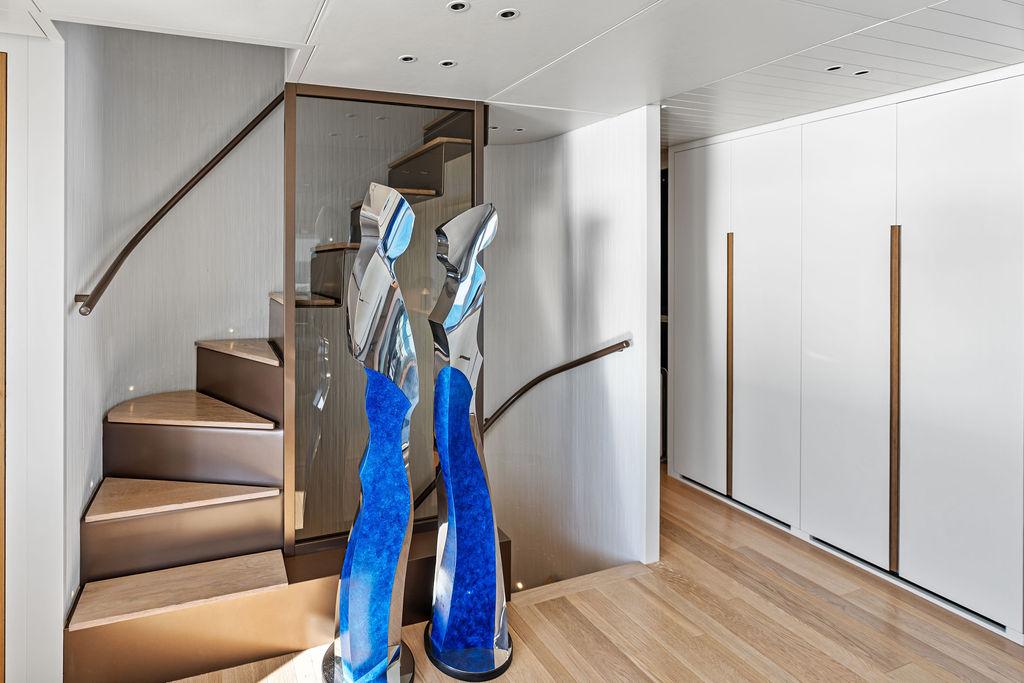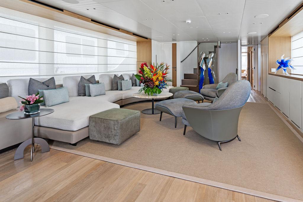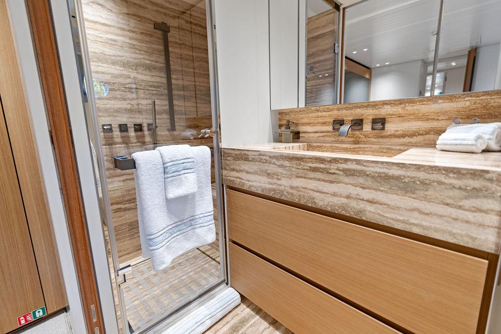 На нижней палубе расположены три каюты с ванными комнатами, включая VIP-каюту на всю ширину корпуса в носовой части и две двухместные каюты. Верхняя палуба (бридж-дек) предлагает обеденную зону на открытом воздухе с раздвижными дверями, ведущими на кормовую и боковые палубы. Перед рулевой рубкой находятся джакузи и дополнительная зона отдыха. Солнечная палуба оборудована баром и грилем, а также зонами для сидения и отдыха.