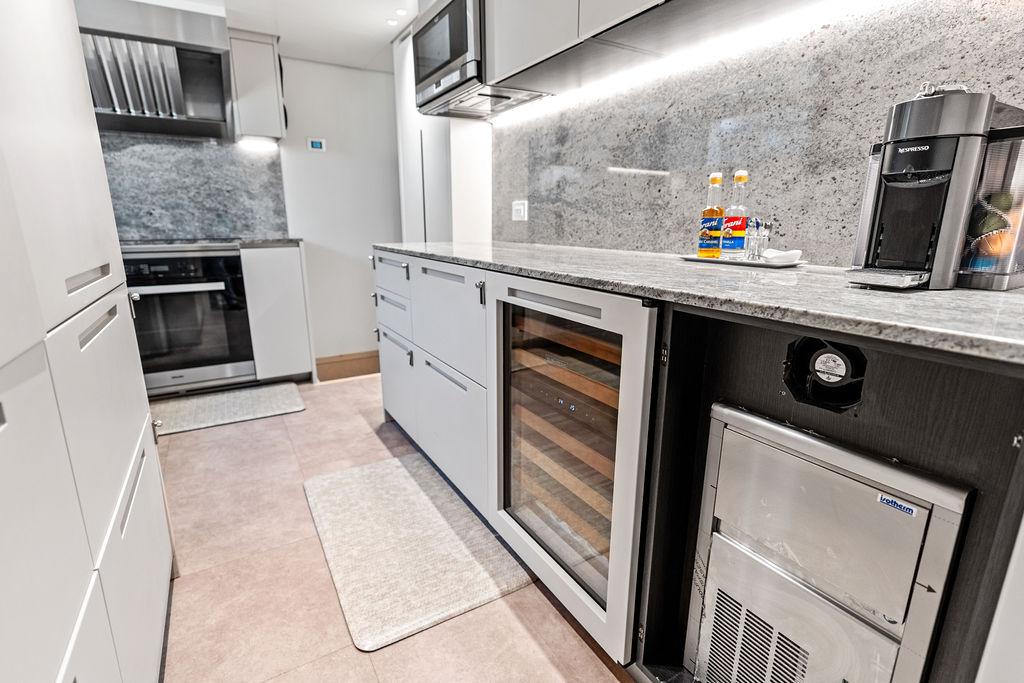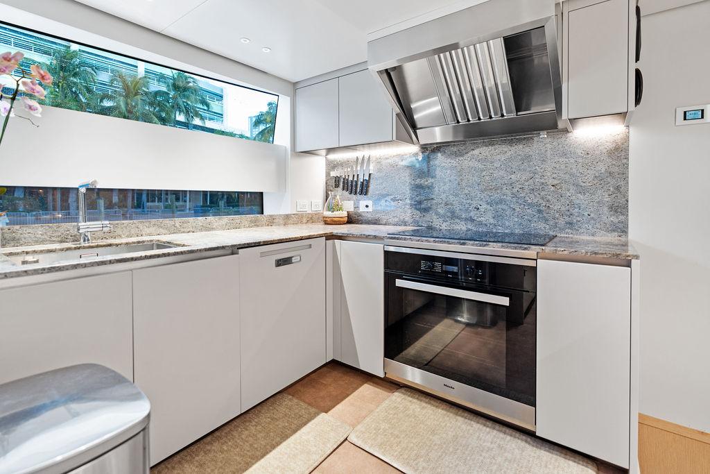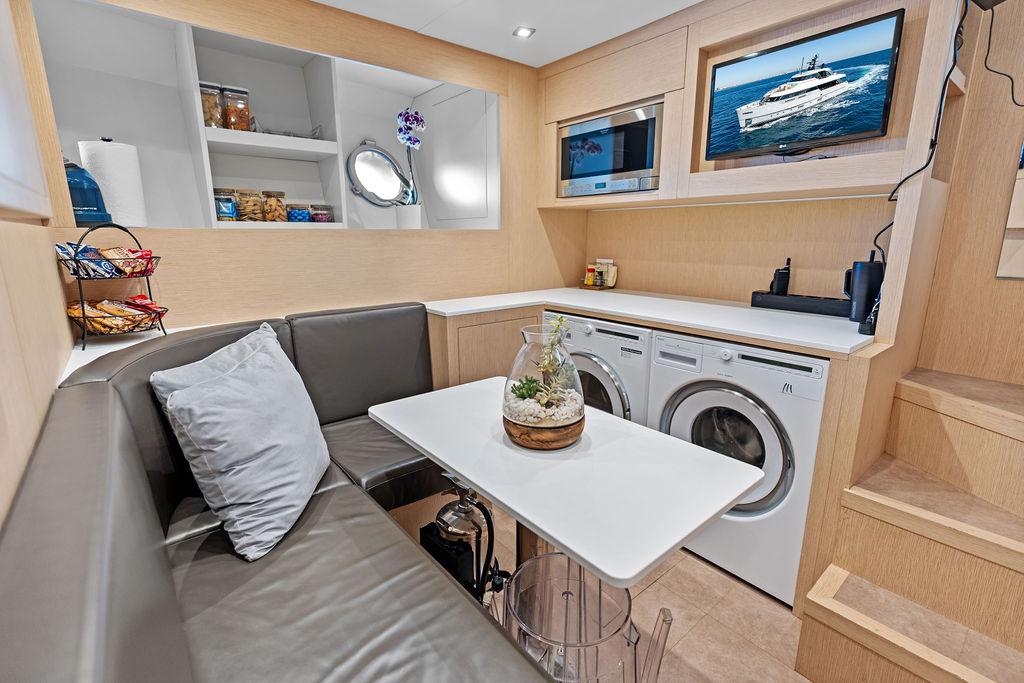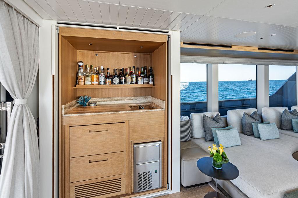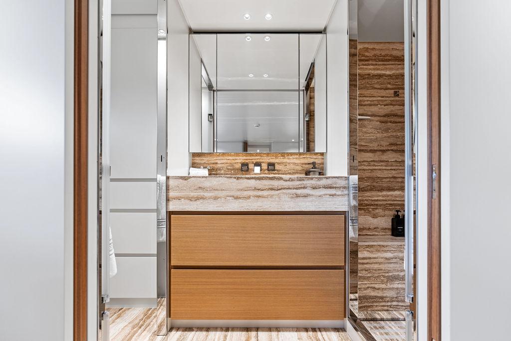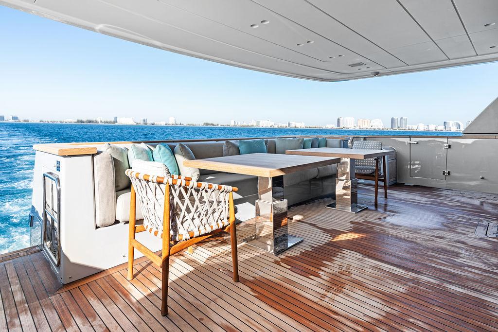 На нижней палубе расположены три каюты с ванными комнатами, включая VIP-каюту на всю ширину корпуса в носовой части и две двухместные каюты. Верхняя палуба (бридж-дек) предлагает обеденную зону на открытом воздухе с раздвижными дверями, ведущими на кормовую и боковые палубы. Перед рулевой рубкой находятся джакузи и дополнительная зона отдыха. Солнечная палуба оборудована баром и грилем, а также зонами для сидения и отдыха.