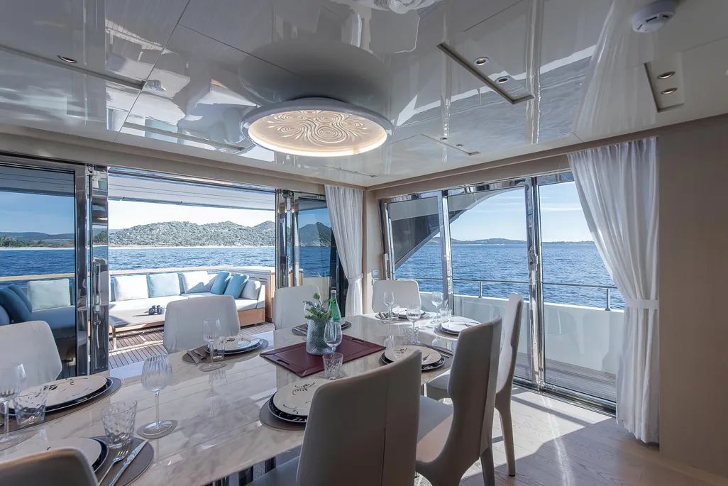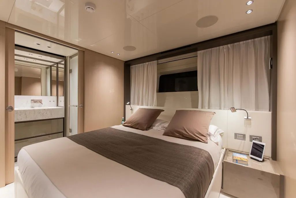 Яхта имеет три палубы и может комфортно разместить до 8 гостей в четырёх роскошных каютах: мастер-каюта во всю ширину корпуса, одна VIP-каюта и две двухместные каюты. Все каюты оснащены собственными ванными комнатами.