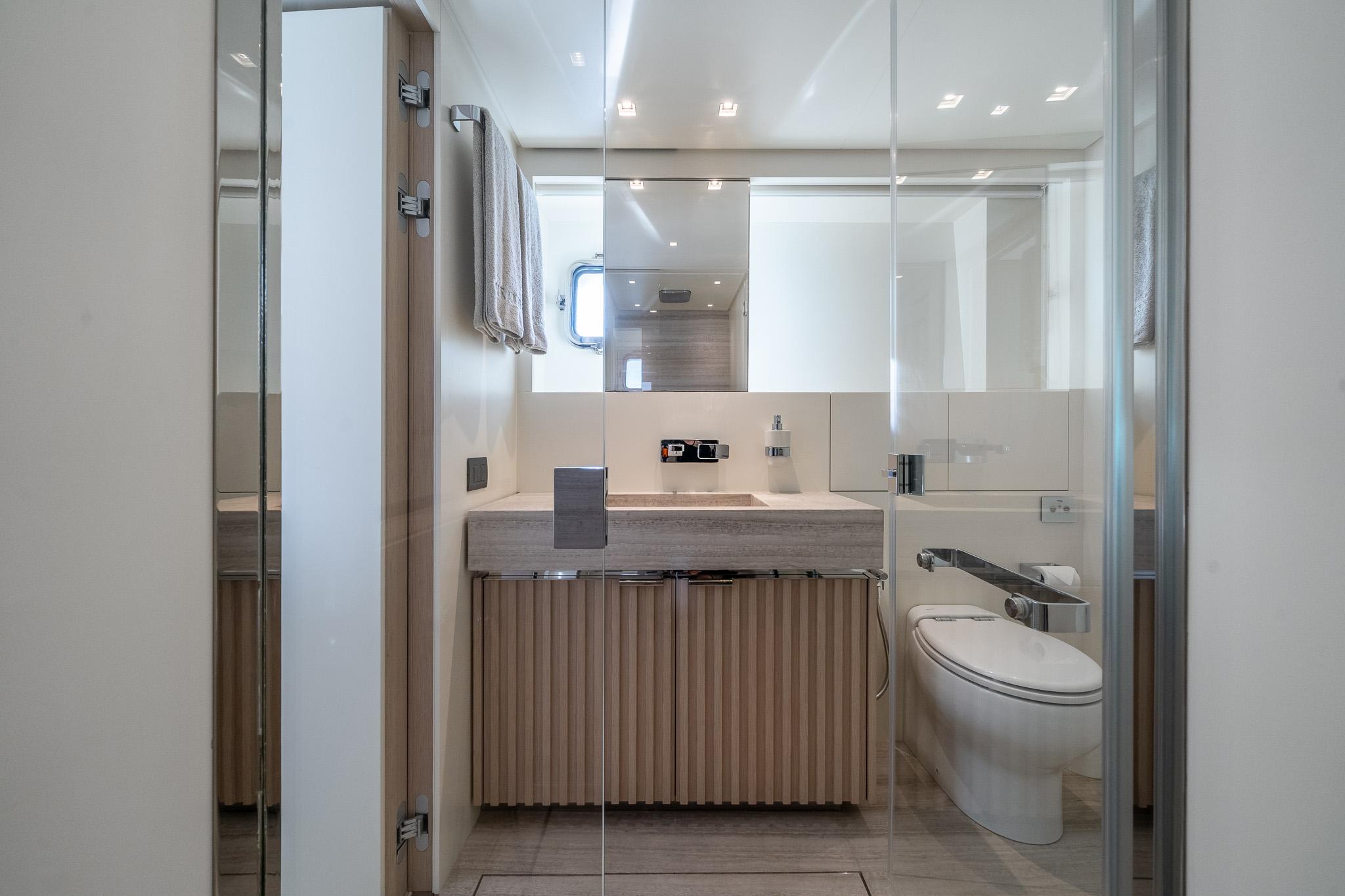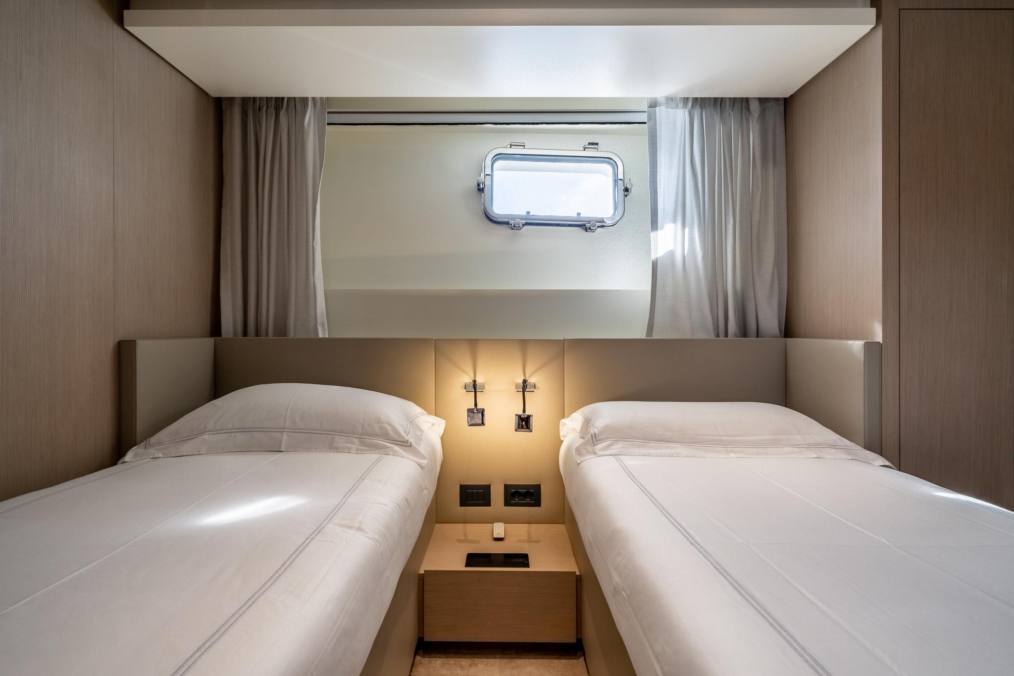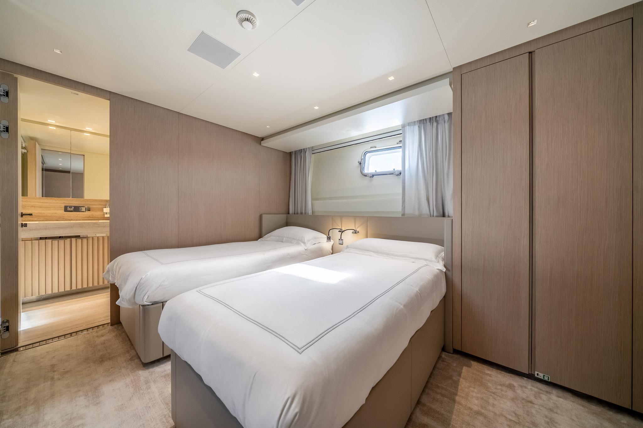 Яхта рассчитана на размещение до восьми гостей в четырёх роскошных каютах. При этом предусмотрена возможность переоборудования обеденной зоны на главной палубе в мастер-каюту — подробности предоставляются по запросу. Текущая мастер-каюта во всю ширину корпуса расположена на нижней палубе и оснащена диваном, туалетным столиком, вместительными шкафами, зеркалом с ТВ и просторной ванной комнатой. Дополнительно предусмотрены двухместная каюта, каюта с раздельными кроватями и универсальная каюта, которая может быть сконфигурирована как с двуспальной, так и с двумя односпальными кроватями. Экипаж размещается на главной палубе: пять человек в трёх каютах, включая капитанскую каюту с увеличенной кроватью, рабочим столом и собственной ванной.
