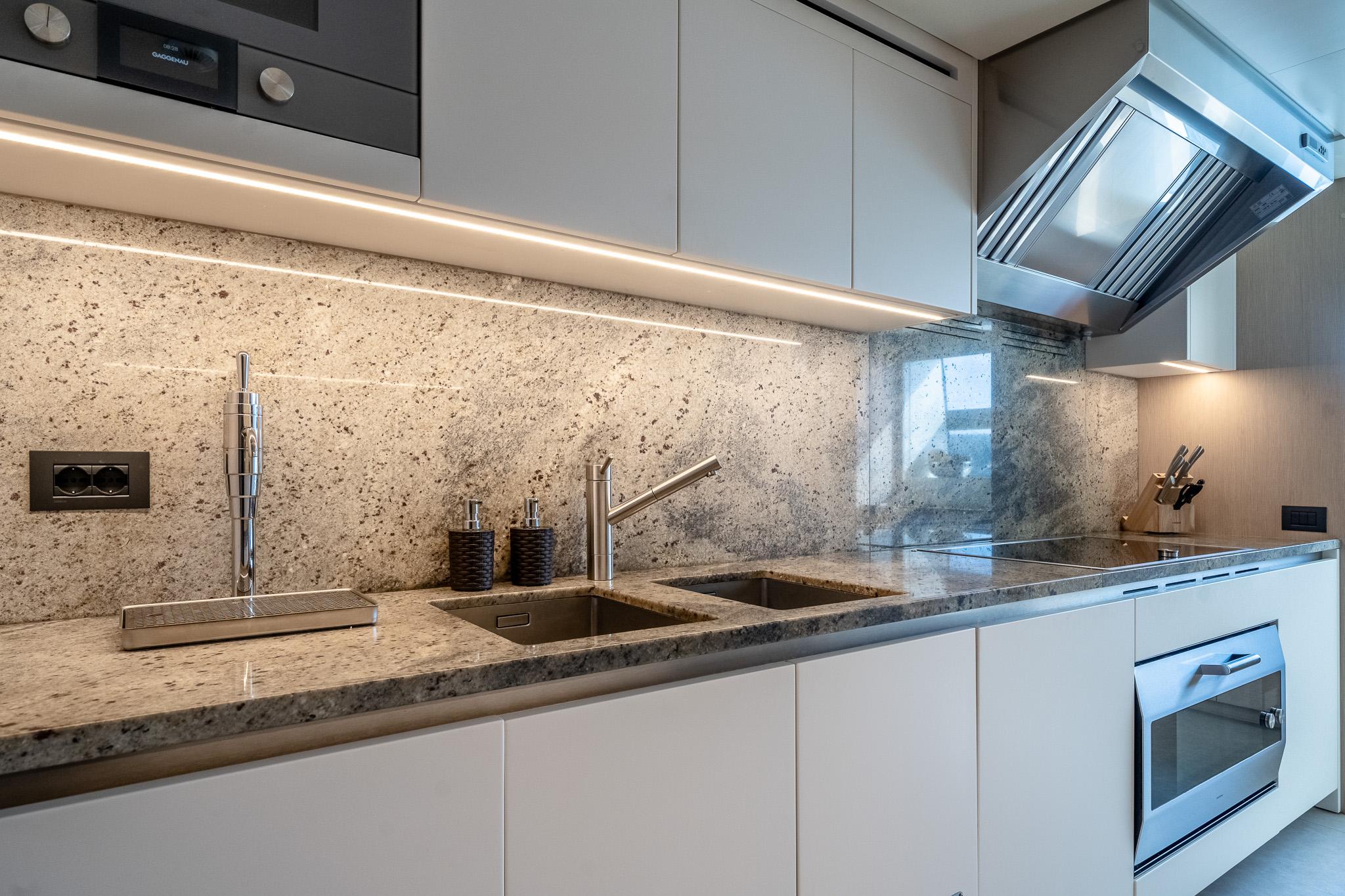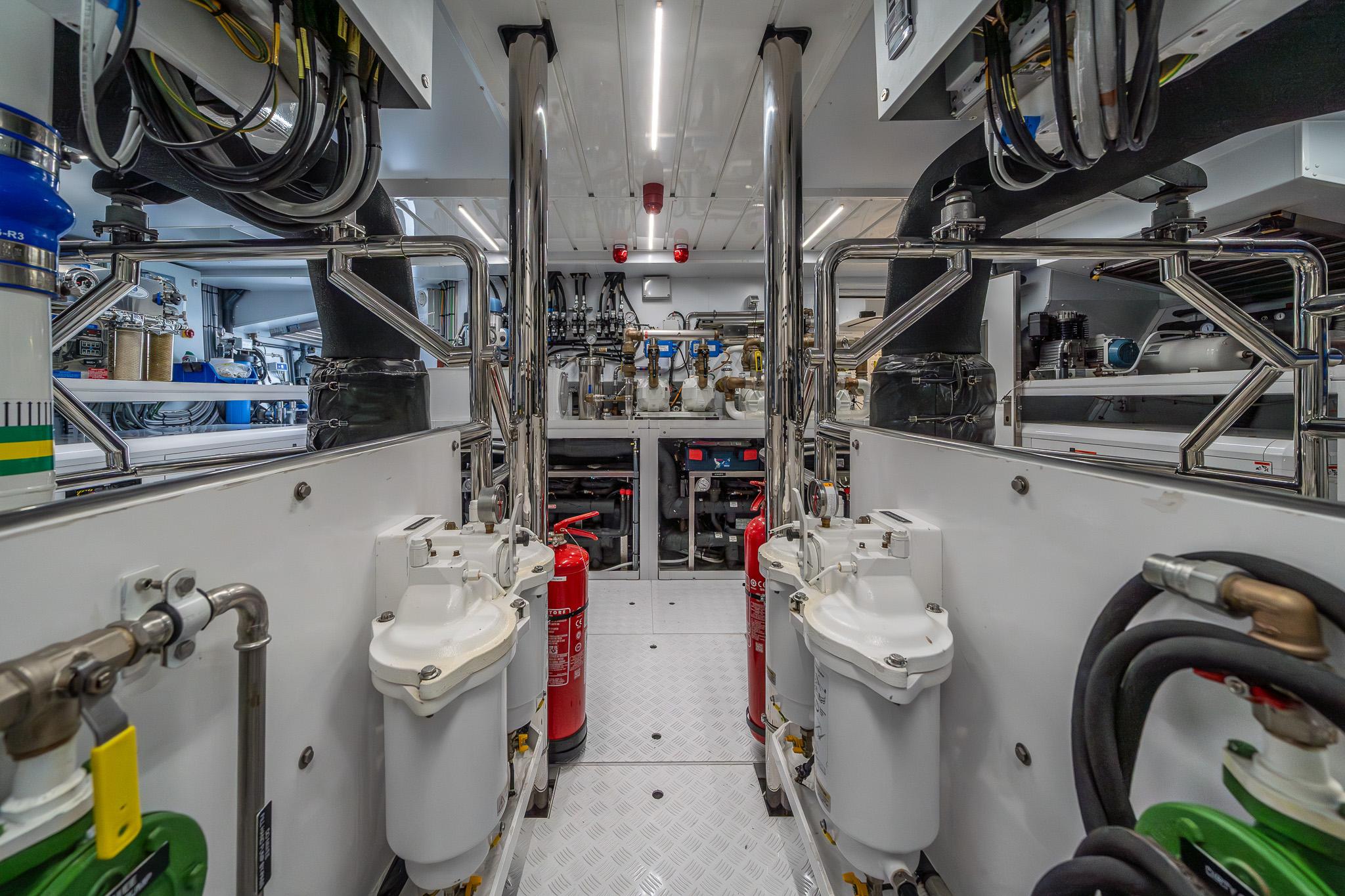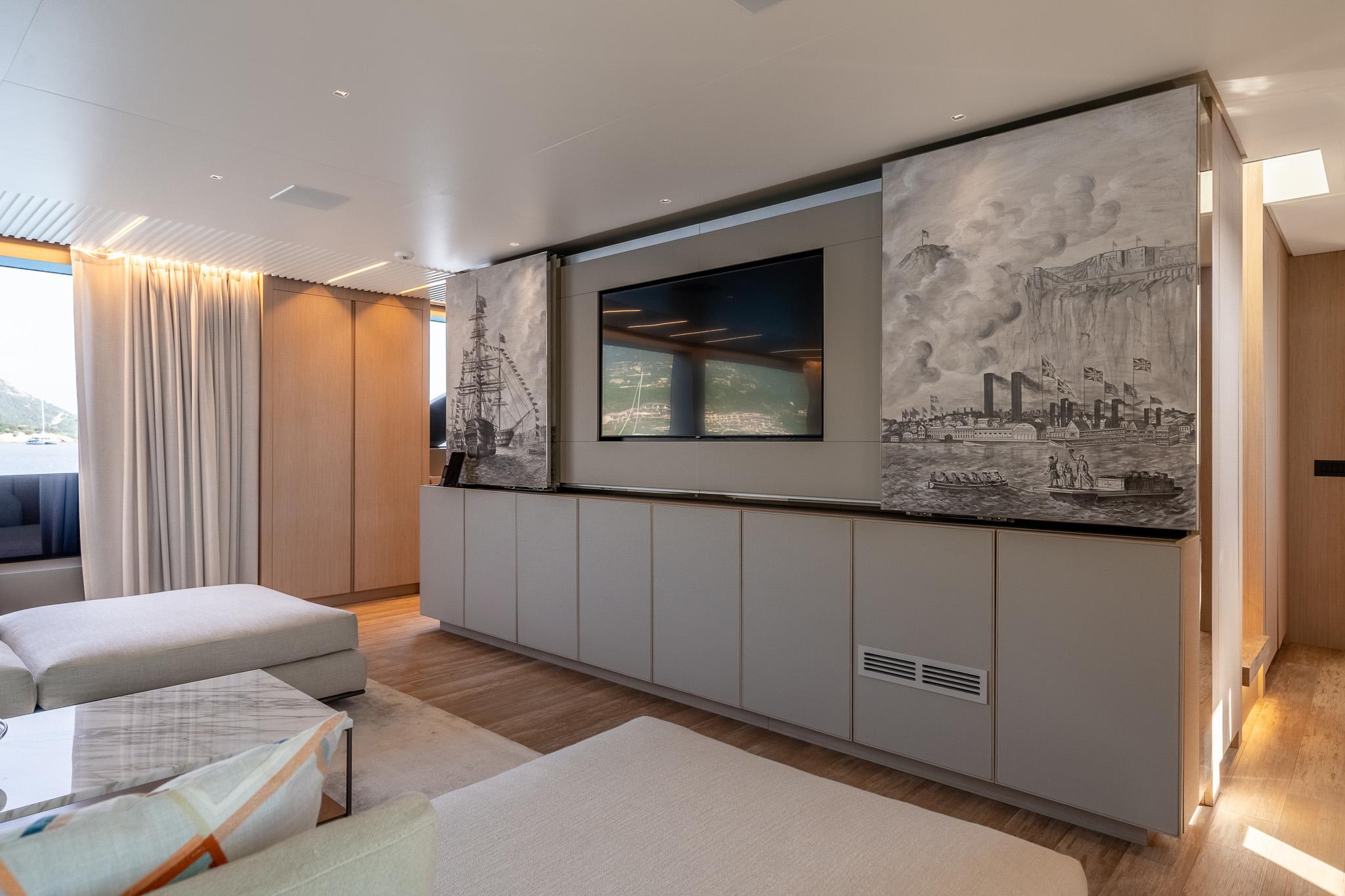 Яхта рассчитана на размещение до восьми гостей в четырёх роскошных каютах. При этом предусмотрена возможность переоборудования обеденной зоны на главной палубе в мастер-каюту — подробности предоставляются по запросу. Текущая мастер-каюта во всю ширину корпуса расположена на нижней палубе и оснащена диваном, туалетным столиком, вместительными шкафами, зеркалом с ТВ и просторной ванной комнатой. Дополнительно предусмотрены двухместная каюта, каюта с раздельными кроватями и универсальная каюта, которая может быть сконфигурирована как с двуспальной, так и с двумя односпальными кроватями. Экипаж размещается на главной палубе: пять человек в трёх каютах, включая капитанскую каюту с увеличенной кроватью, рабочим столом и собственной ванной.