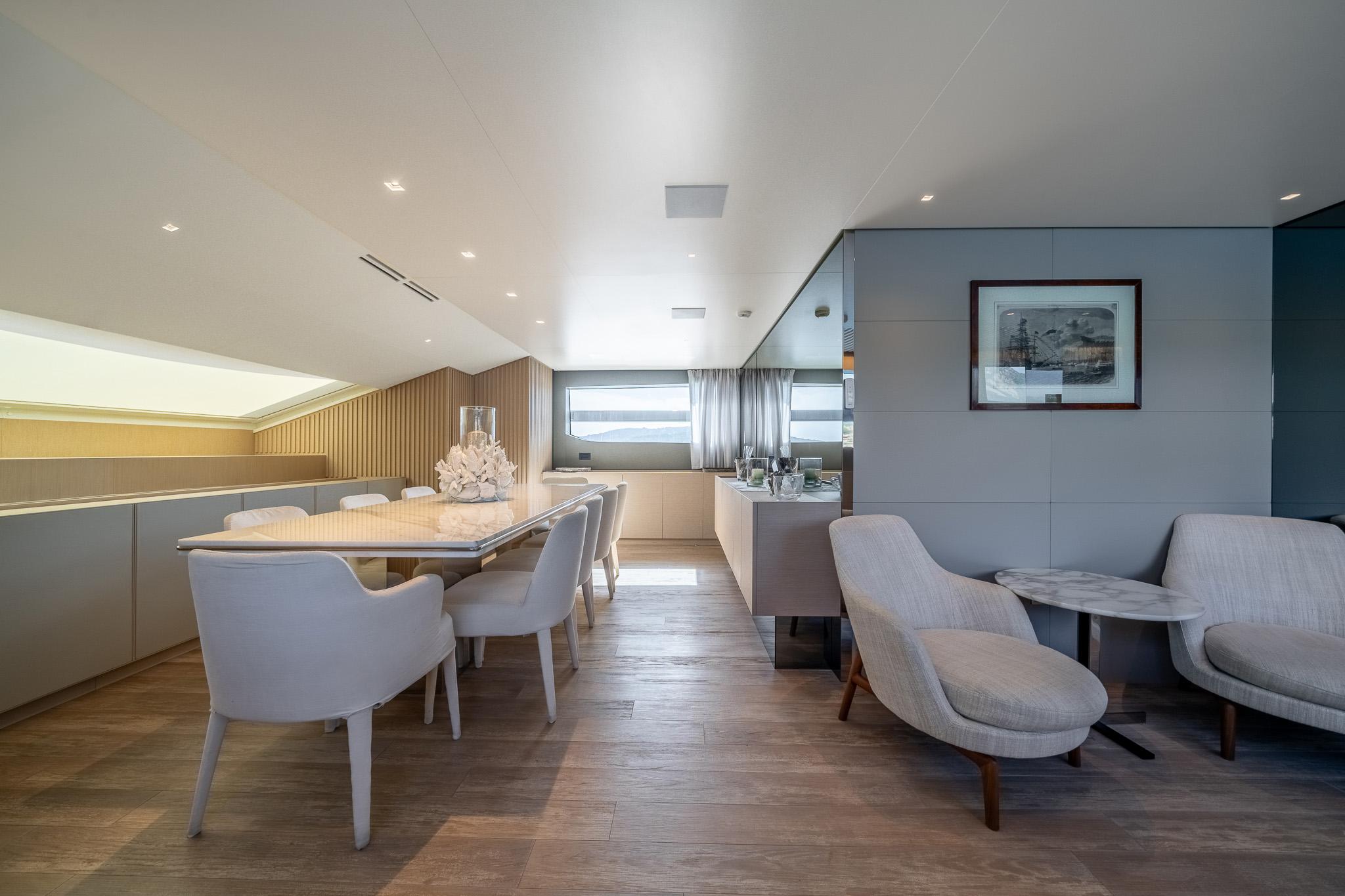 Асимметричная архитектура BLUE ANGEL позволяет реализовать уникальную планировку, максимально эффективно используя внутреннее пространство и обеспечивая плавный переход между интерьером и экстерьером. Интерьеры, разработанные собственной дизайнерской командой Sanlorenzo, выполнены в современном стиле с использованием мебели и отделки от ведущих брендов, таких как Minotti, Baxter и Roda. Отделка из отбелённого полосатого дуба, кожа Nuvola Canapa и акценты из дымчатых зеркал создают тёплую и элегантную атмосферу. Панорамные окна от пола до потолка наполняют помещения естественным светом, усиливая связь с окружающим морем.