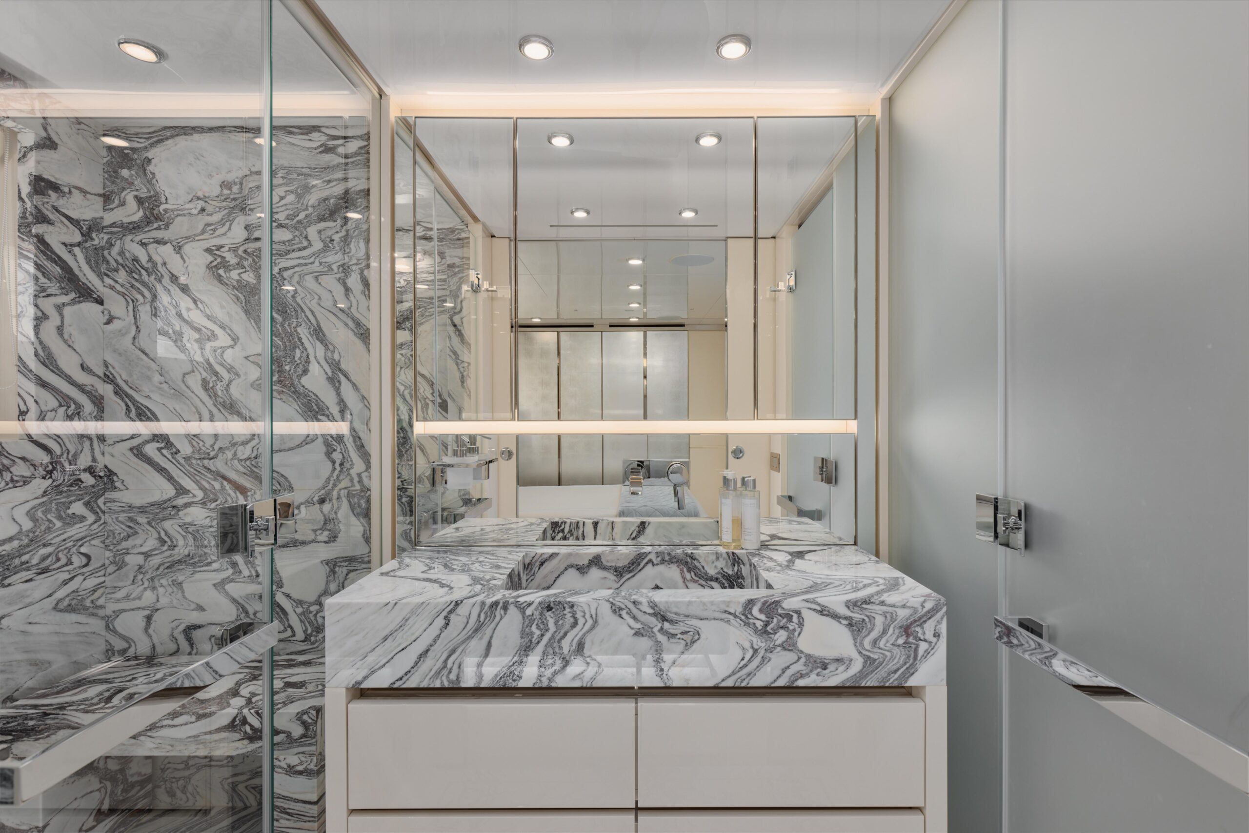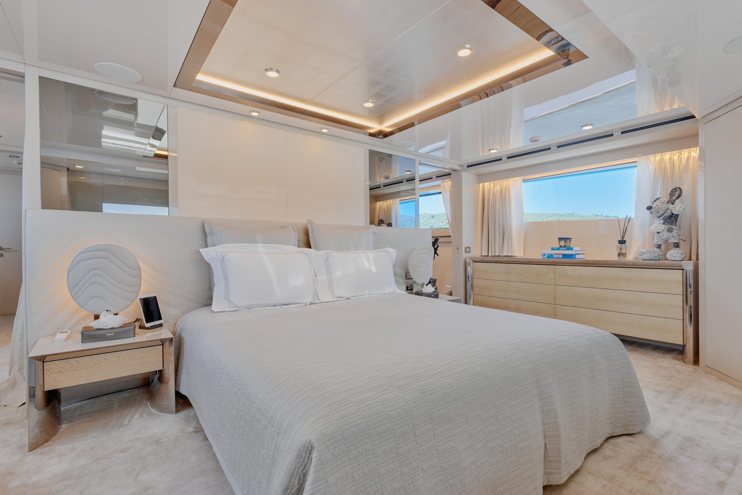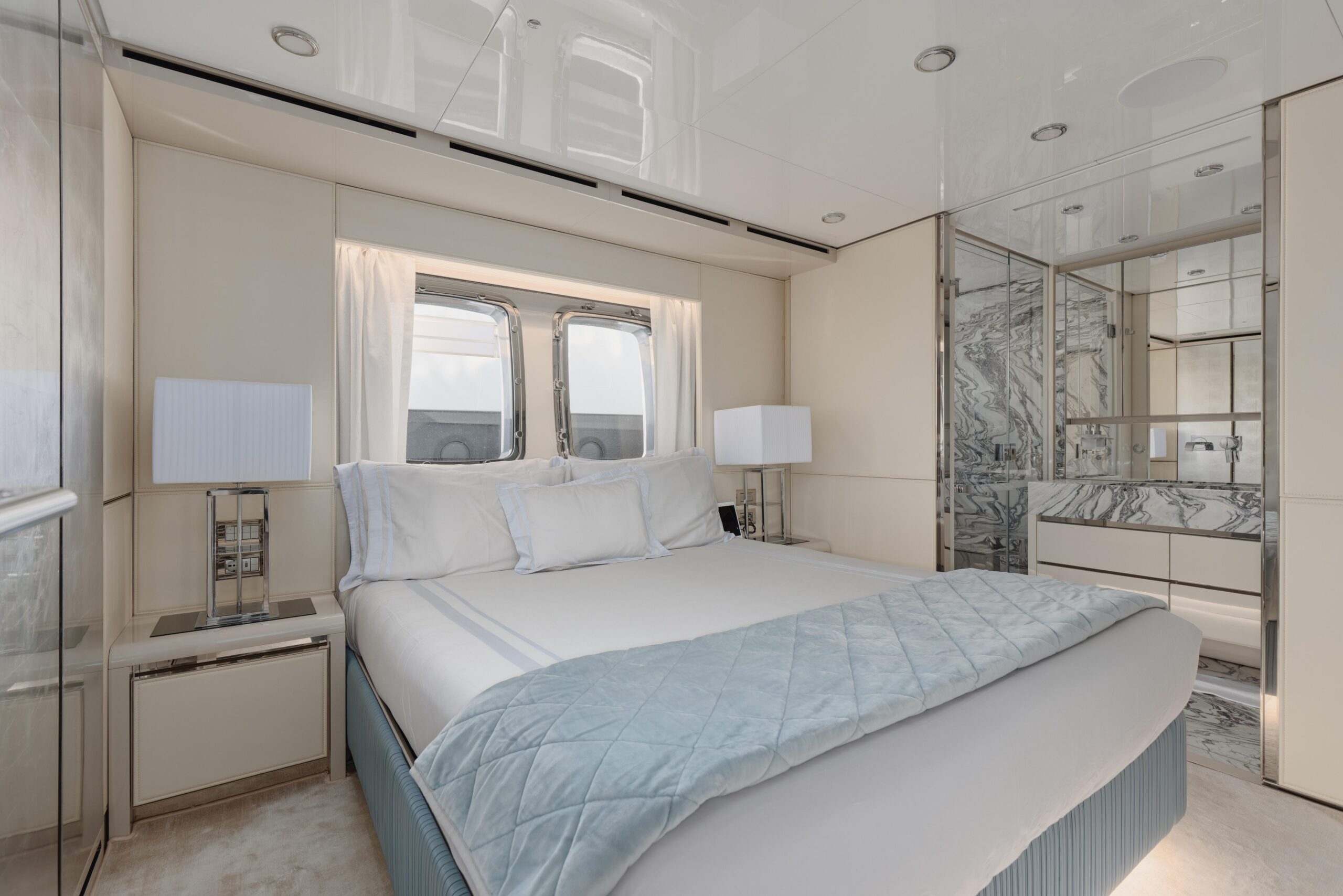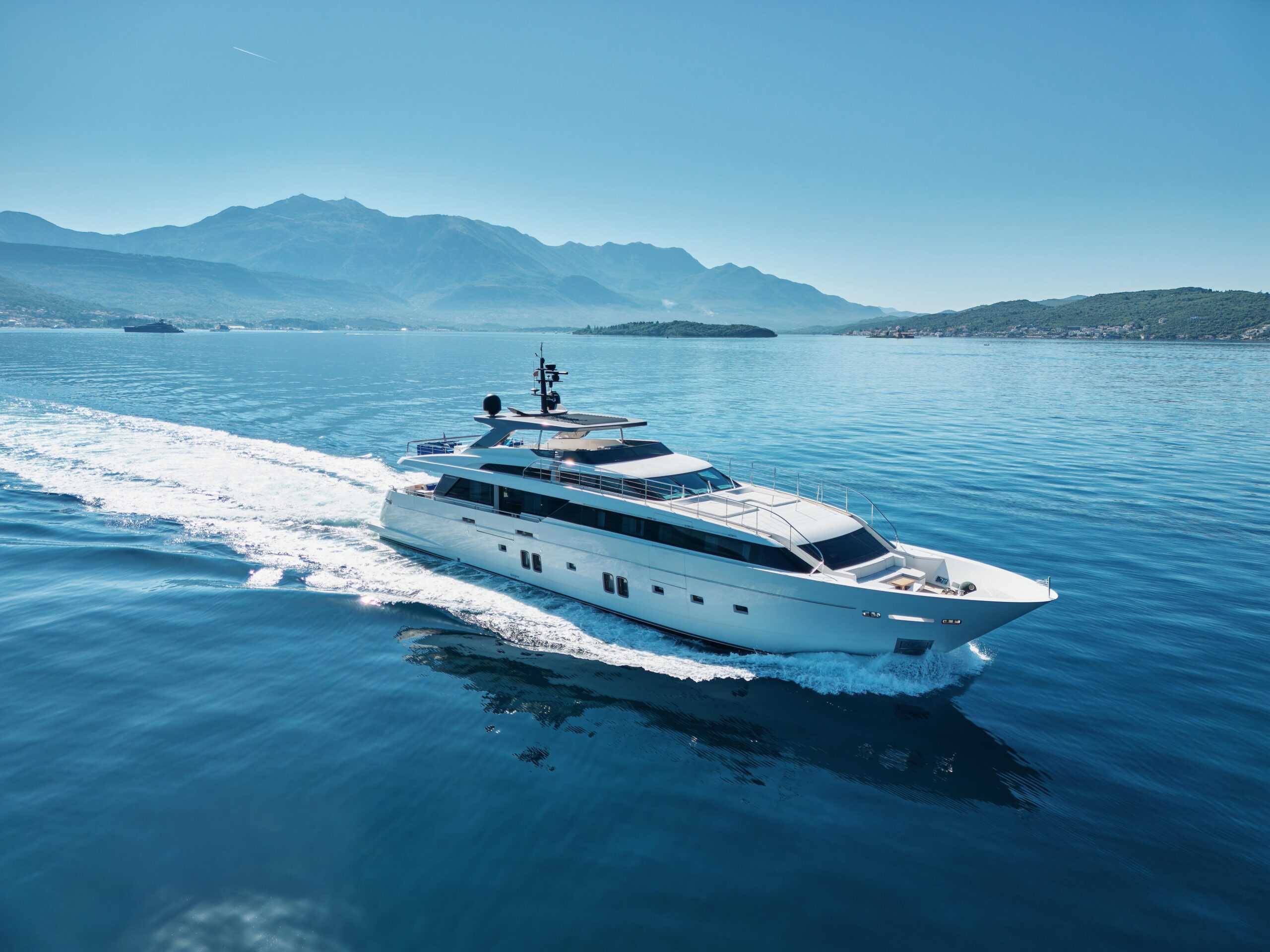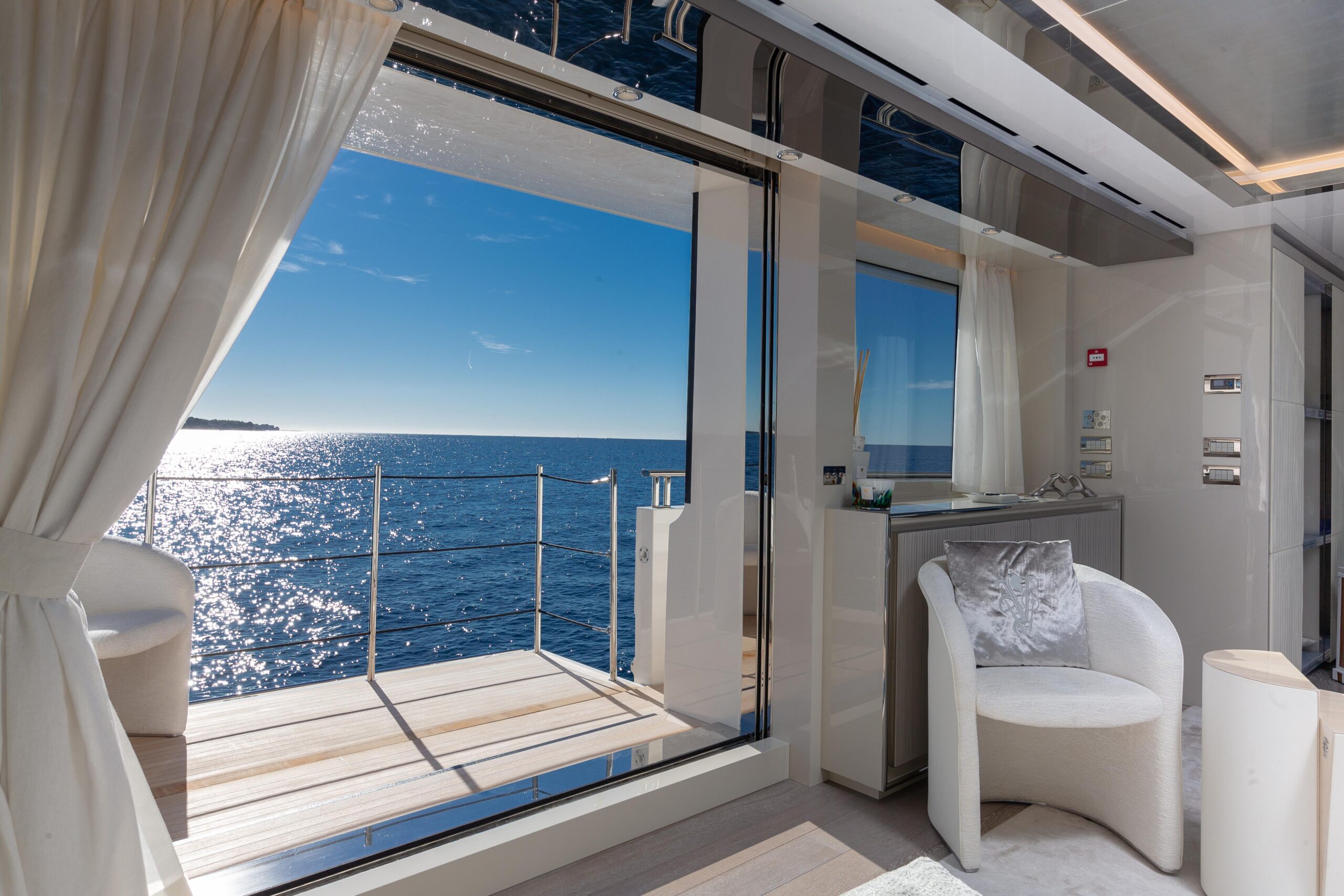 Оснащённая глиссирующим корпусом из стеклопластика (GRP), яхта сочетает высокую скорость и эффективность с роскошными жилыми пространствами. Просторный и изысканный интерьер разработан студией Visionnaire и выполнен в тёплых нейтральных тонах с акцентами из оникса и мрамора. Главный салон дополнен эффектным балконом, который наполняет пространство естественным светом и гармонично объединяет интерьер с открытыми зонами.