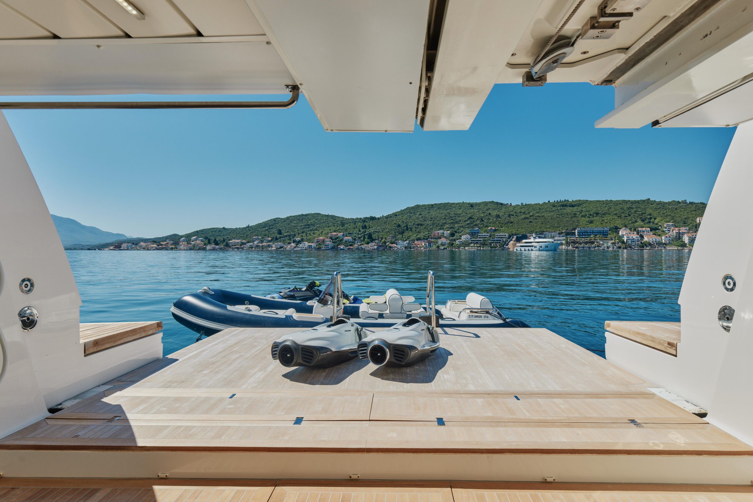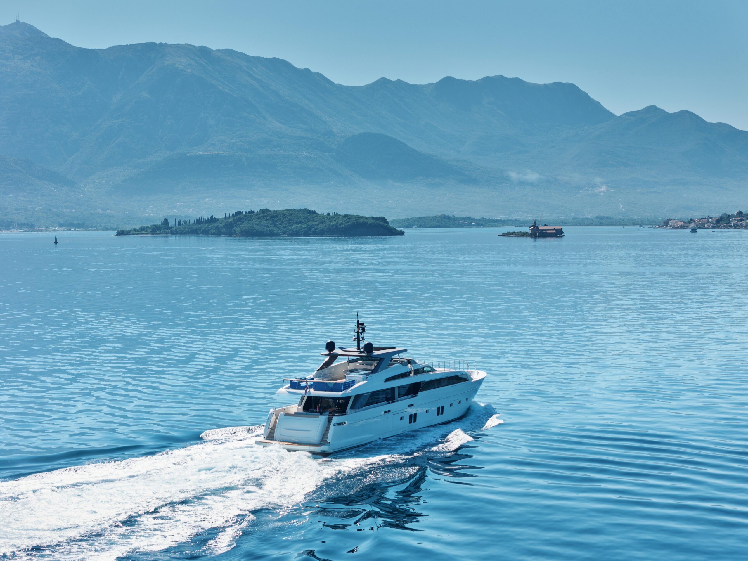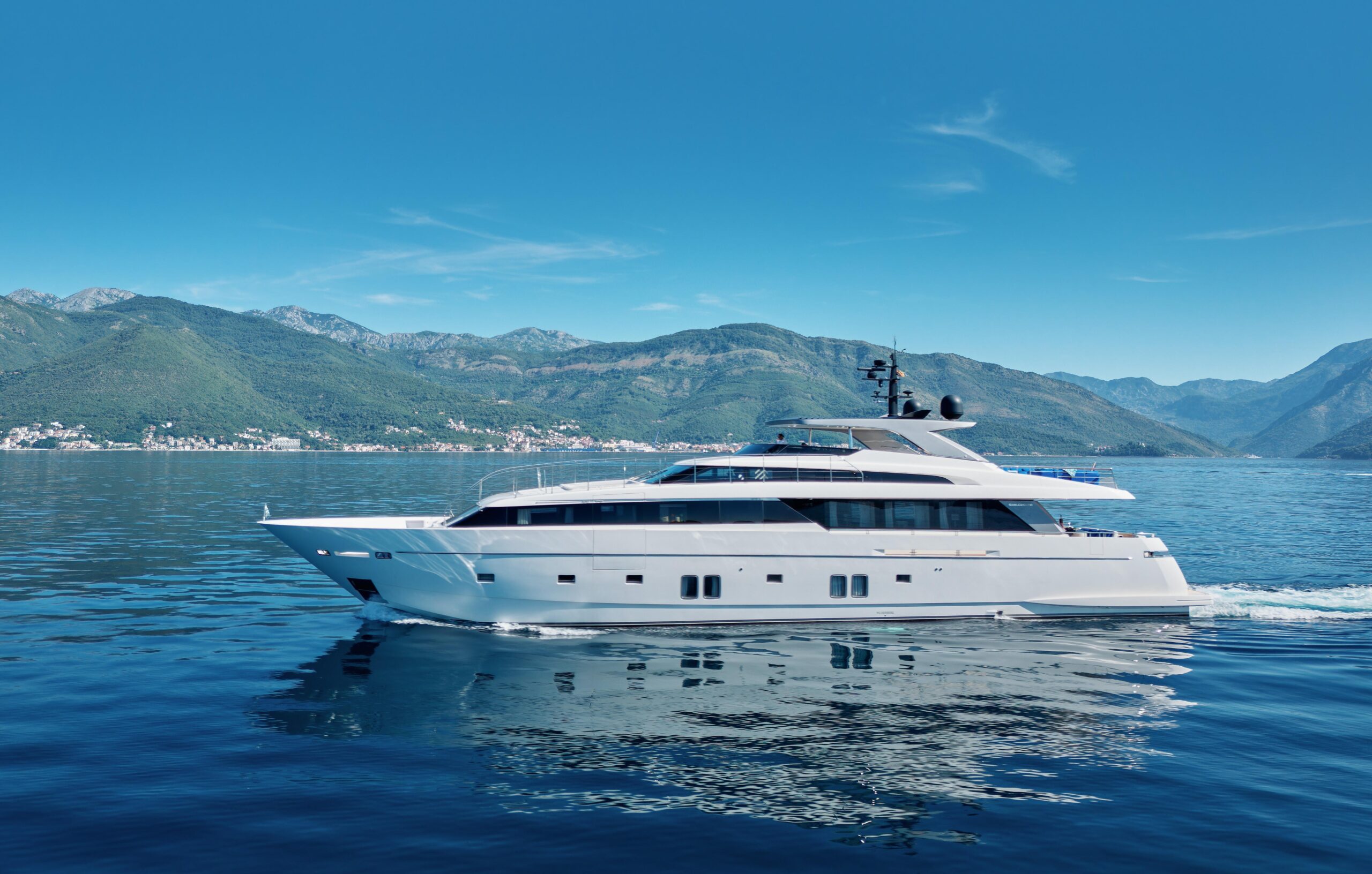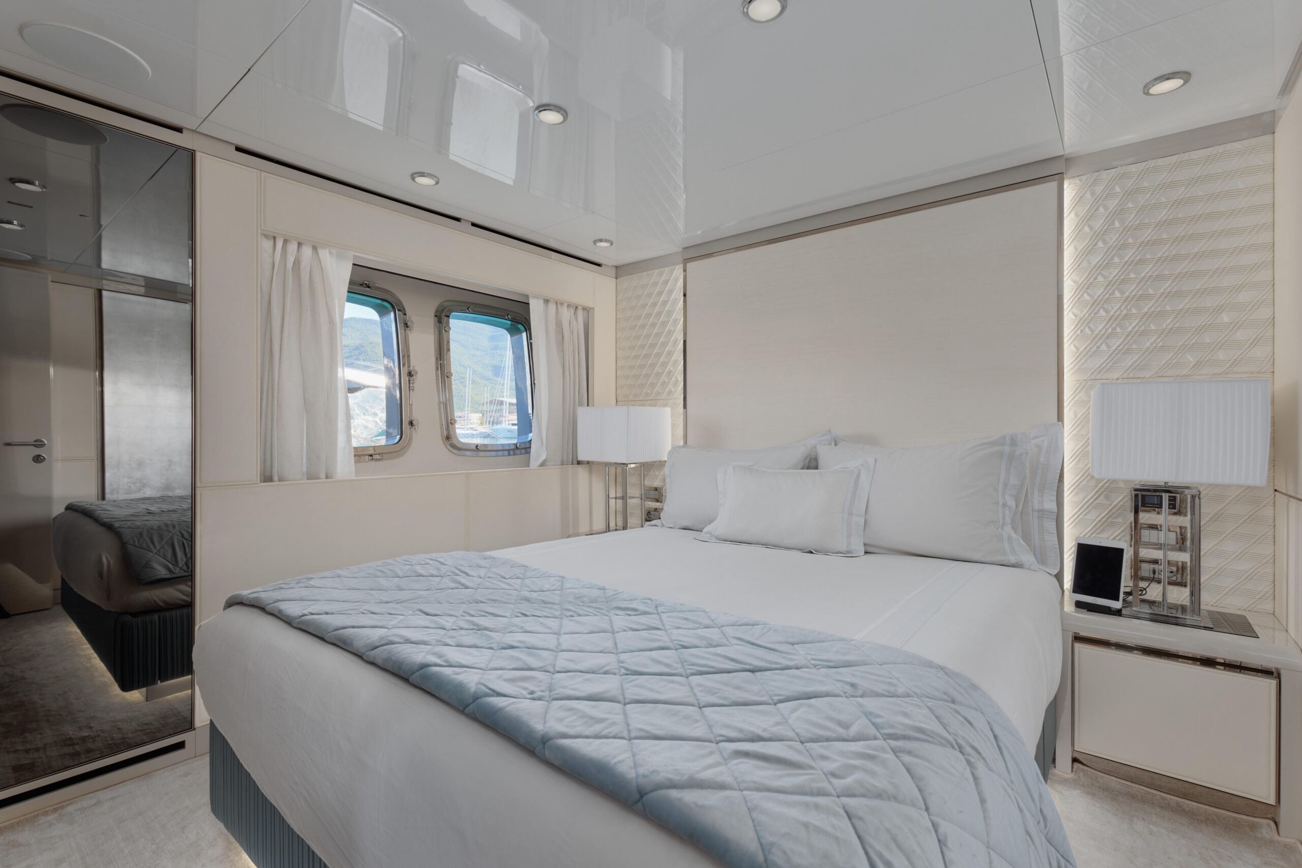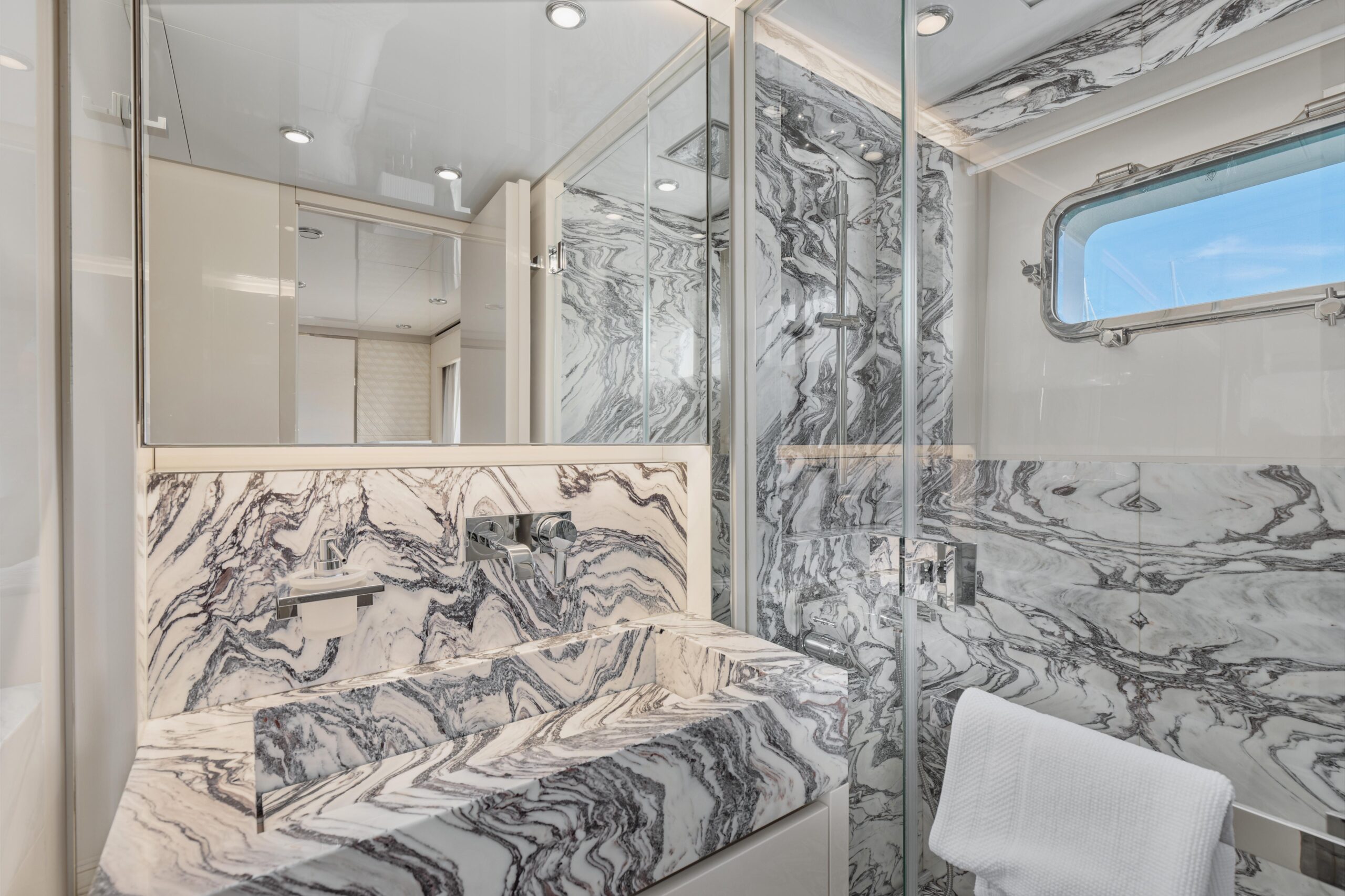 Оснащённая глиссирующим корпусом из стеклопластика (GRP), яхта сочетает высокую скорость и эффективность с роскошными жилыми пространствами. Просторный и изысканный интерьер разработан студией Visionnaire и выполнен в тёплых нейтральных тонах с акцентами из оникса и мрамора. Главный салон дополнен эффектным балконом, который наполняет пространство естественным светом и гармонично объединяет интерьер с открытыми зонами.