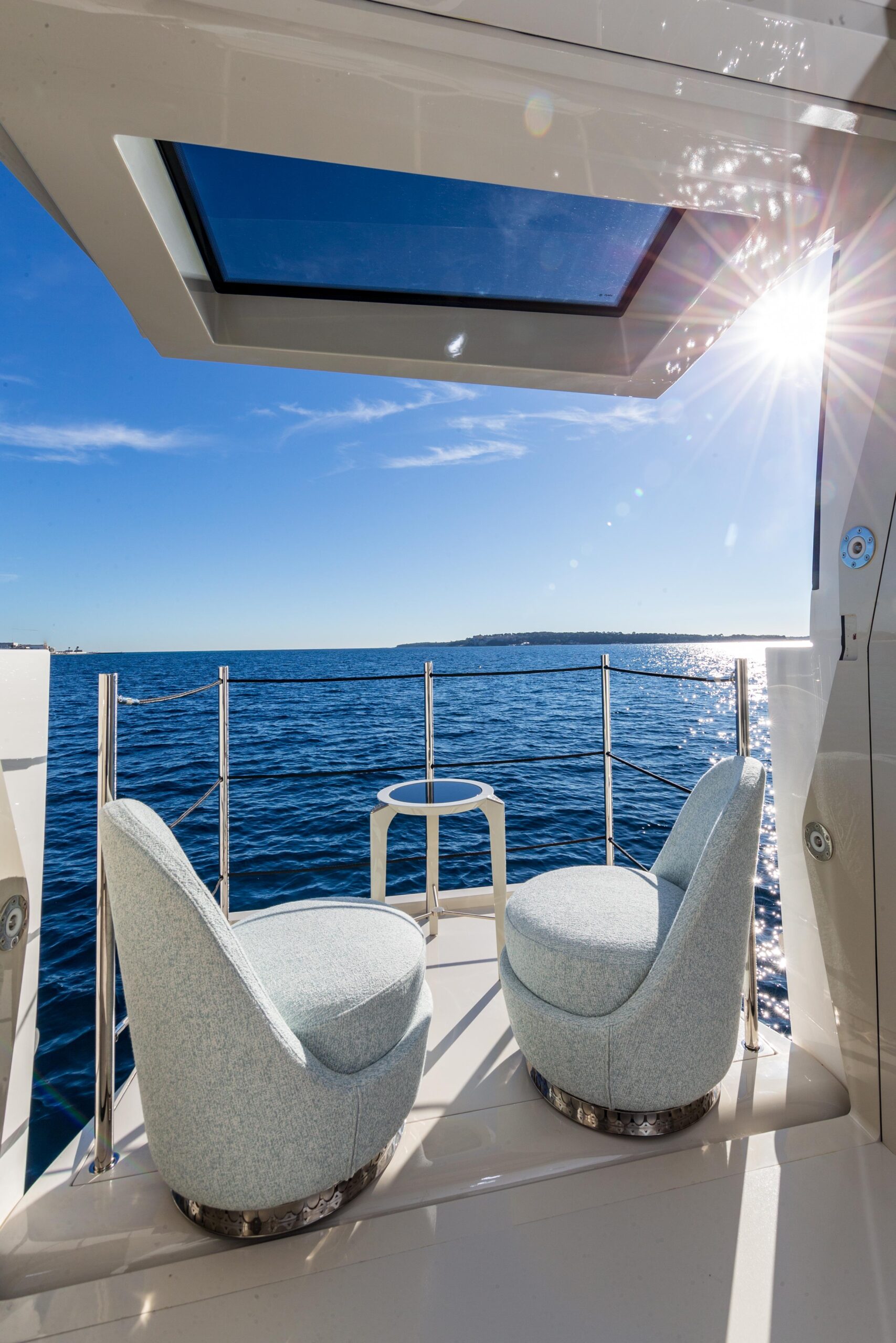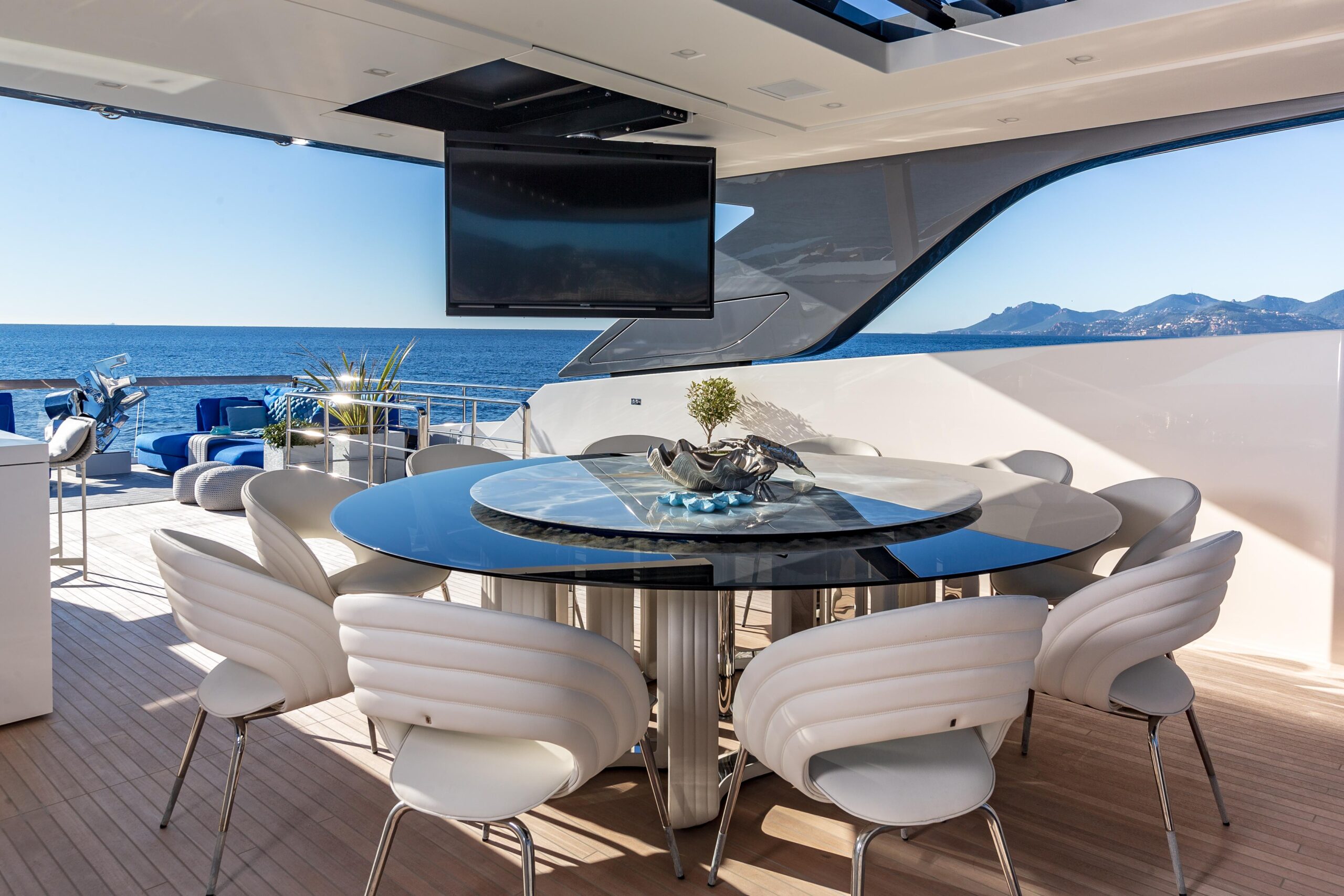 Внешние зоны включают просторную кормовую палубу для обедов на свежем воздухе, большую зону для загорания на носовой палубе с уникальной для этой SL118 конфигурацией сидений, а также индивидуально спроектированный флайбридж с баром и дополнительной обеденной зоной.