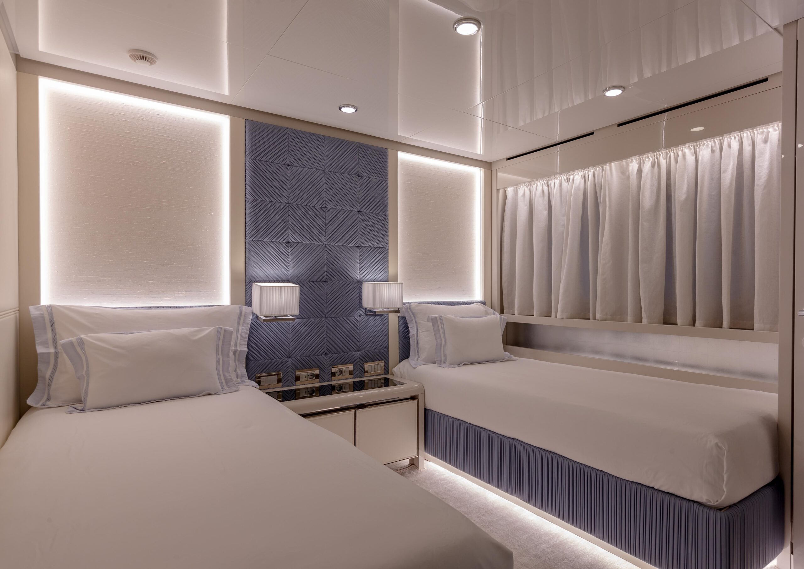 Яхта принимает до 10 гостей в пяти каютах с собственными ванными комнатами. На борту расположена полноширинная каюта владельца с балконами по левому и правому борту, две VIP-каюты, одна каюта с раздельными кроватями и одна трансформируемая каюта (двухместная / детская / медиа-комната). Отдельные каюты экипажа рассчитаны на размещение до пяти человек.