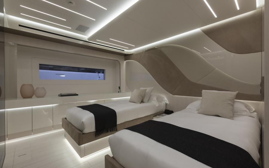 Для размещения гостей яхта предлагает несколько роскошных кают, включая просторную мастер-каюту, каждая из которых оборудована собственной ванной комнатой и обеспечивает максимальный уровень уединения и комфорта. Каюты экипажа также выполнены на высоком уровне, что позволяет обеспечить безупречный сервис на борту.