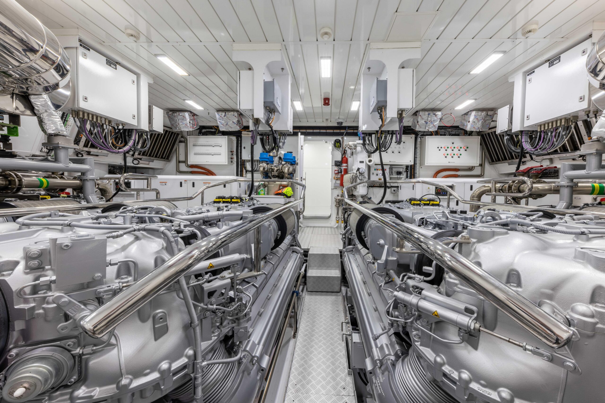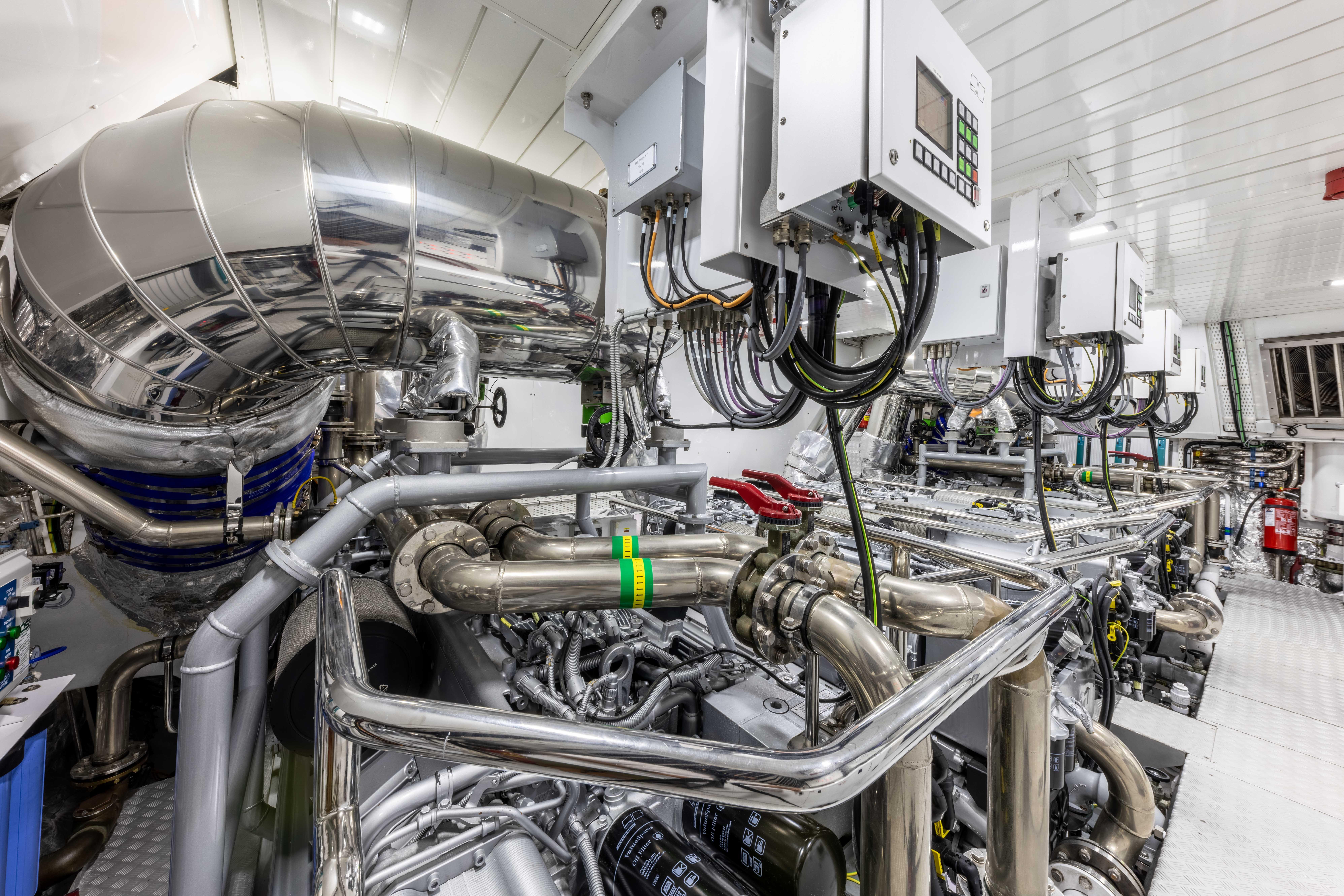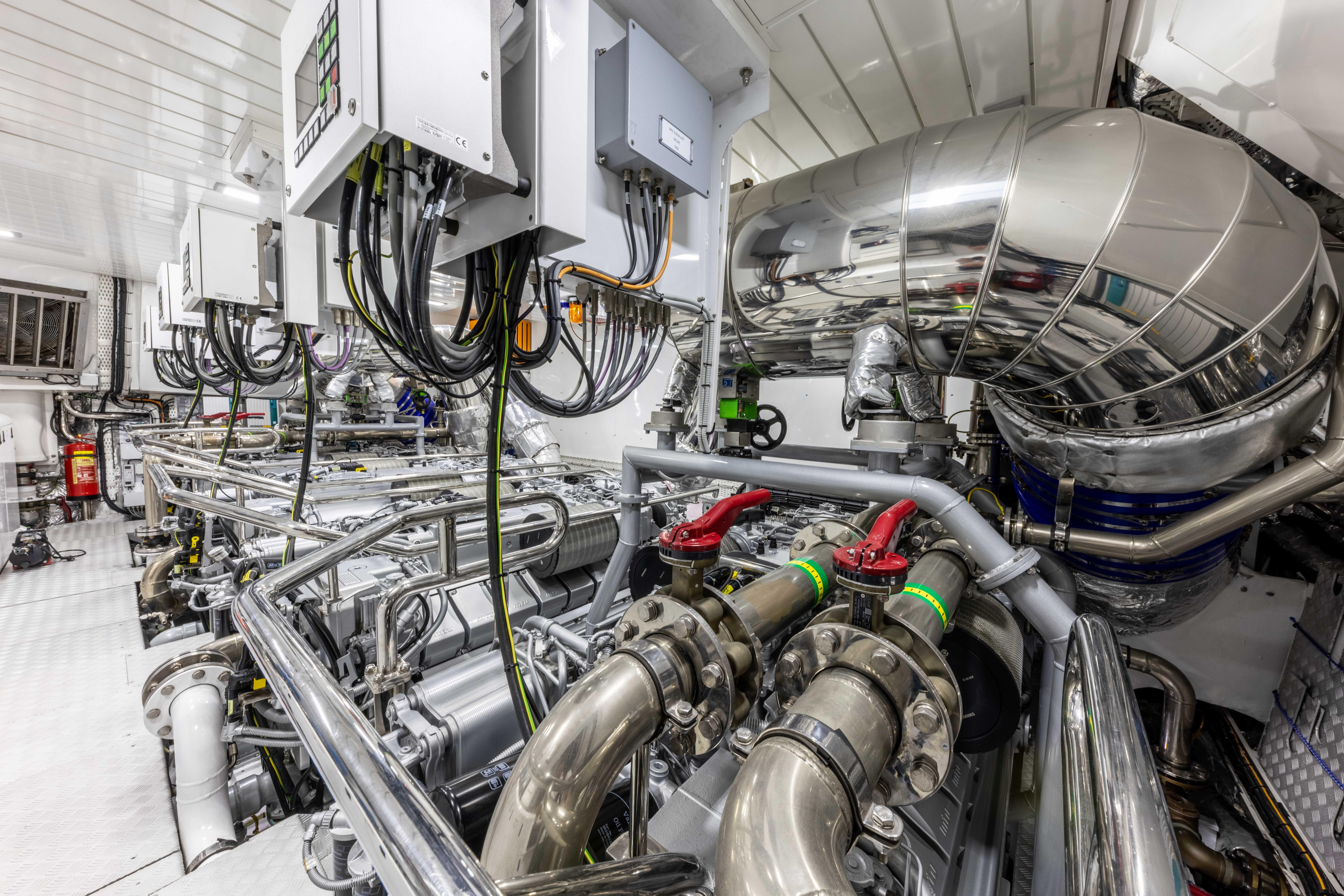 Оснащённая четырьмя двигателями MTU Rolls-Royce мощностью по 2 600 л.с. и четырьмя водомётами Kongsberg-Kamewa, яхта развивает максимальную скорость до 34 узлов. Верфь Overmarine сделала особый акцент на топливной эффективности, снизив расход и при этом сохранив высокую скорость — сокращение потребления составило около 30% по сравнению с предыдущей серией. Благодаря гироскопическим стабилизаторам Veem яхта отличается плавным и тихим ходом, обеспечивая минимальные вибрации и уровень шума как на якоре, так и на ходу. Особенно эффективны стабилизаторы на скоростях 10–12 узлов, превосходя по комфорту суда сопоставимого размера с водоизмещающим корпусом.