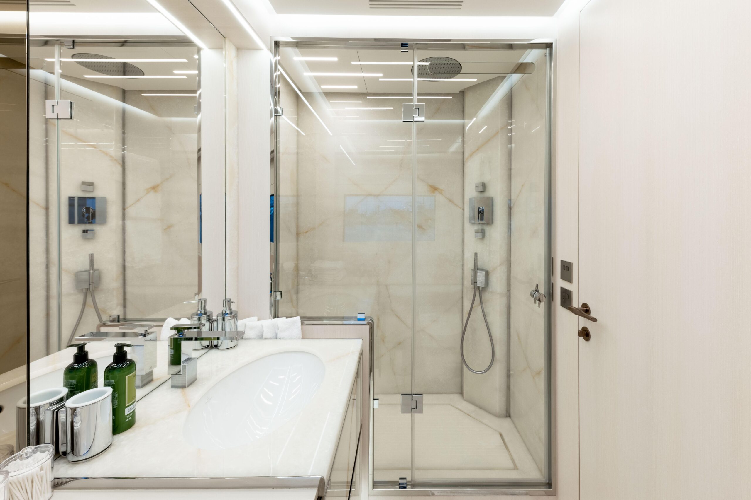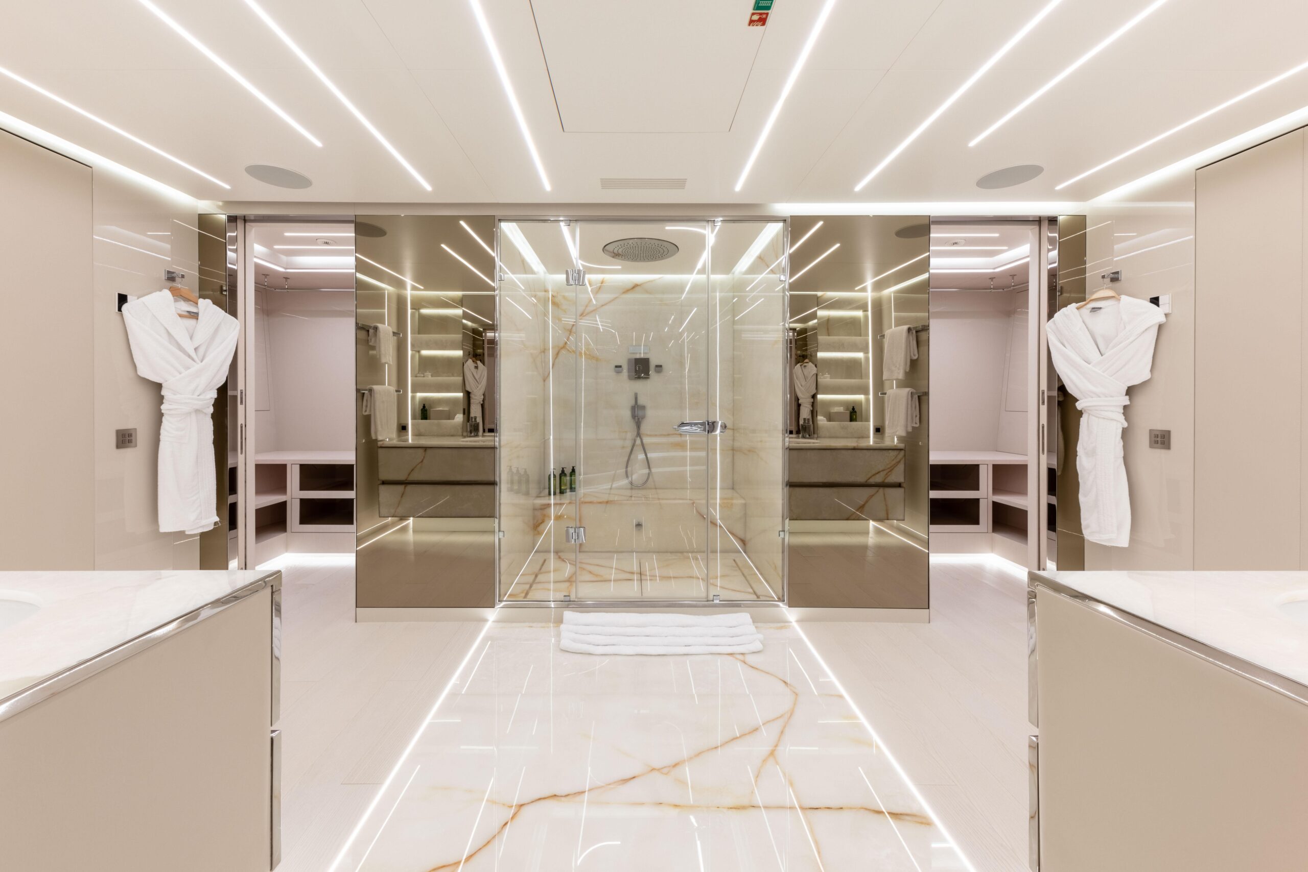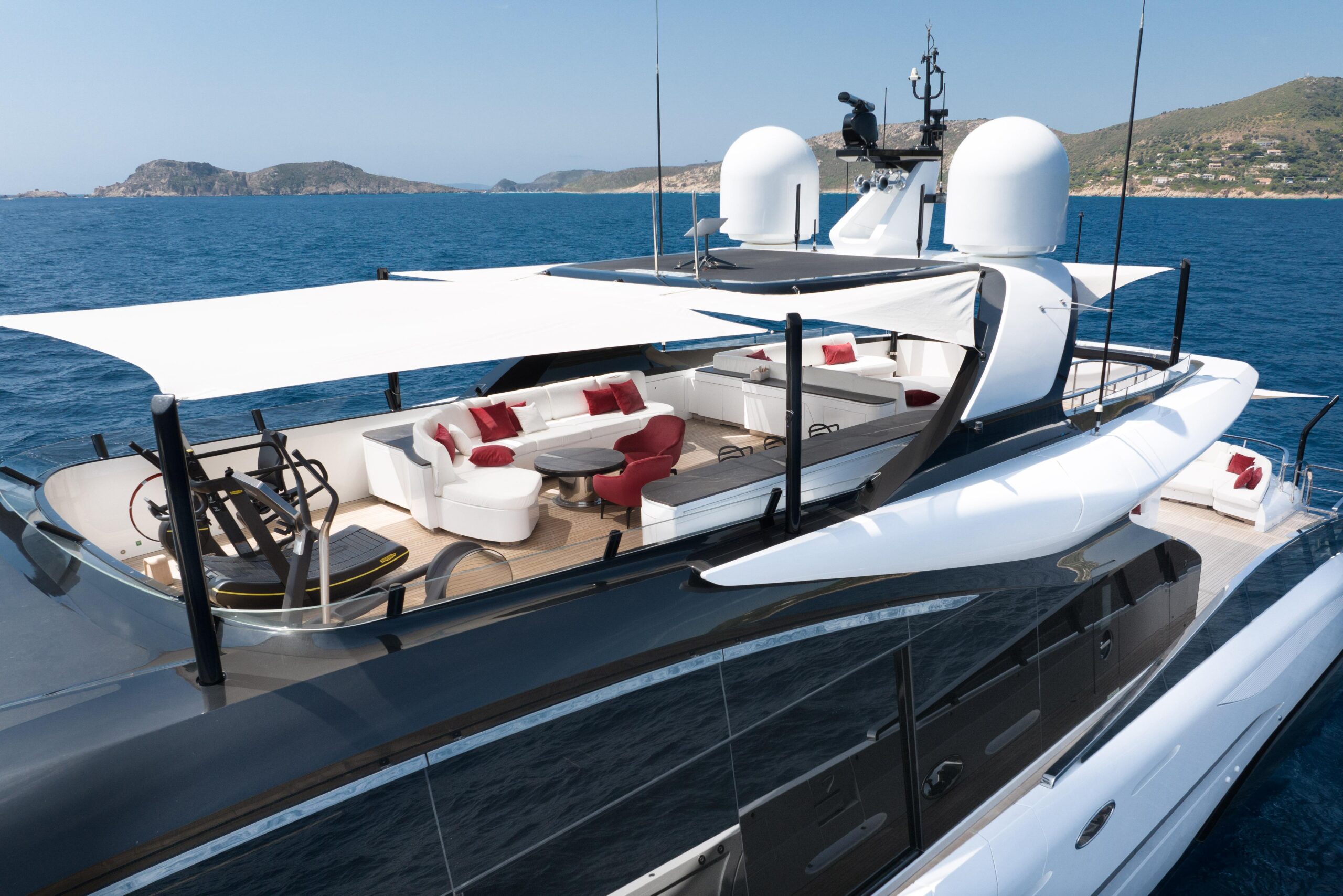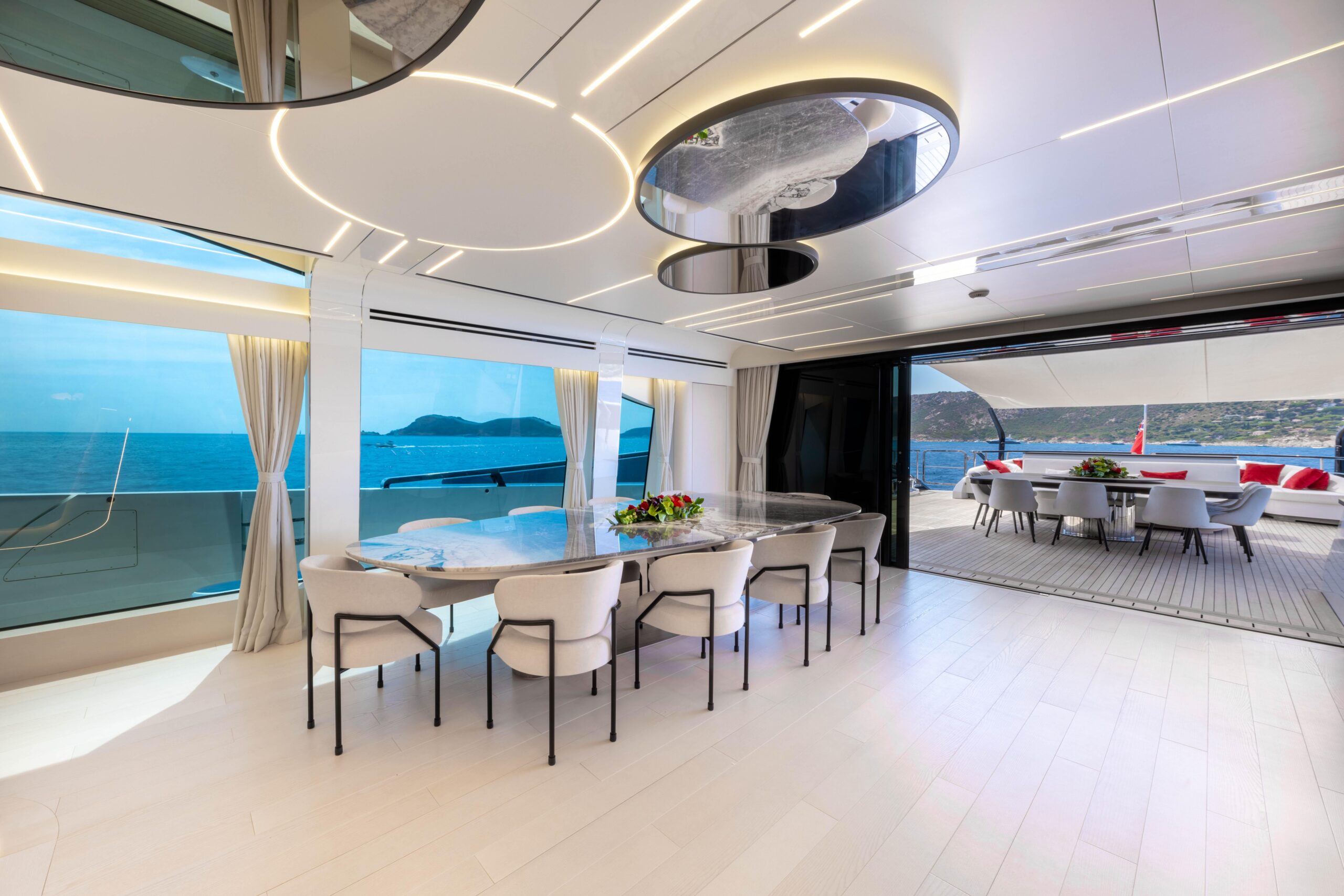 Mangusta 165 REV органично объединяет внутренние и внешние пространства, предлагая обширные палубы для общения и отдыха при сохранении приватности гостей. Инновационный beach club позволяет полностью погрузиться в окружающую морскую среду и оснащён шезлонгами и диванами. Инфинити-бассейн визуально сливается с морем, создавая гармоничную связь между яхтой и океаном. Солнечная терраса площадью 69 кв. м оборудована баром и комфортной зоной отдыха.
