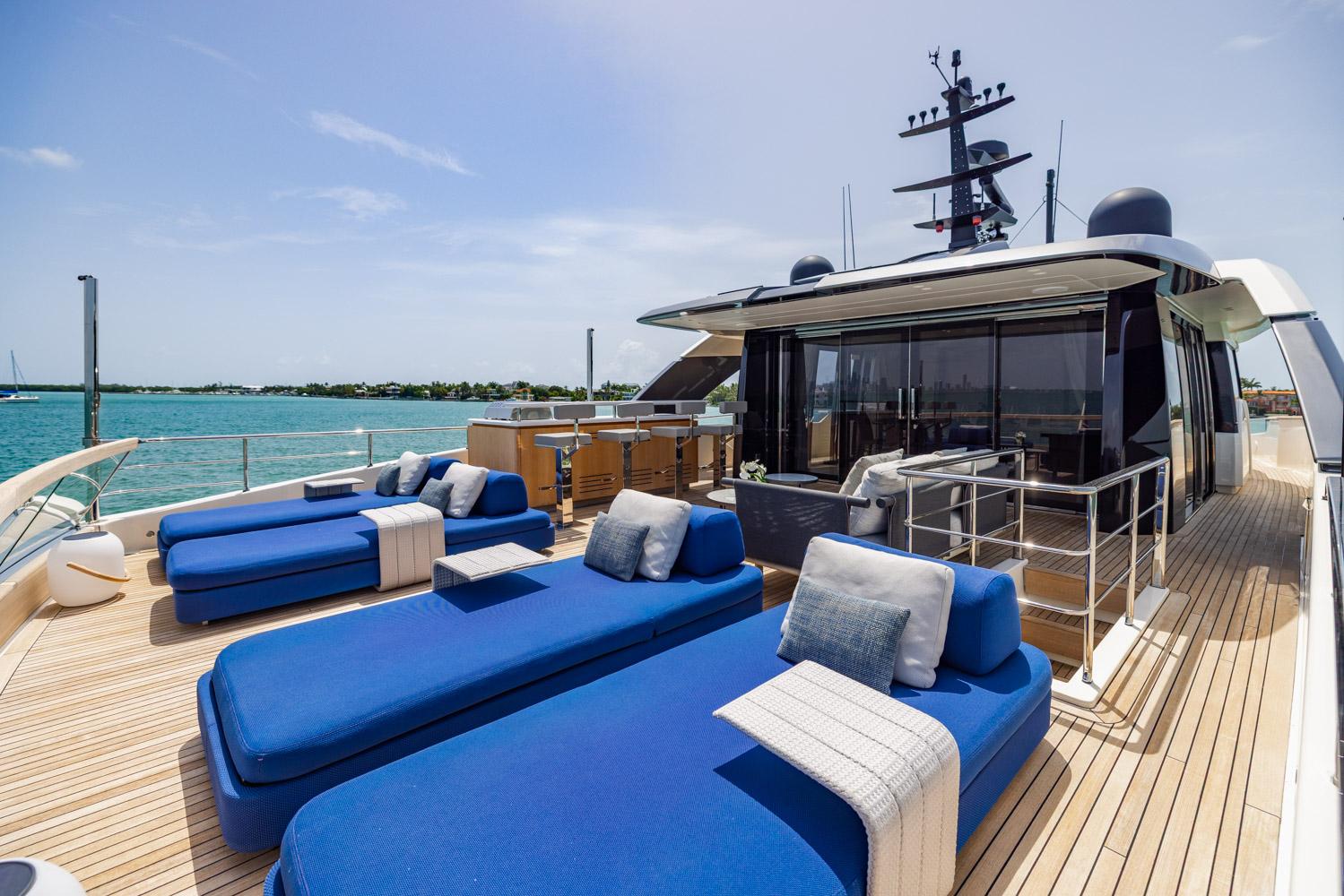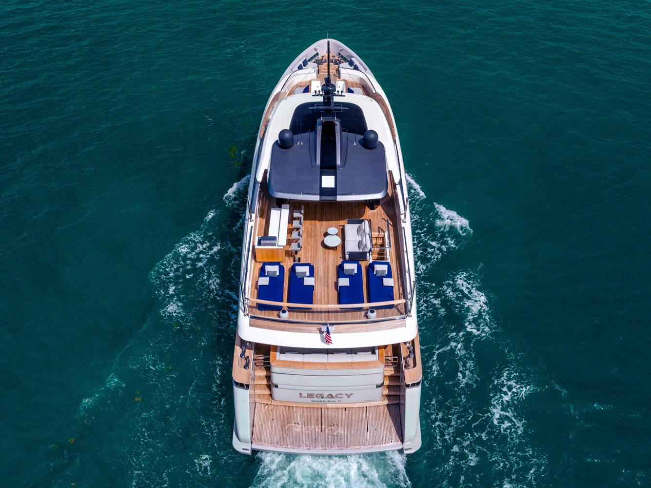 При длине более 29 метров LEGACY предлагает обширные открытые пространства, созданные для полноценного яхтенного образа жизни. На борту — просторные солнечные палубы, большой флайбридж с обеденной зоной на верхней палубе для приёма гостей на свежем воздухе, а также купальная платформа, располагающая к беззаботному отдыху. Дополняет роскошь джакузи на носу, создающее эксклюзивное место для релаксации с панорамными видами на океан.