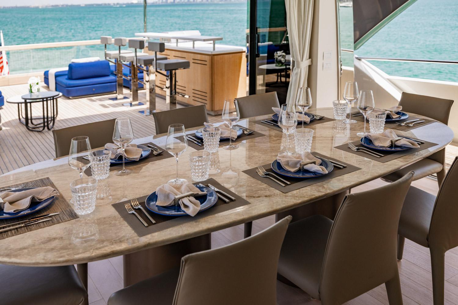 Кормовой кокпит: 2× стол с электроприводом hi/low и сдвижными столешницами, 6× кресел Dedon “Seax”