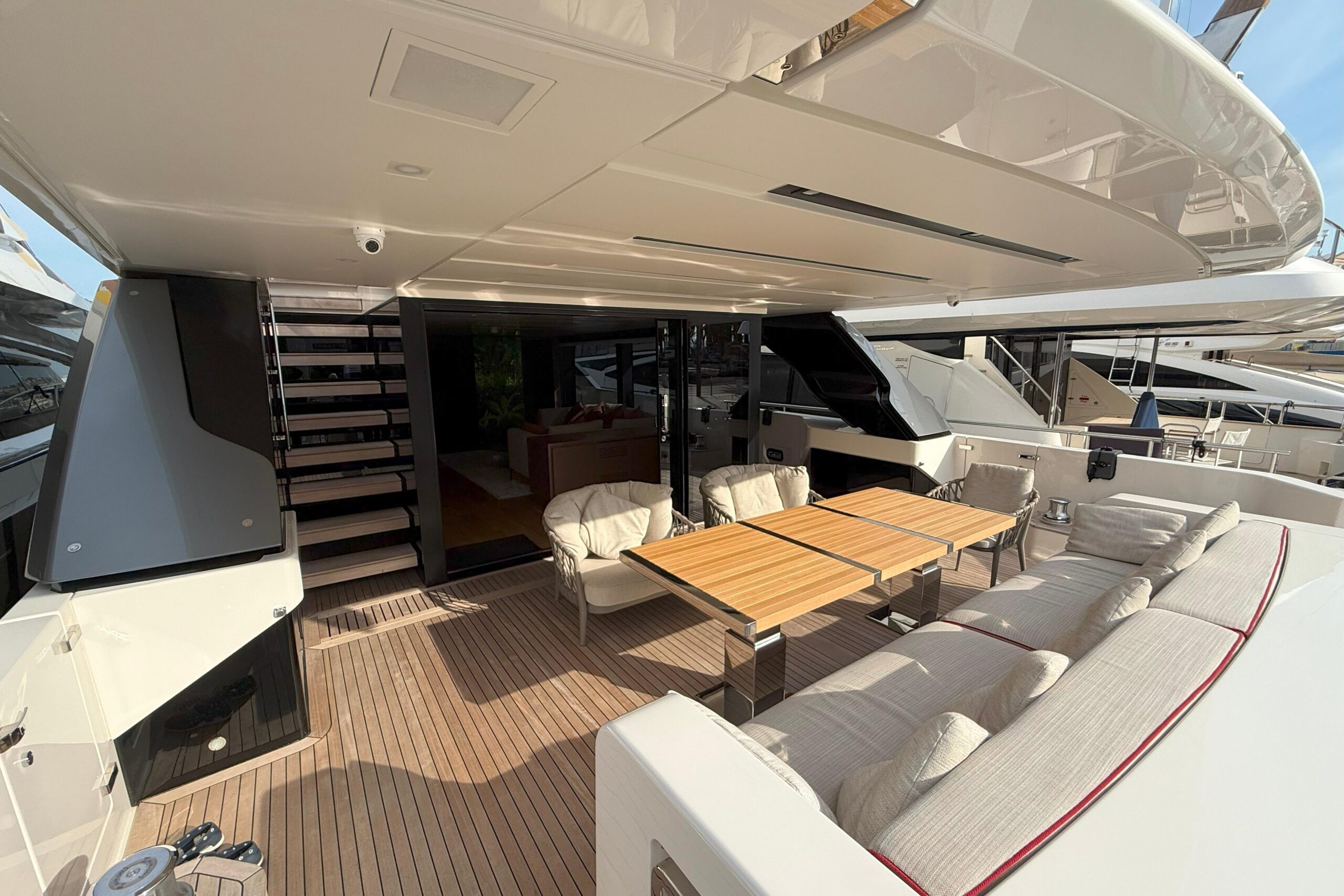 : Просторный флайбридж с индивидуальной барной стойкой из Corian, Teppan Yaki и техникой Miele, солнцезащитными тентами и выделенными зонами для обедов и отдыха.