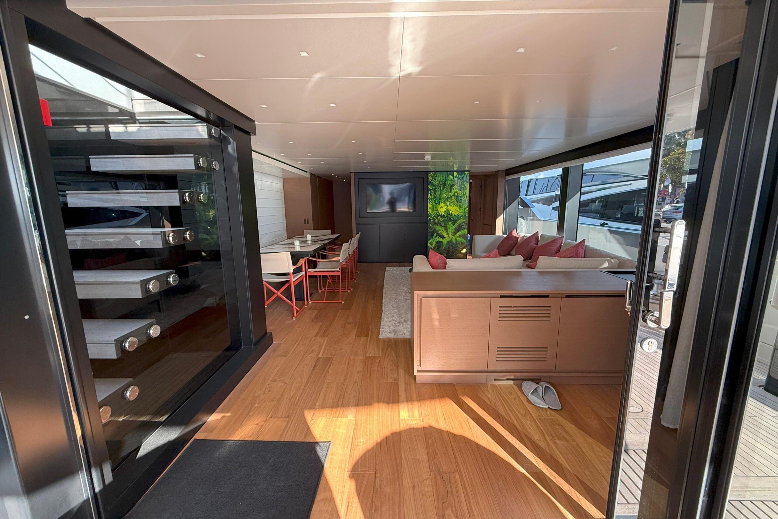 : Увеличенный внутренний объём и панорамные виды без прерываний благодаря инновационной асимметричной конфигурации главной палубы Sanlorenzo.