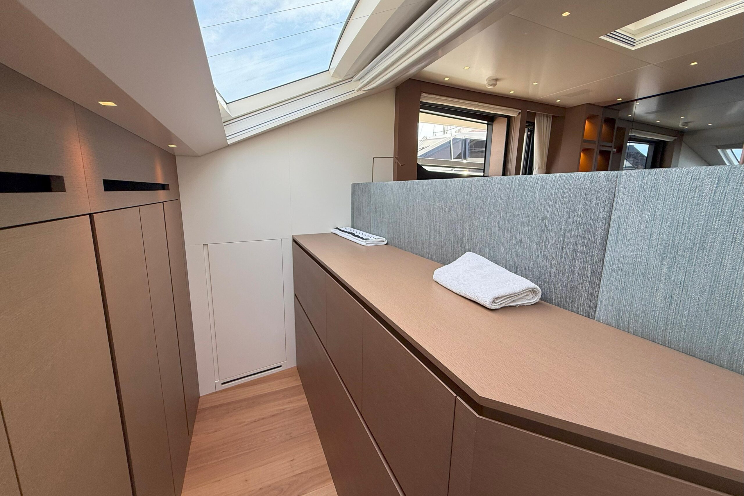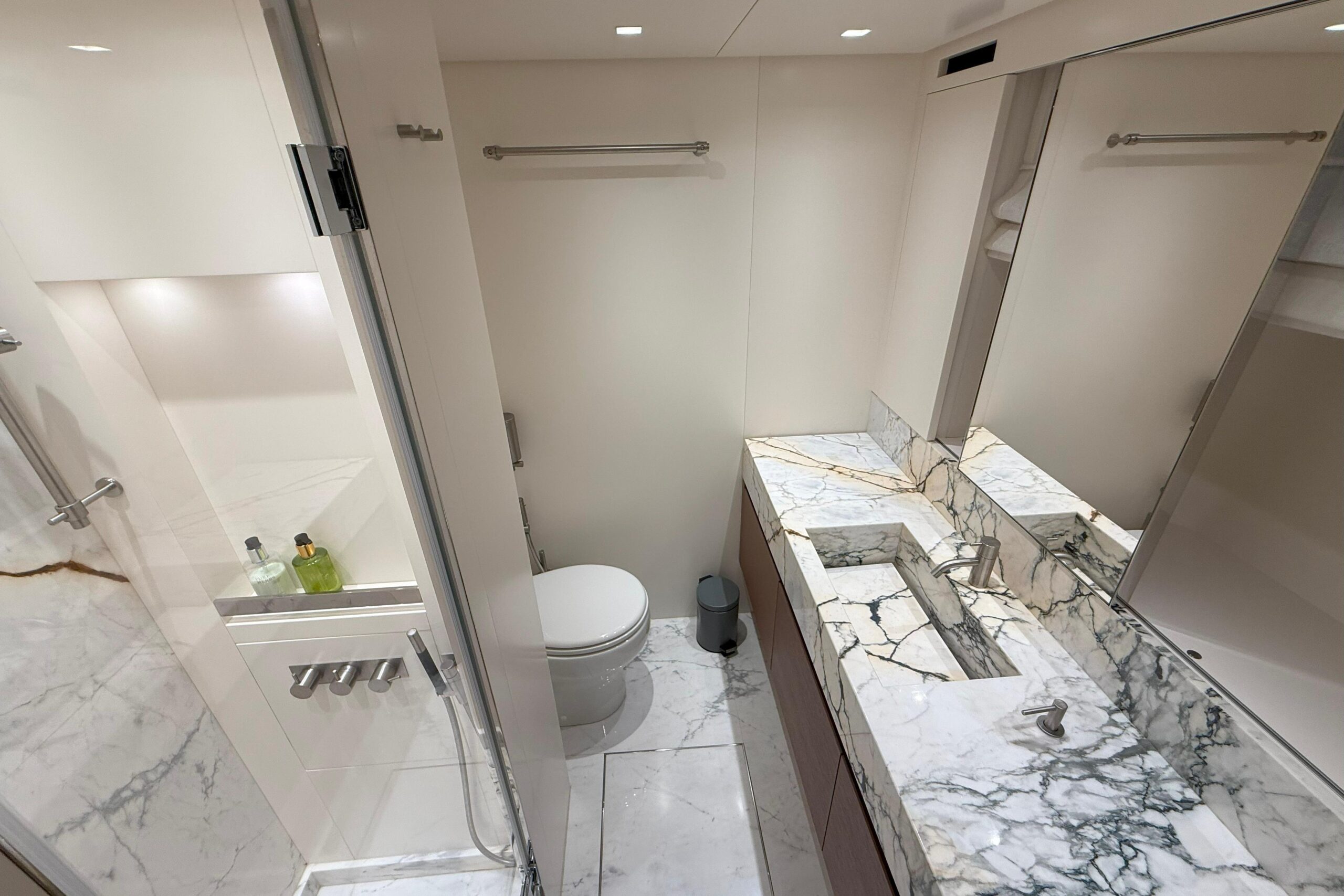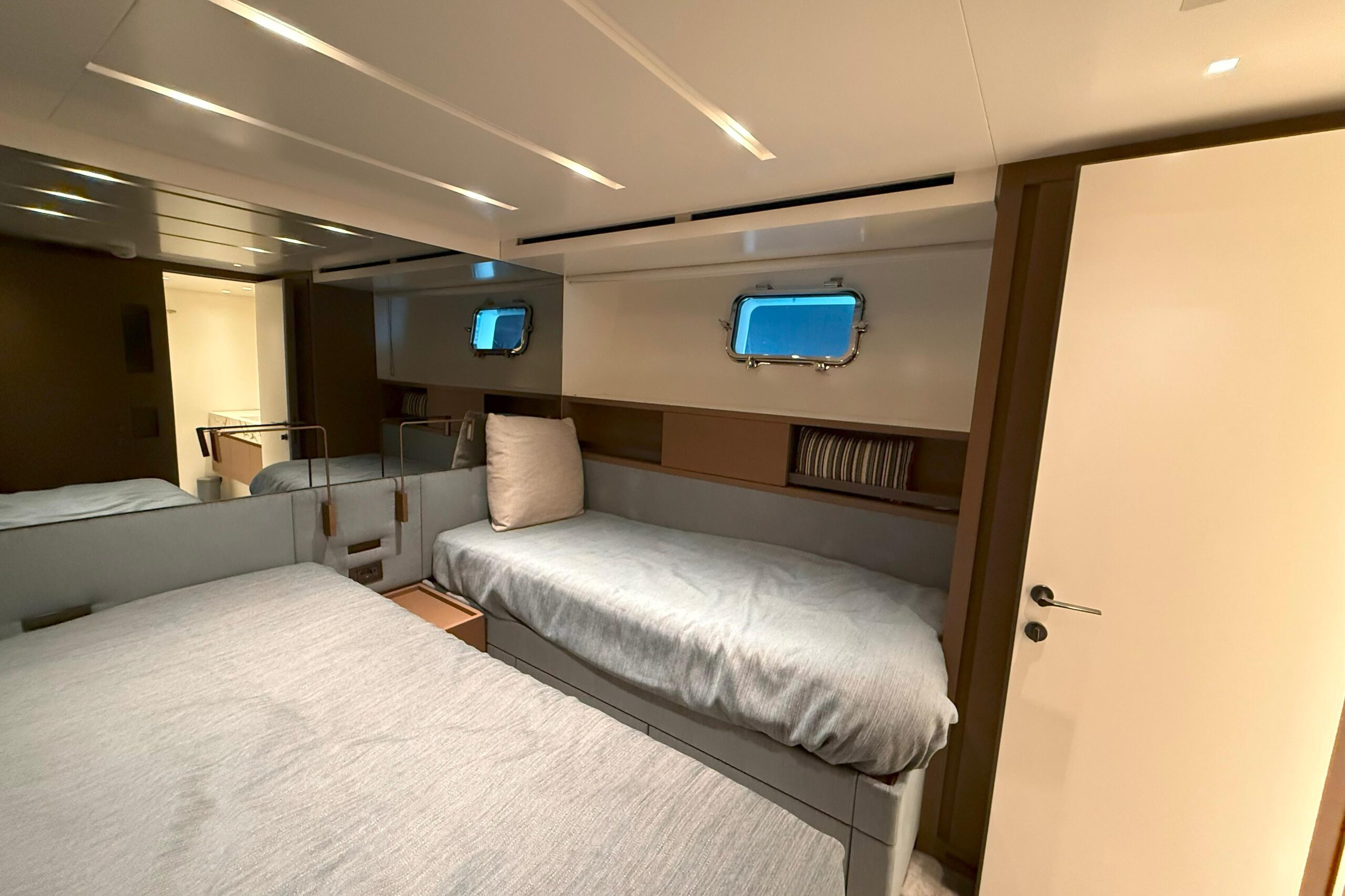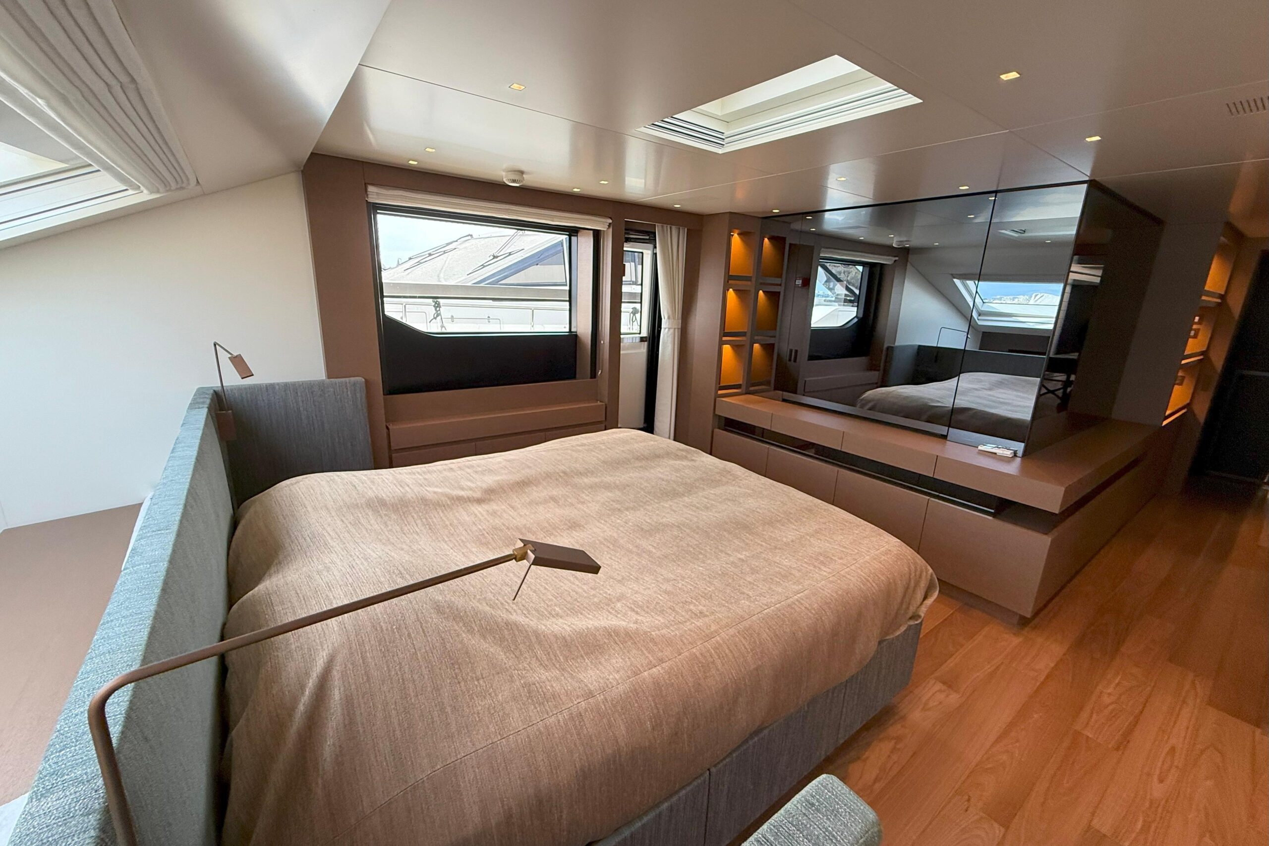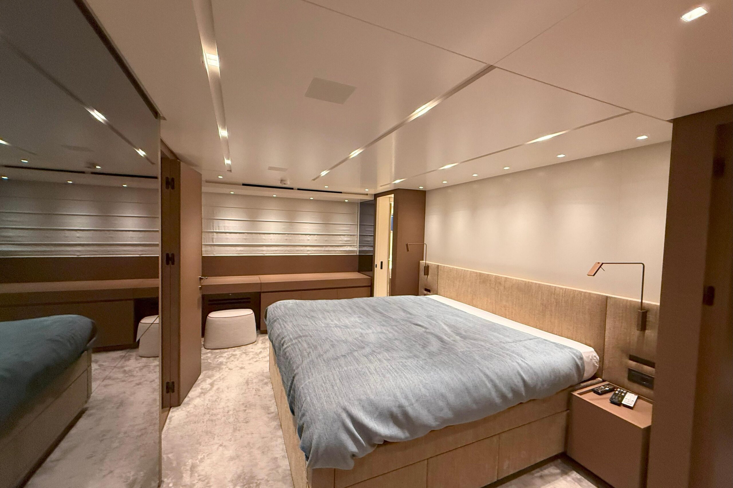 : Премиальная отделка, включая полированный мрамор Paonazzo в ванных комнатах, паркет Noce Americano и бронзовые светильники для чтения Viabizzuno во всех каютах.