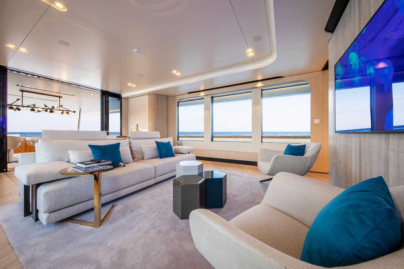 Яхта отличается панорамными окнами, высокими потолками, просторной лаунж-зоной (lanai) и формальной обеденной зоной, создающими уютную и элегантную атмосферу. Она рассчитана на размещение до 10 гостей и включает две мастер-каюты владельца, VIP-каюты и семейно-ориентированные жилые пространства.