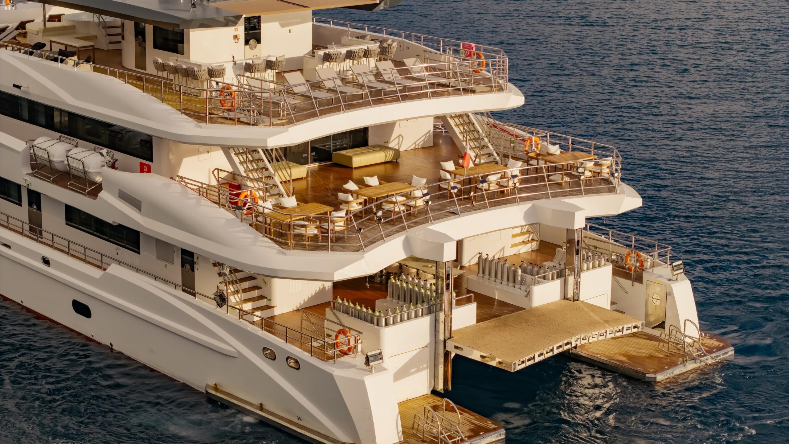 Эти платформы соединены гидравлической подъёмной платформой грузоподъёмностью 3 000 кг, используемой для спуска и подъёма тендеров и игрушек, а на якоре она превращается в просторный пляжный клуб.