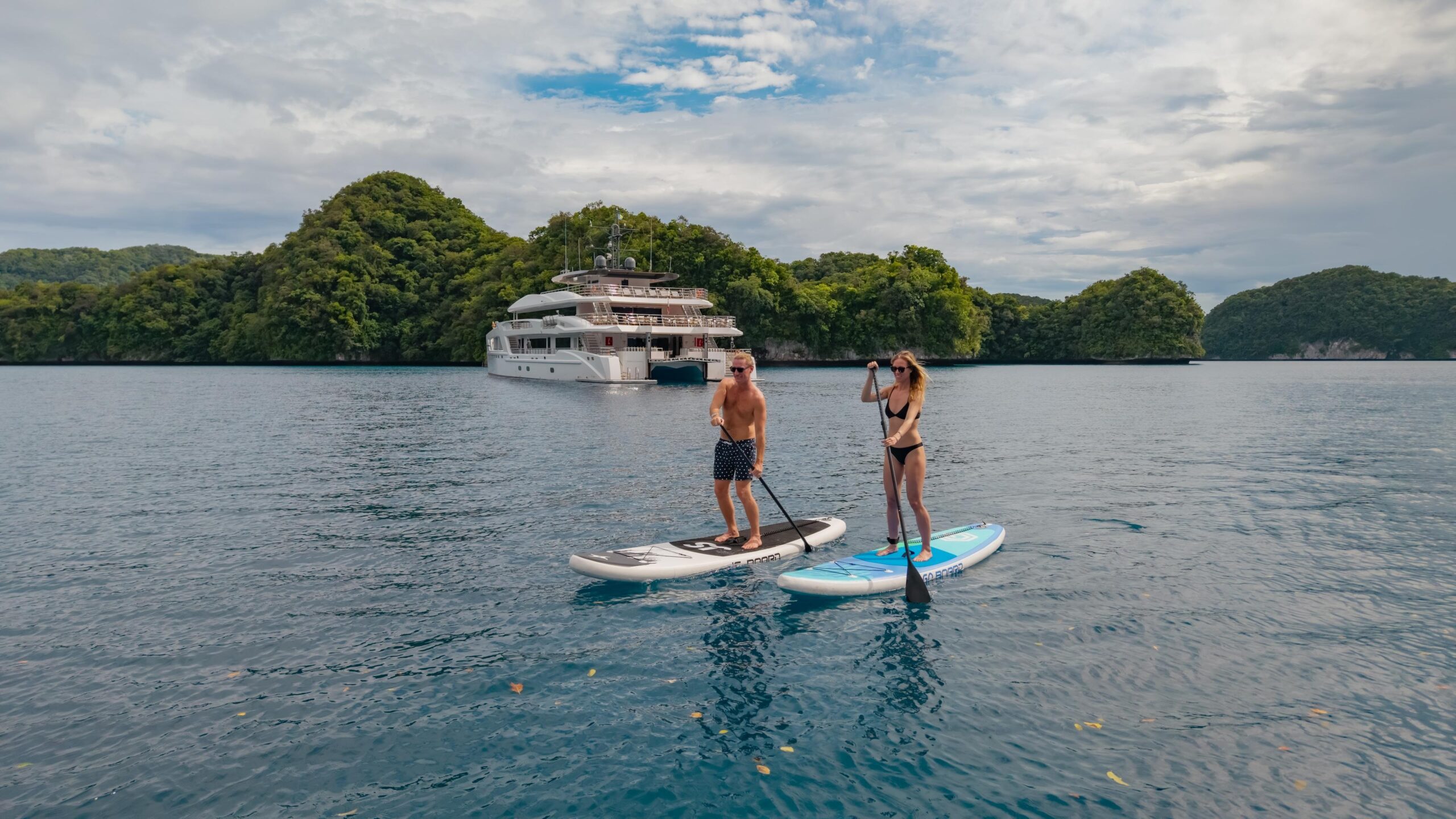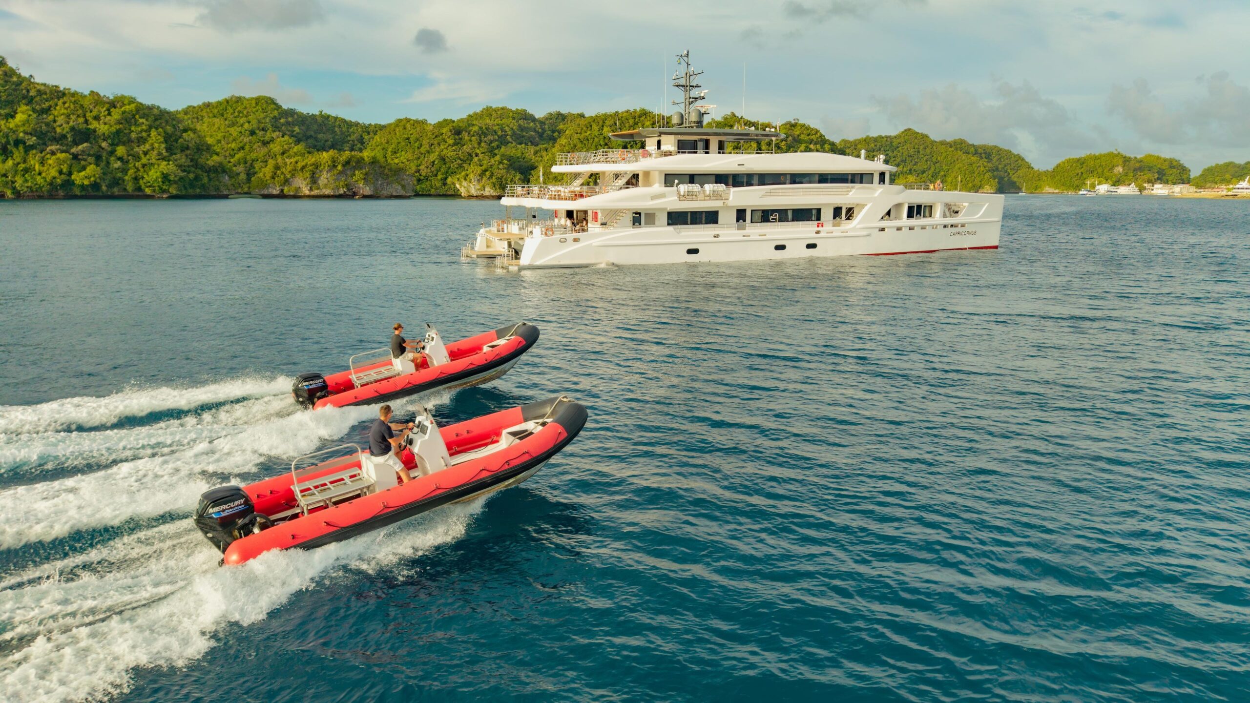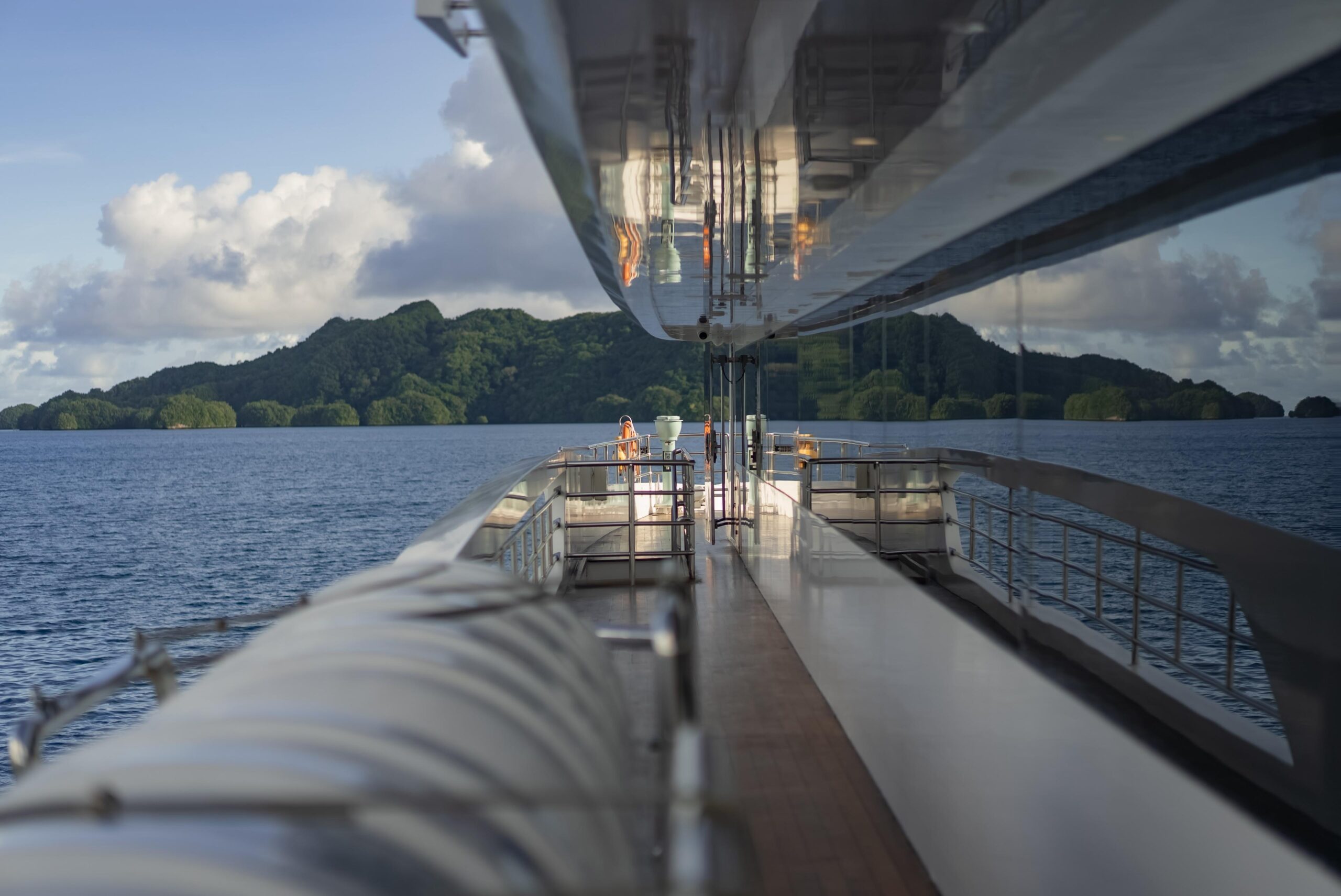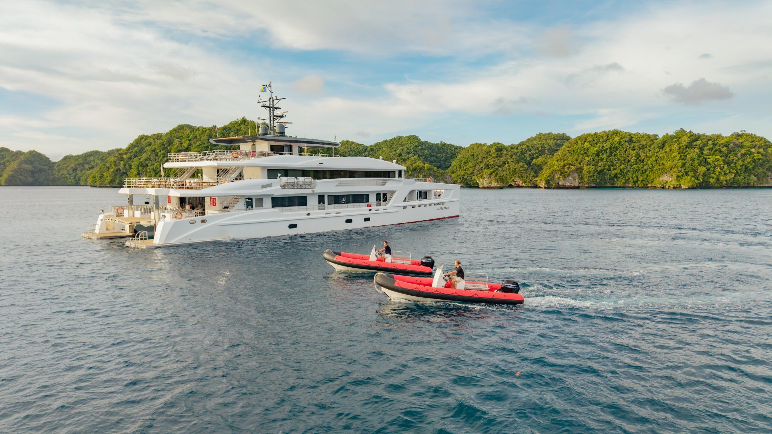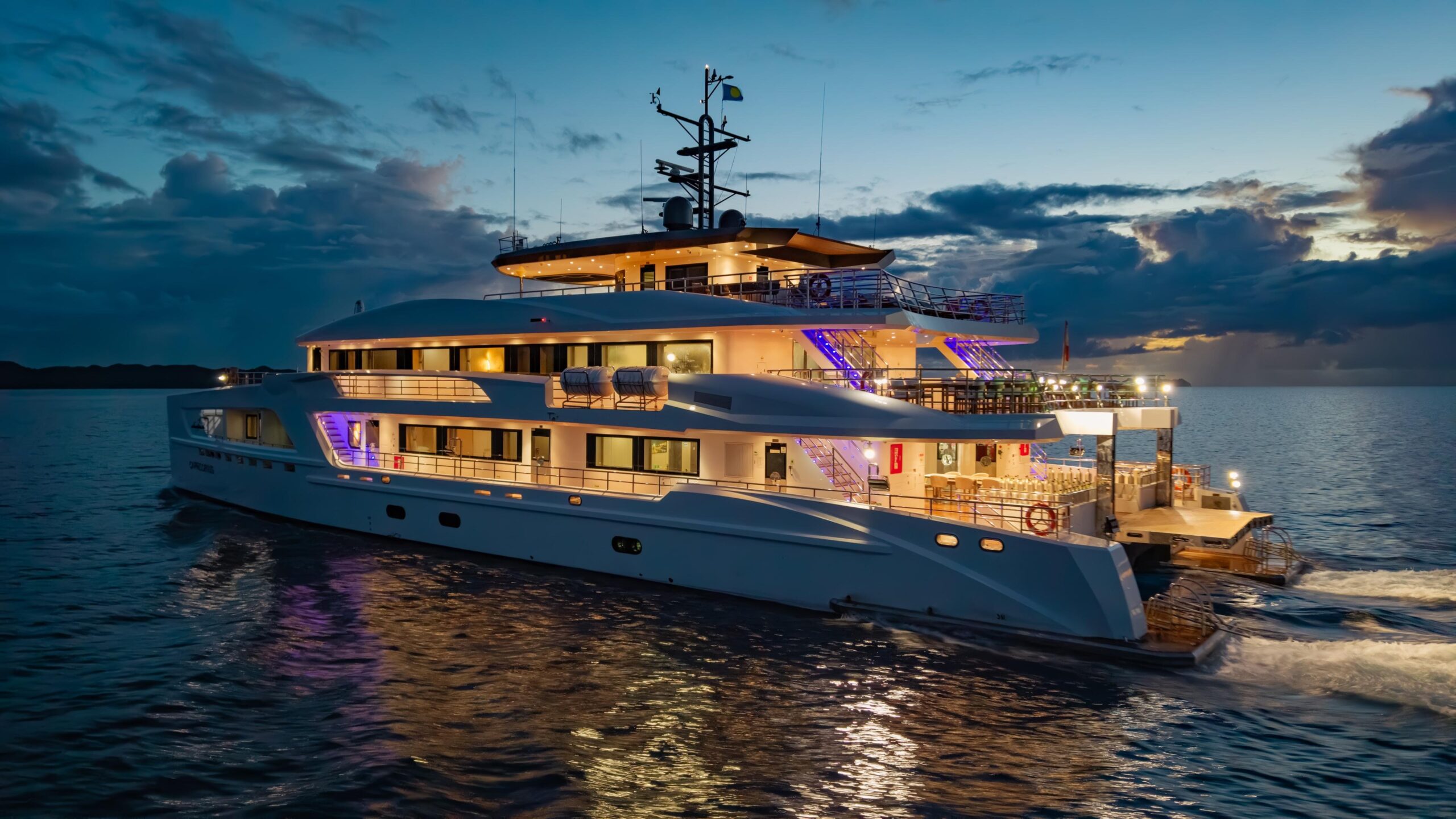 Как трёхпалубный многокорпусник, она может похвастаться валовой вместимостью 900 GT и общей площадью внешних тиковых палуб 600 квадратных метров. При этом её осадка при полной загрузке составляет всего 2,51 метра, что идеально демонстрирует преимущества многокорпусного плавания — исключительную устойчивость и эффективность, а также возможность заходить в мелководные бухты и удалённые якорные стоянки, о которых яхты такого объёма могут только мечтать.
