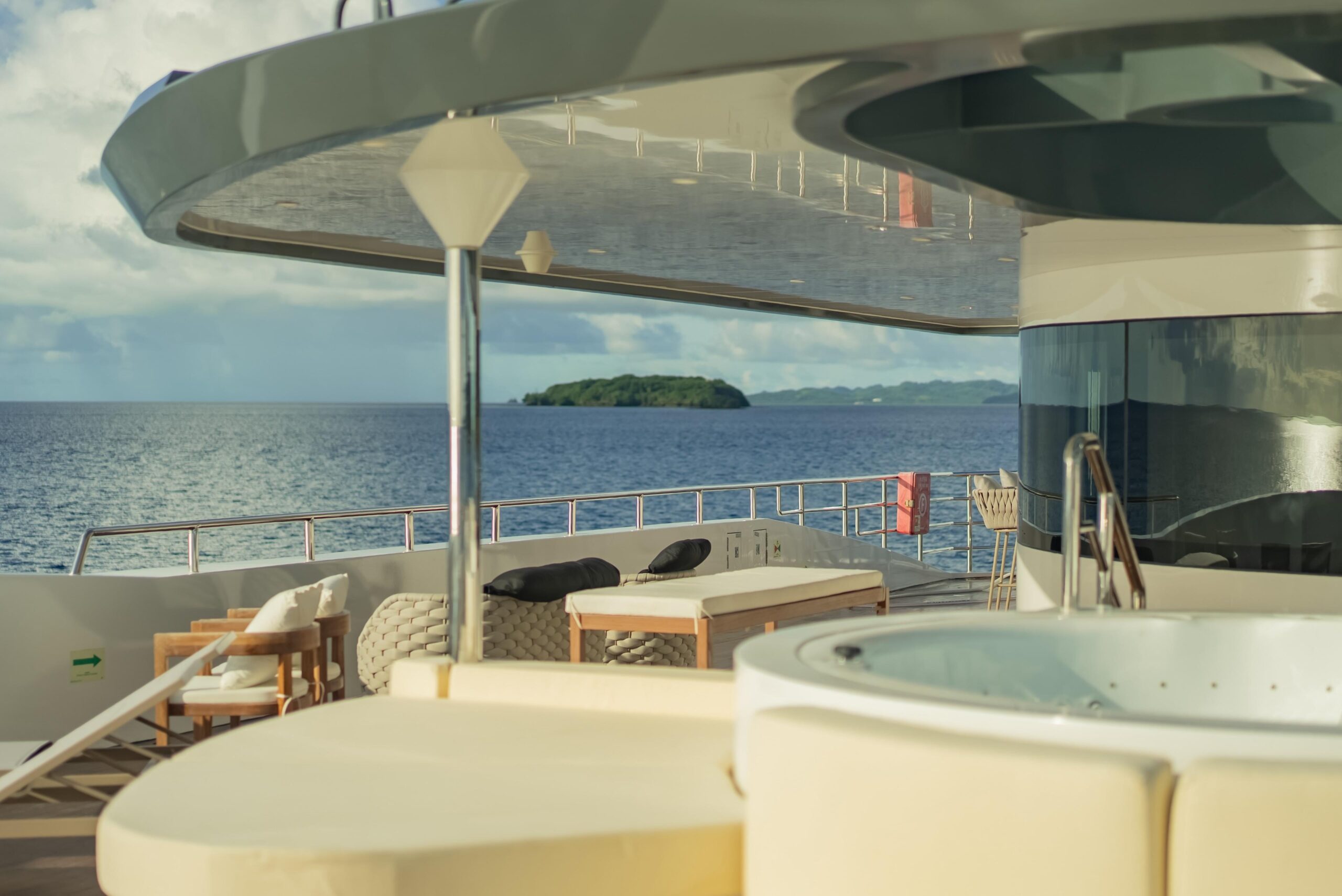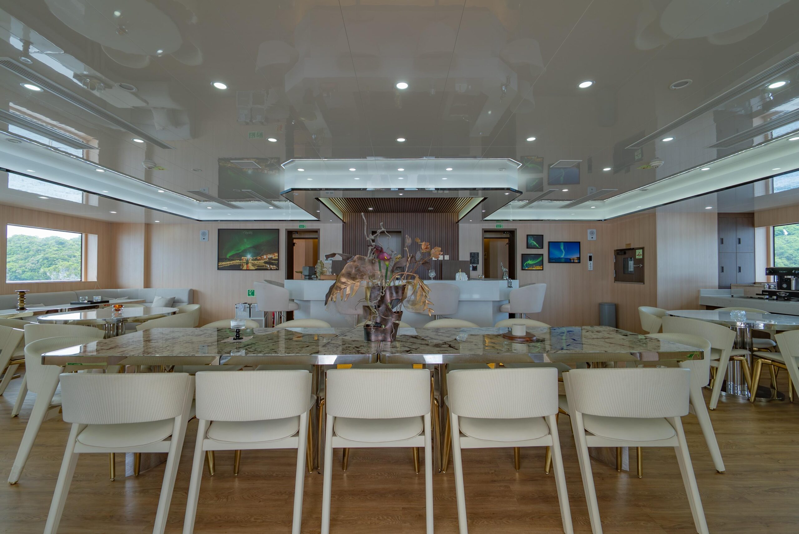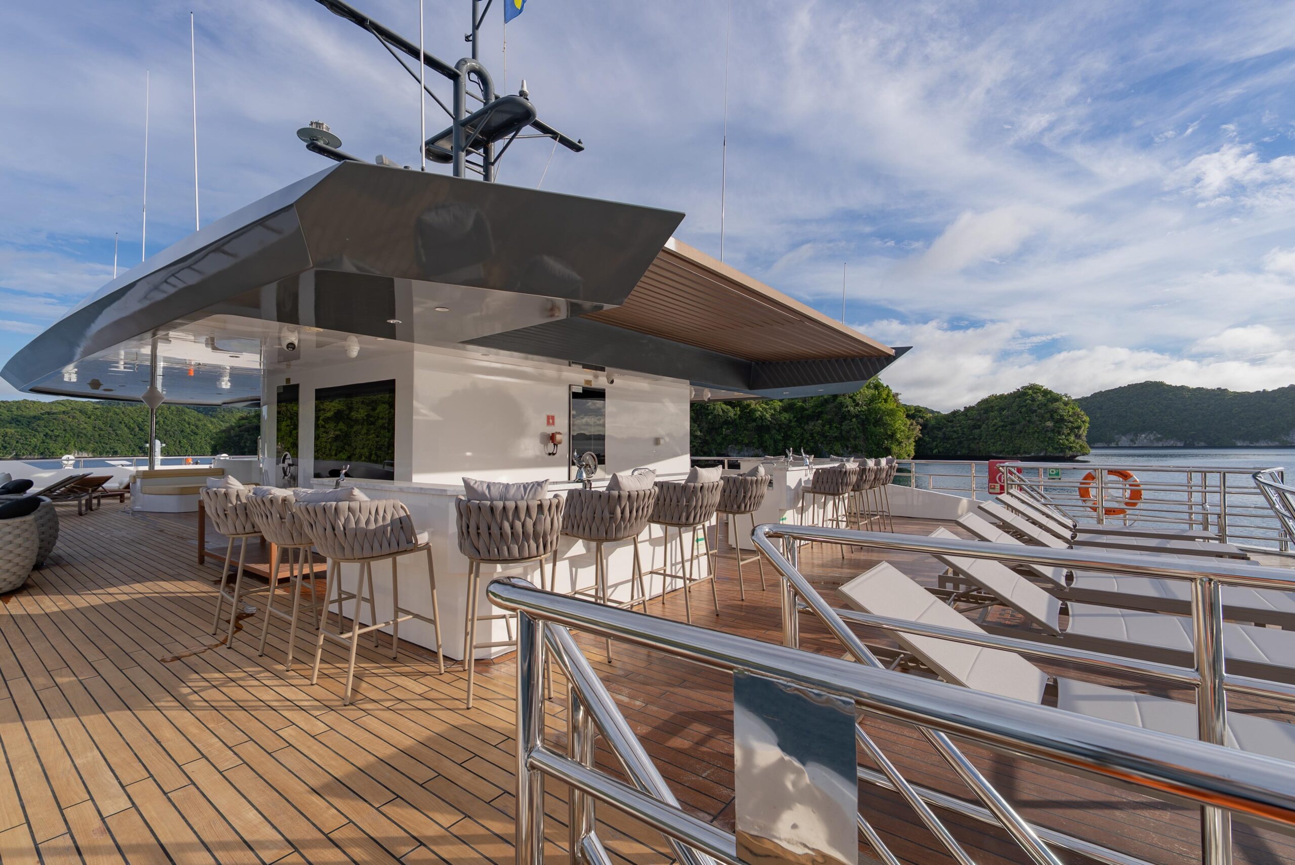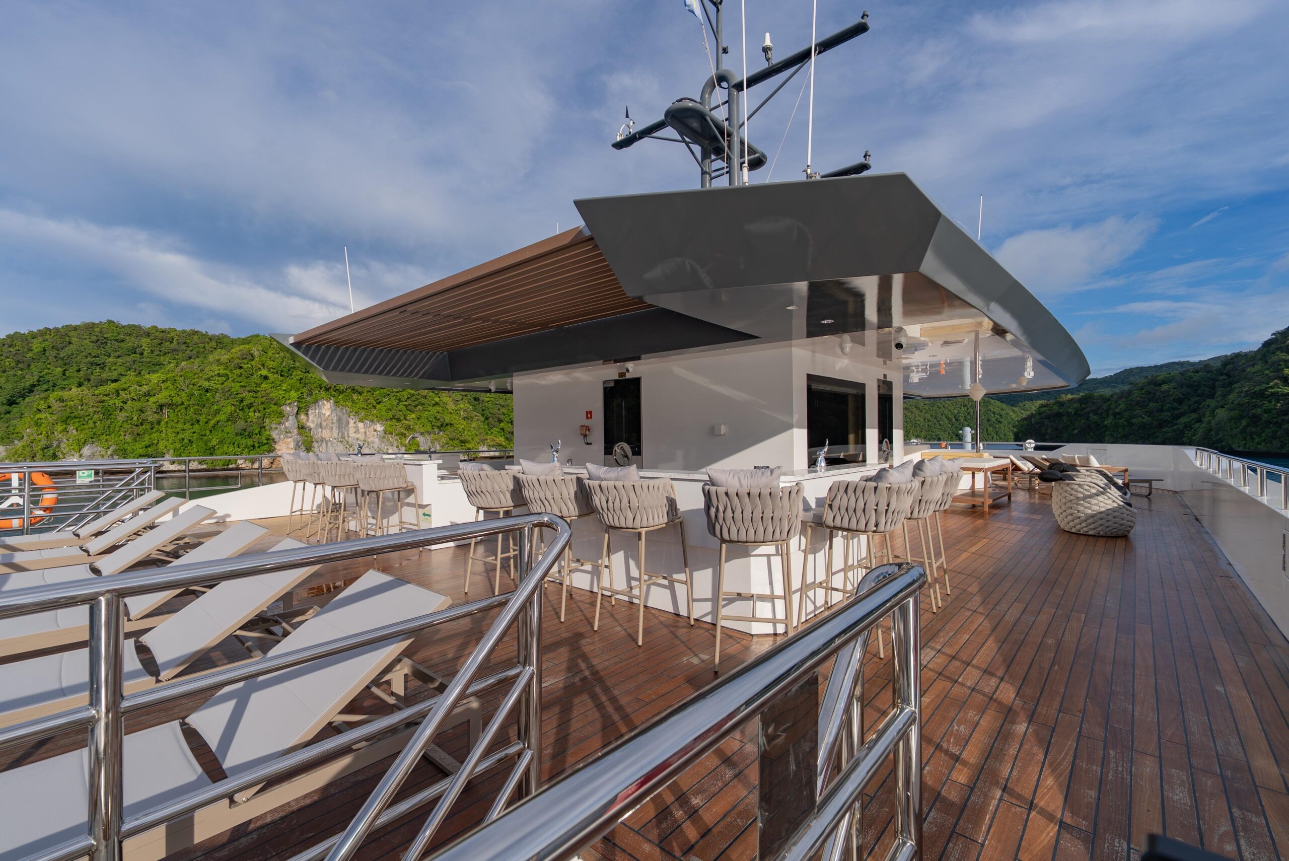 Скай-дек — пожалуй, самое впечатляющее пространство на борту: несколько баров и лаунж-зон, приватная SPA-зона и джакузи на 6 человек с панорамным видом на океан. Стеклянная крыша обеспечивает защиту от непогоды и комфорт при любых условиях.