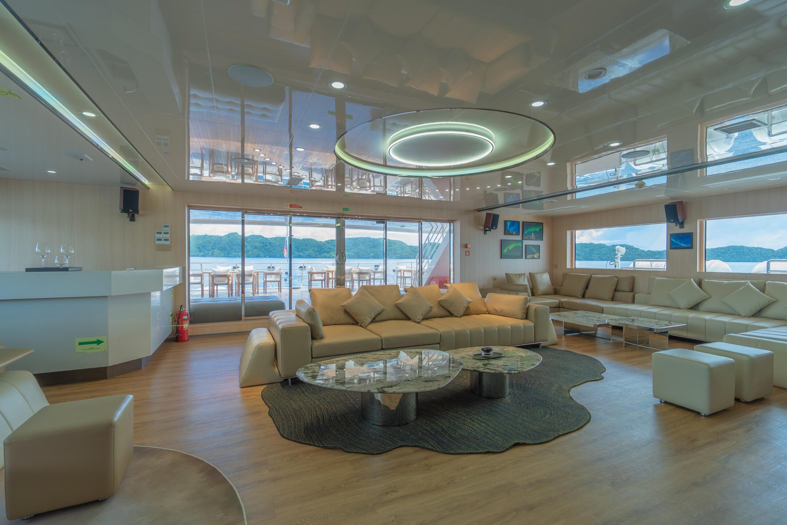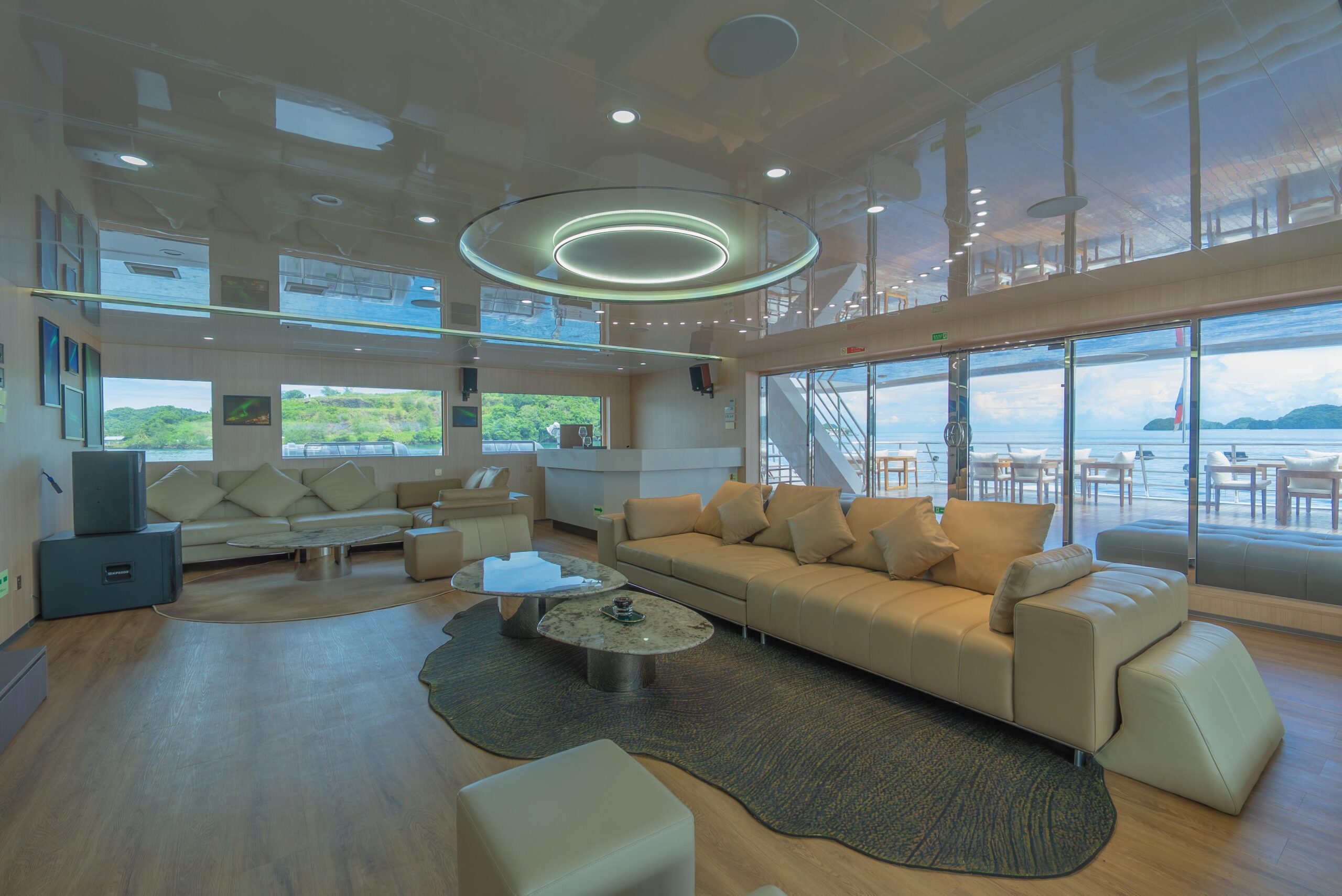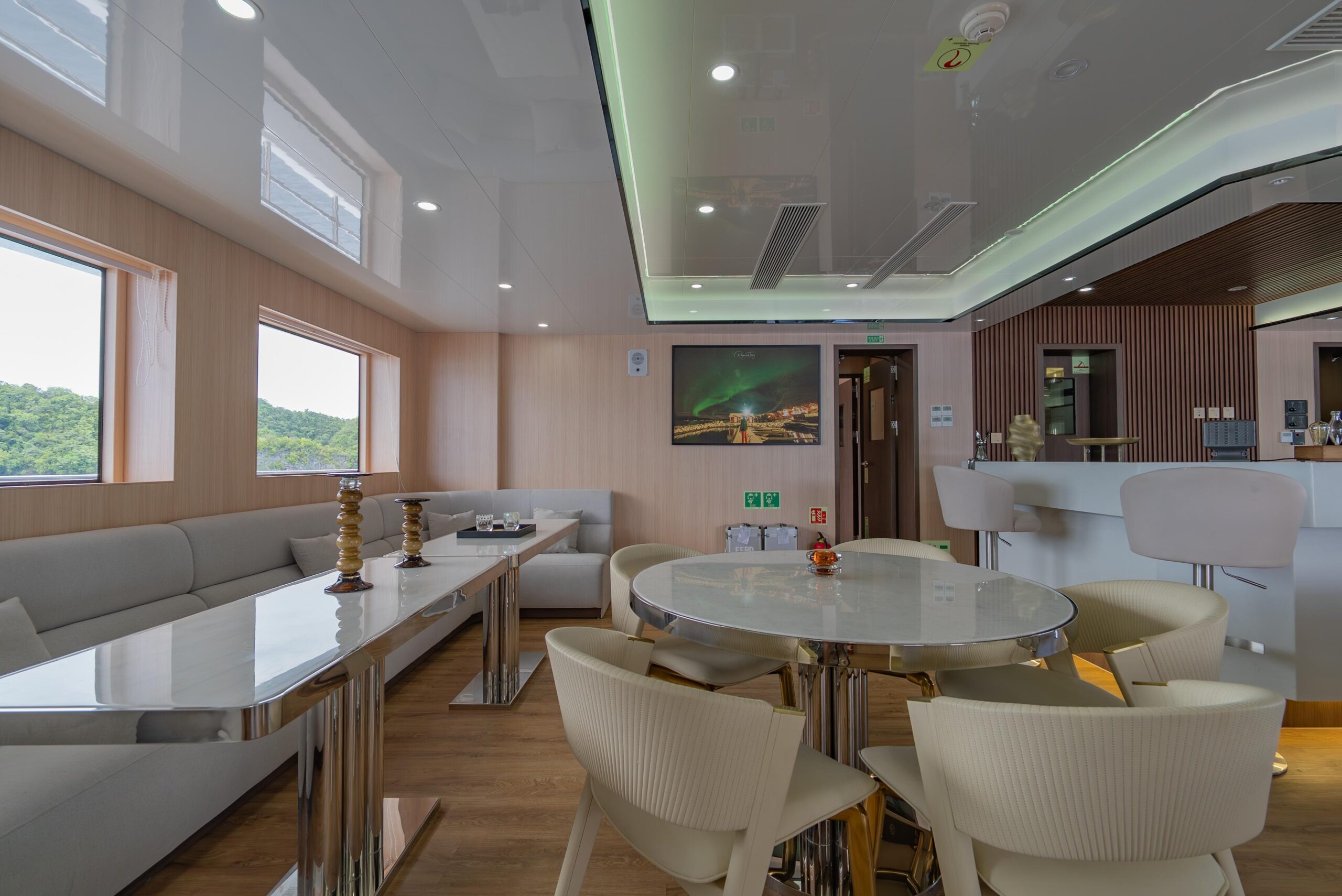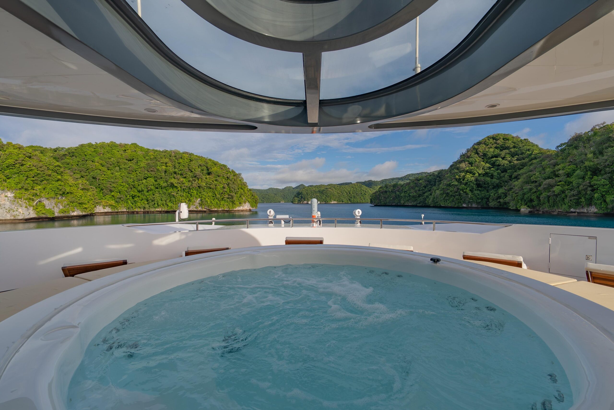 Скай-дек — пожалуй, самое впечатляющее пространство на борту: несколько баров и лаунж-зон, приватная SPA-зона и джакузи на 6 человек с панорамным видом на океан. Стеклянная крыша обеспечивает защиту от непогоды и комфорт при любых условиях.
