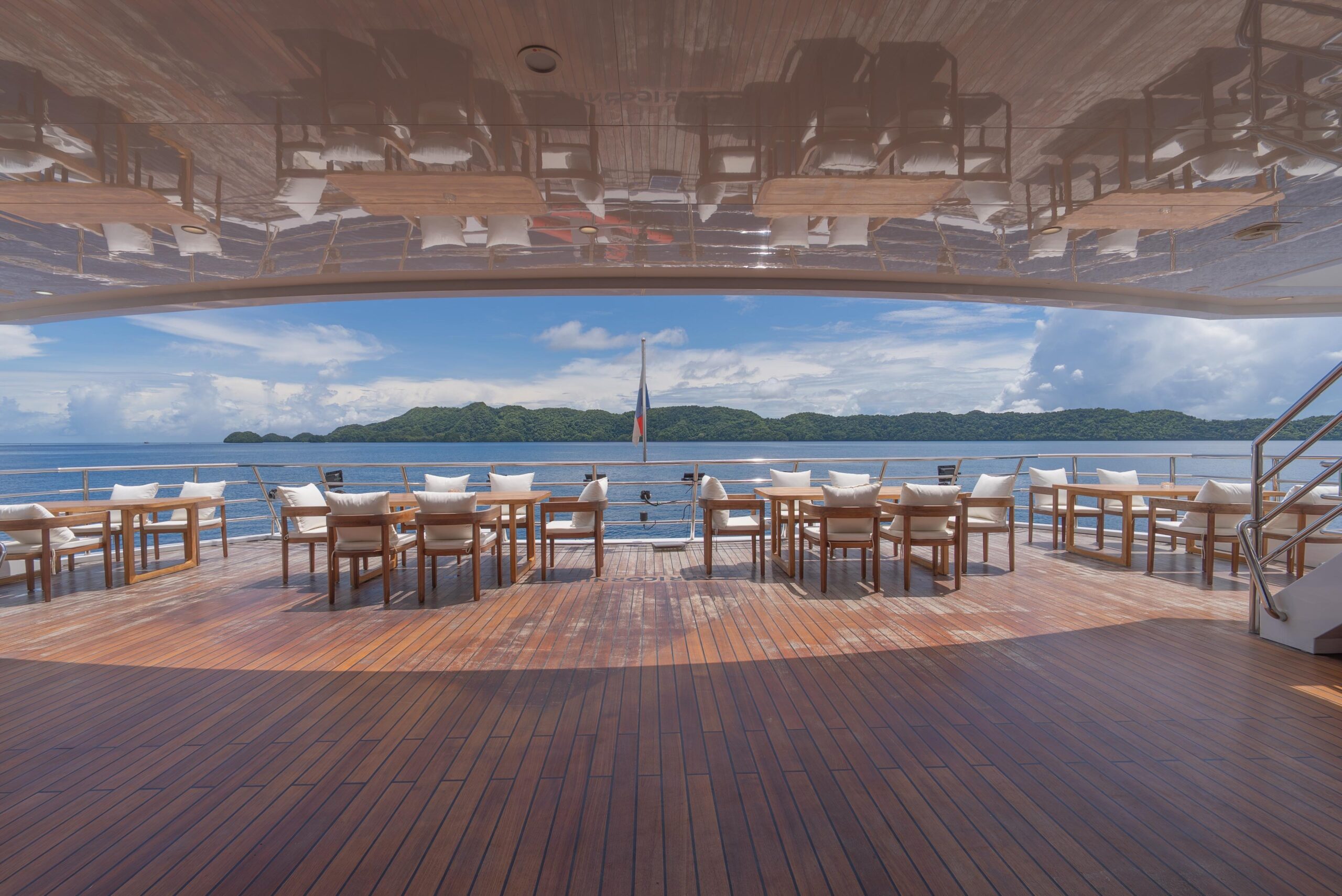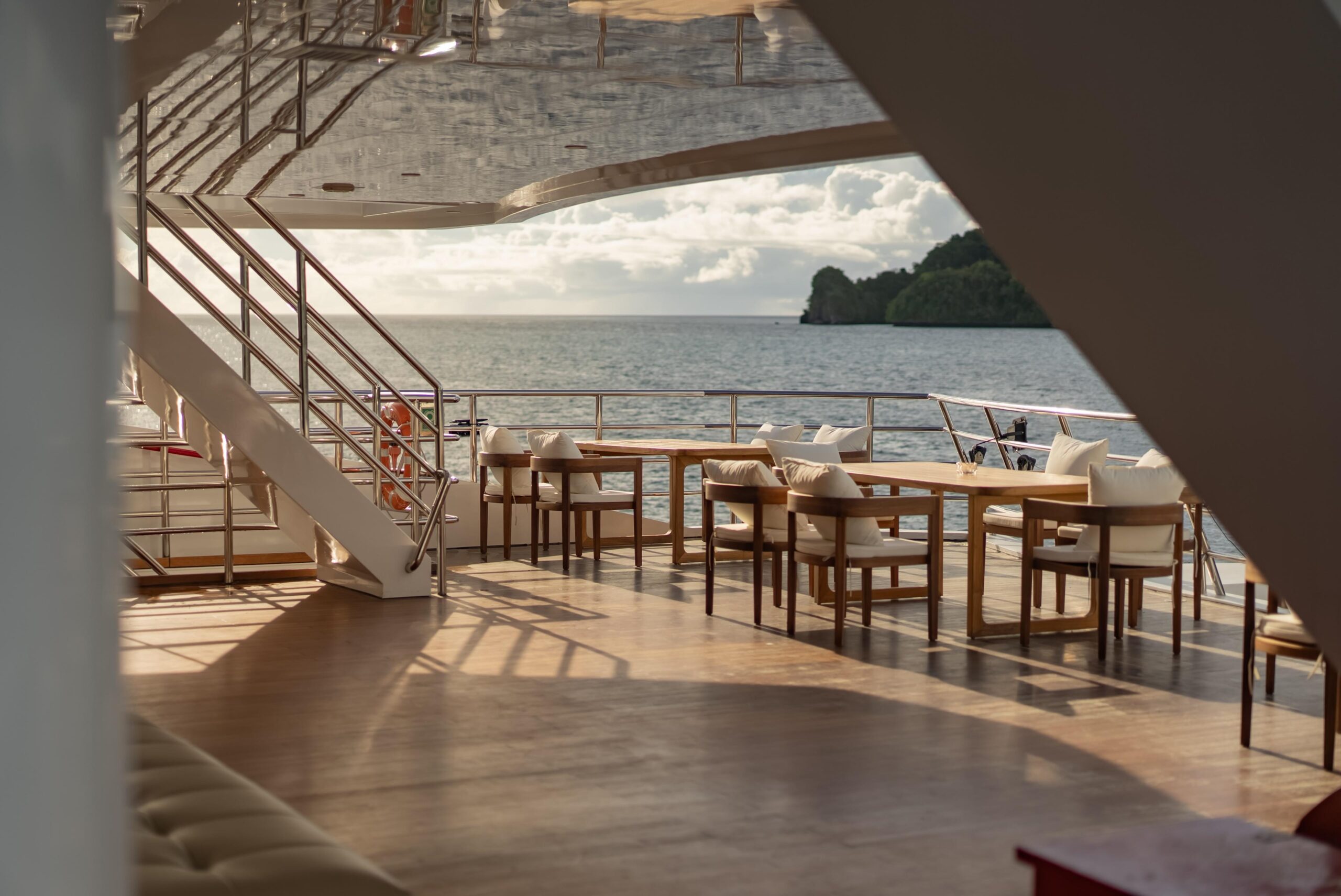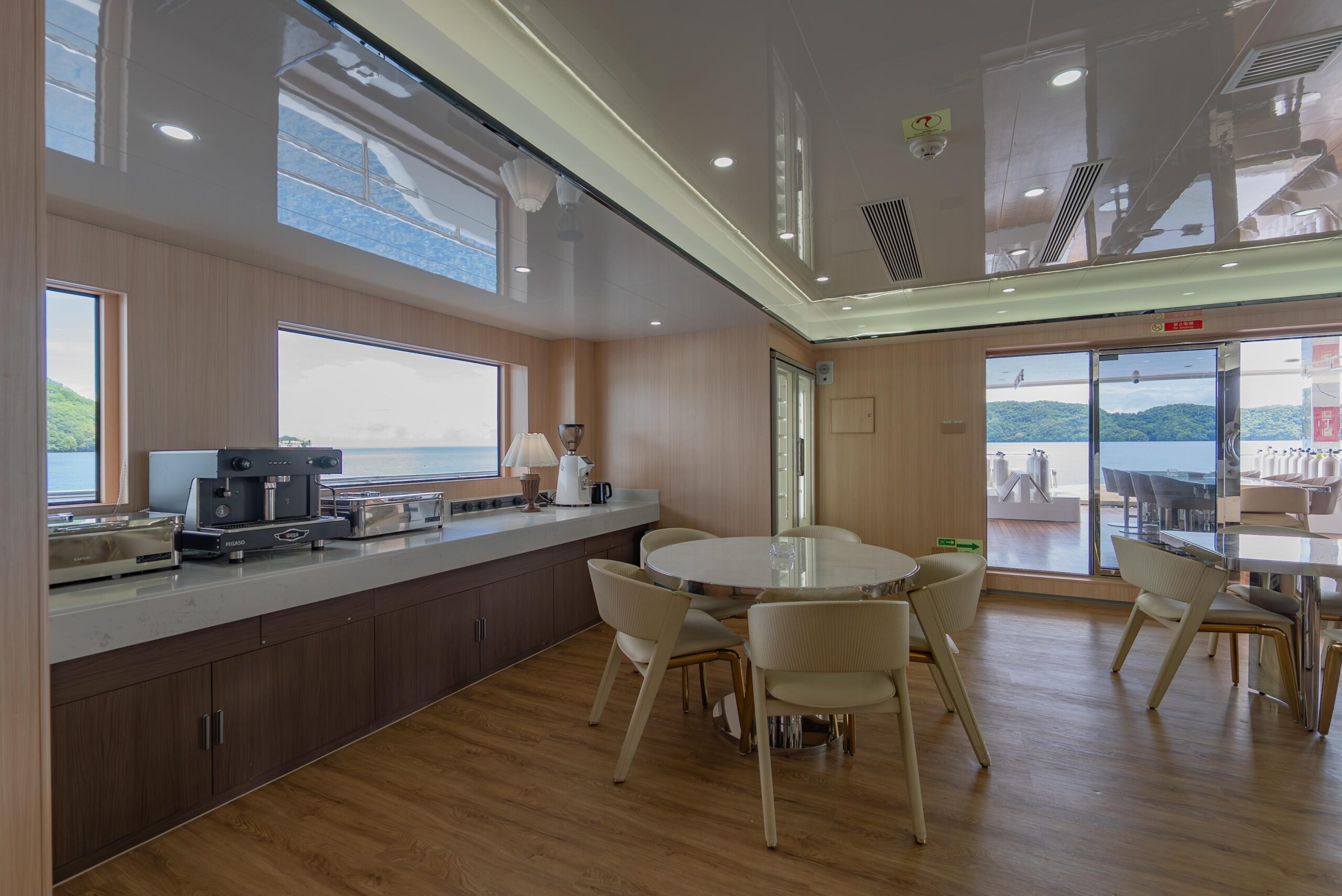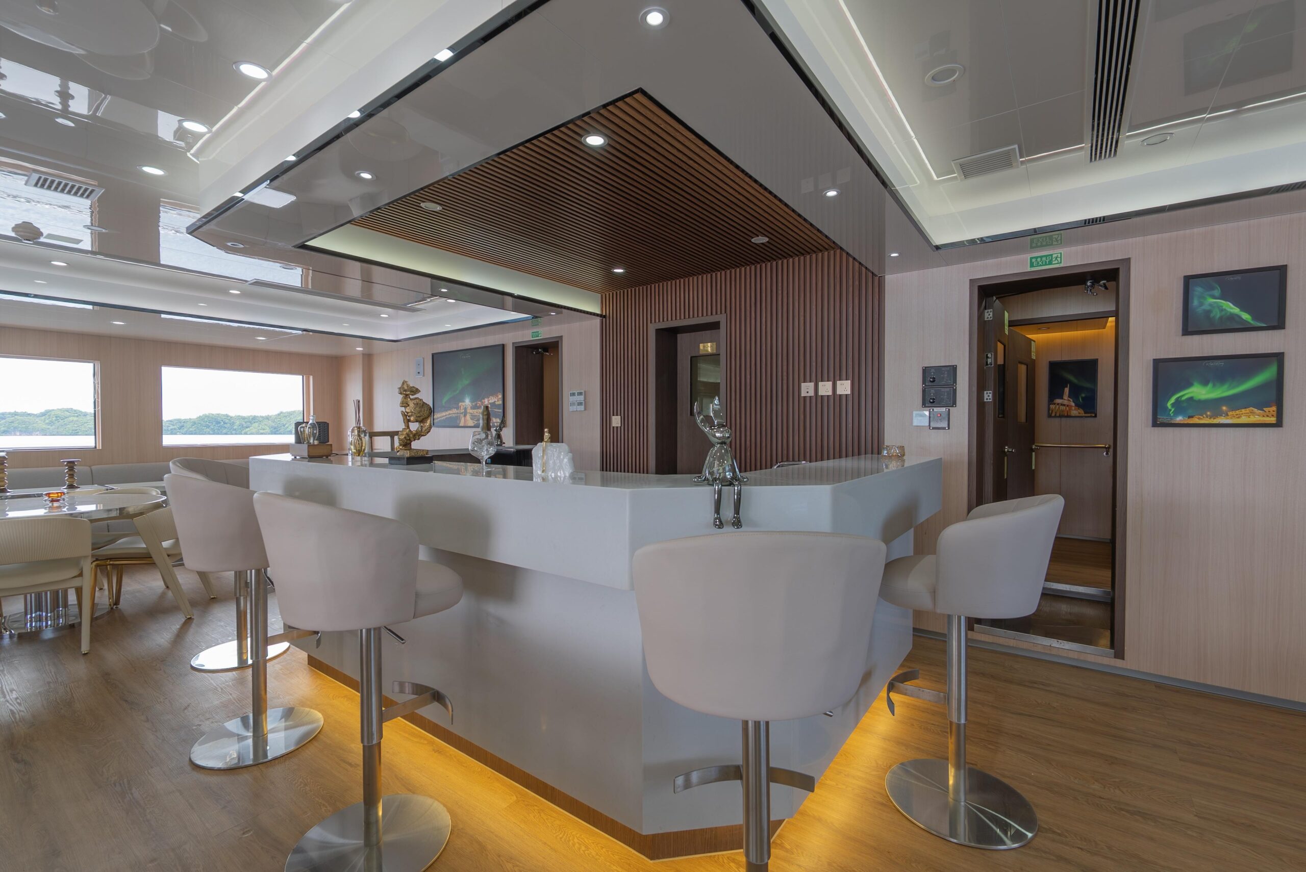 Скай-дек — пожалуй, самое впечатляющее пространство на борту: несколько баров и лаунж-зон, приватная SPA-зона и джакузи на 6 человек с панорамным видом на океан. Стеклянная крыша обеспечивает защиту от непогоды и комфорт при любых условиях.