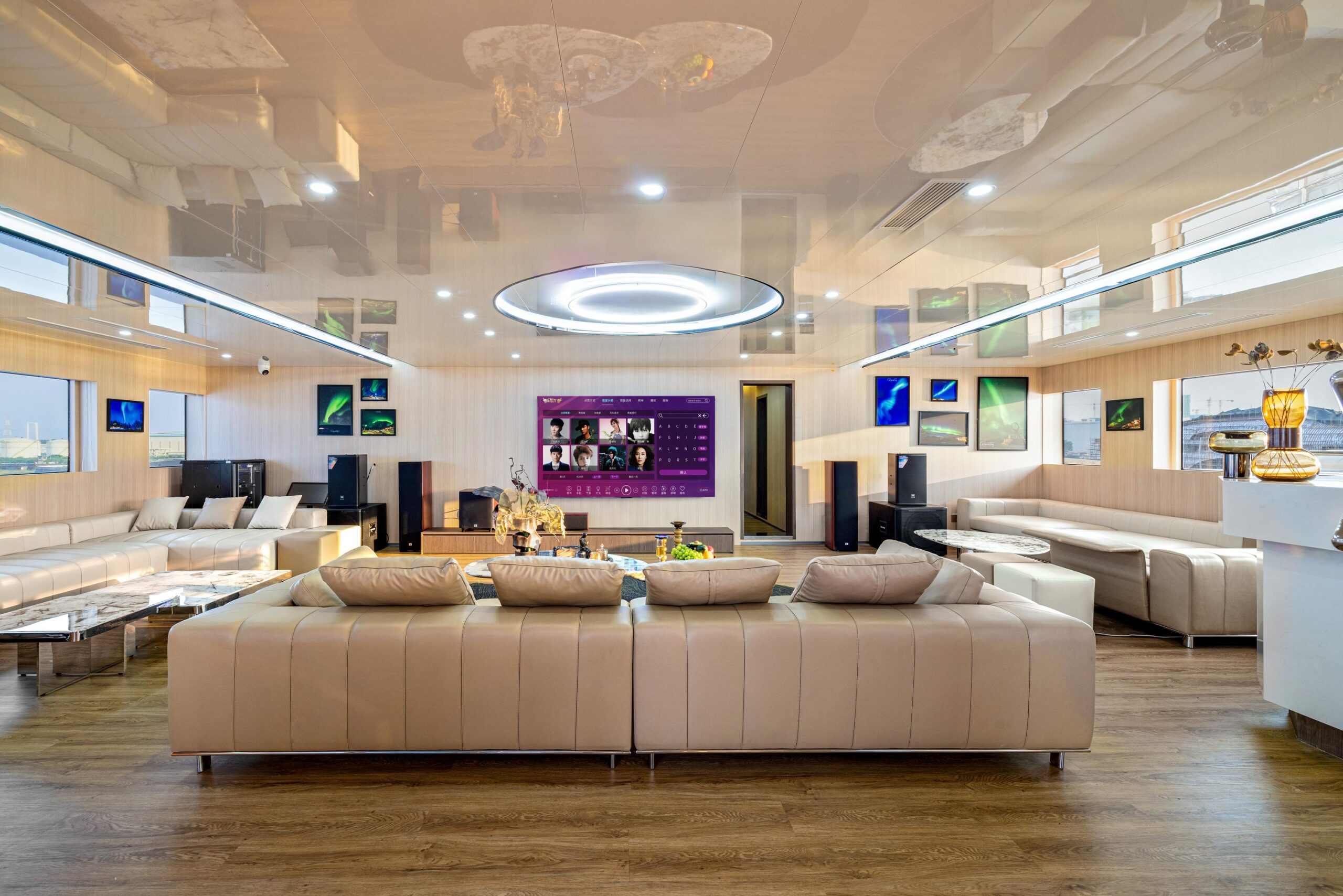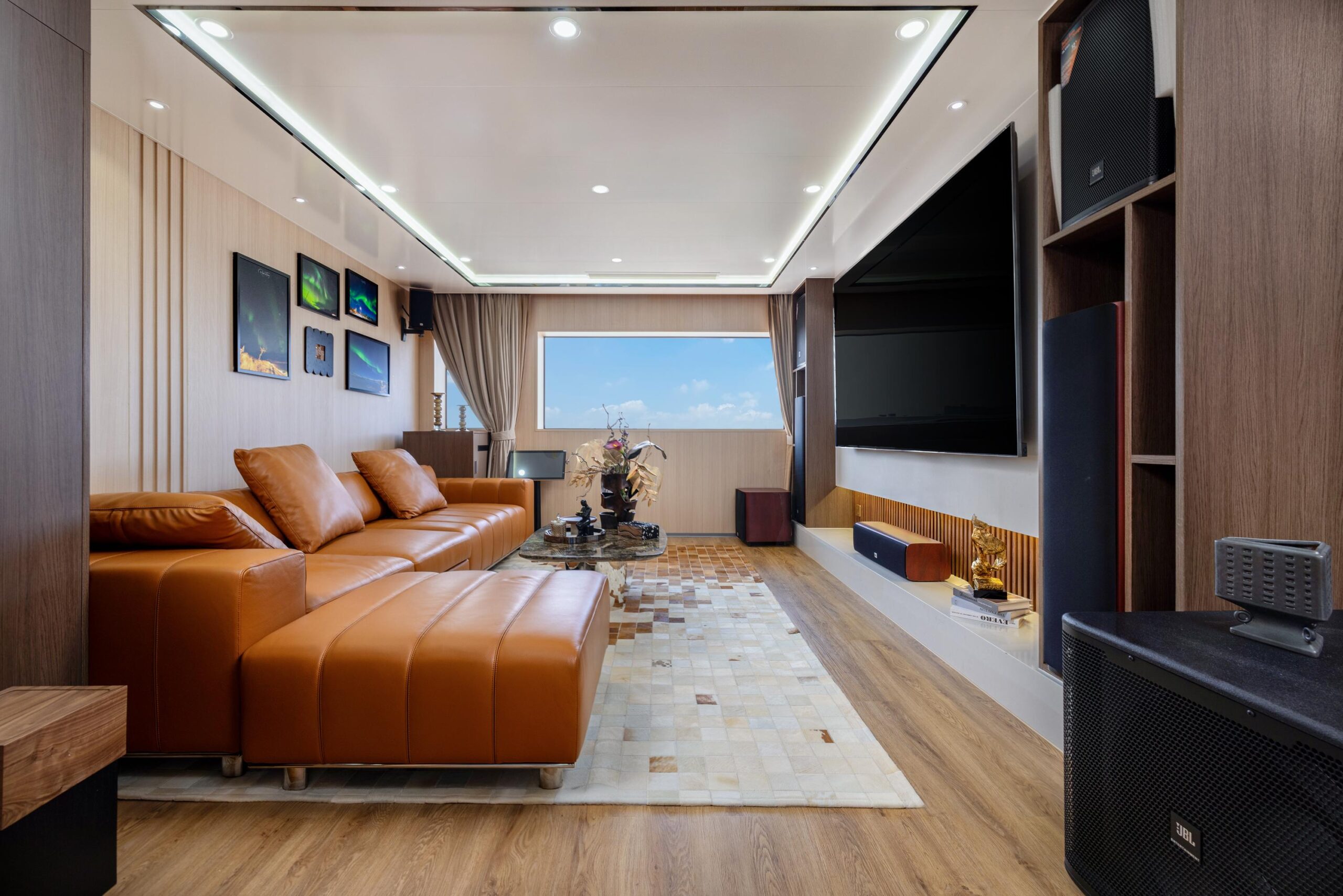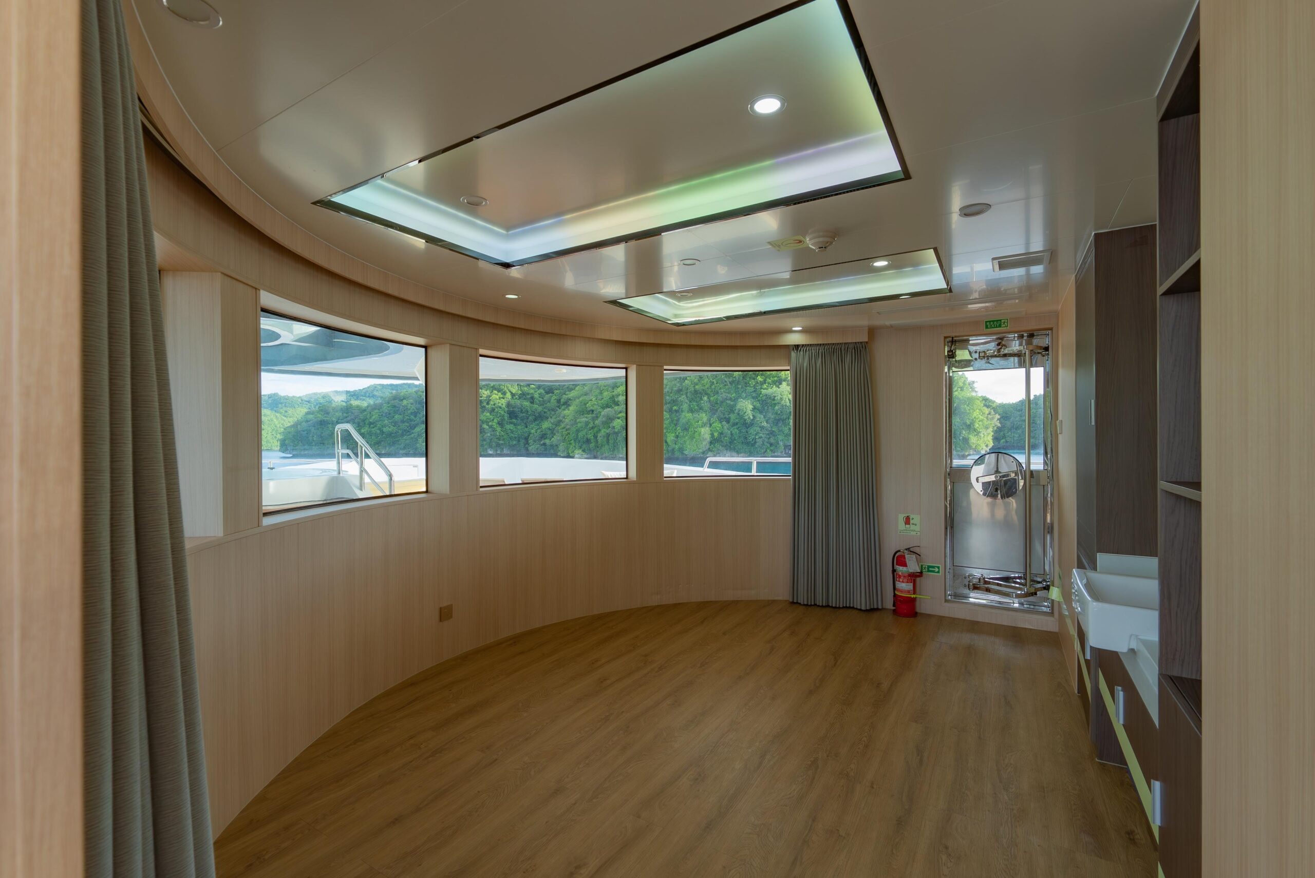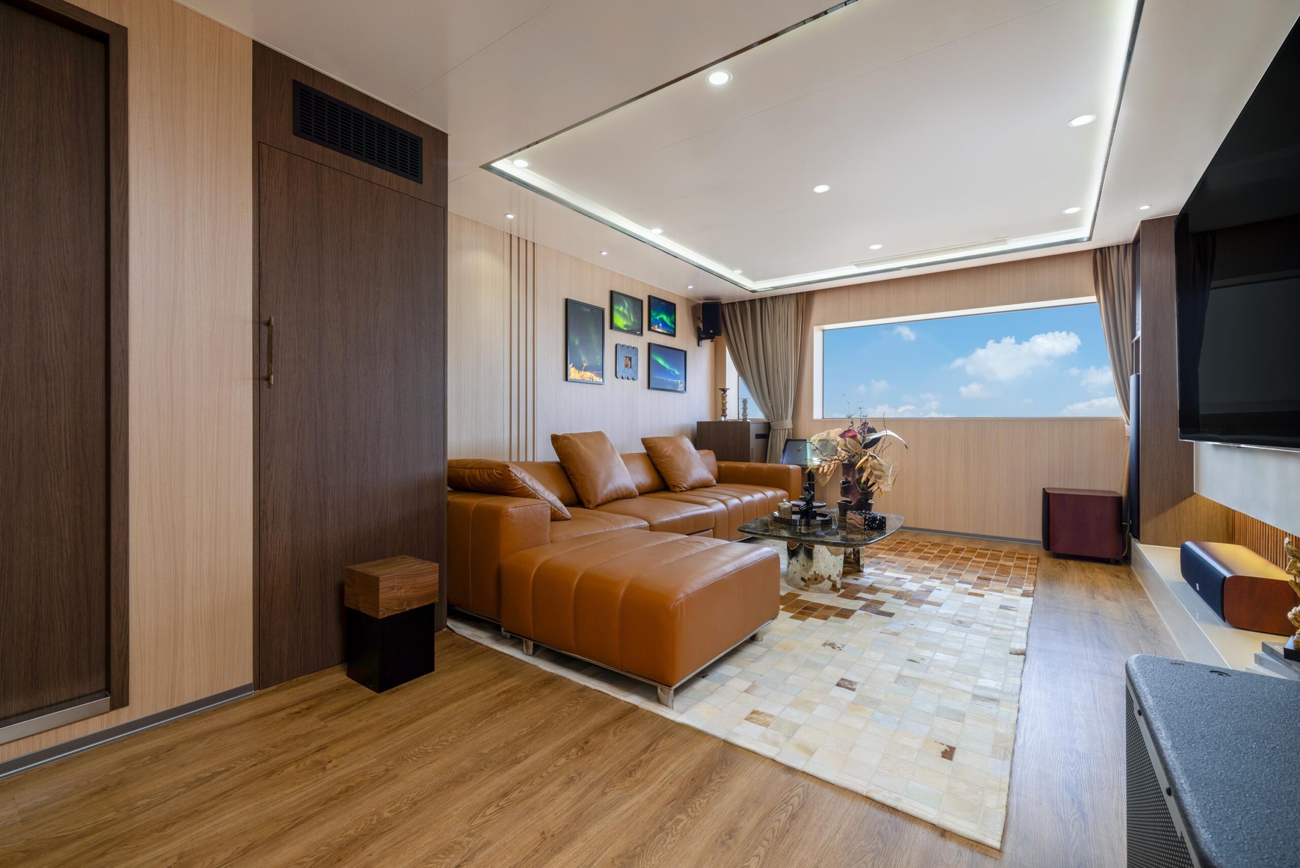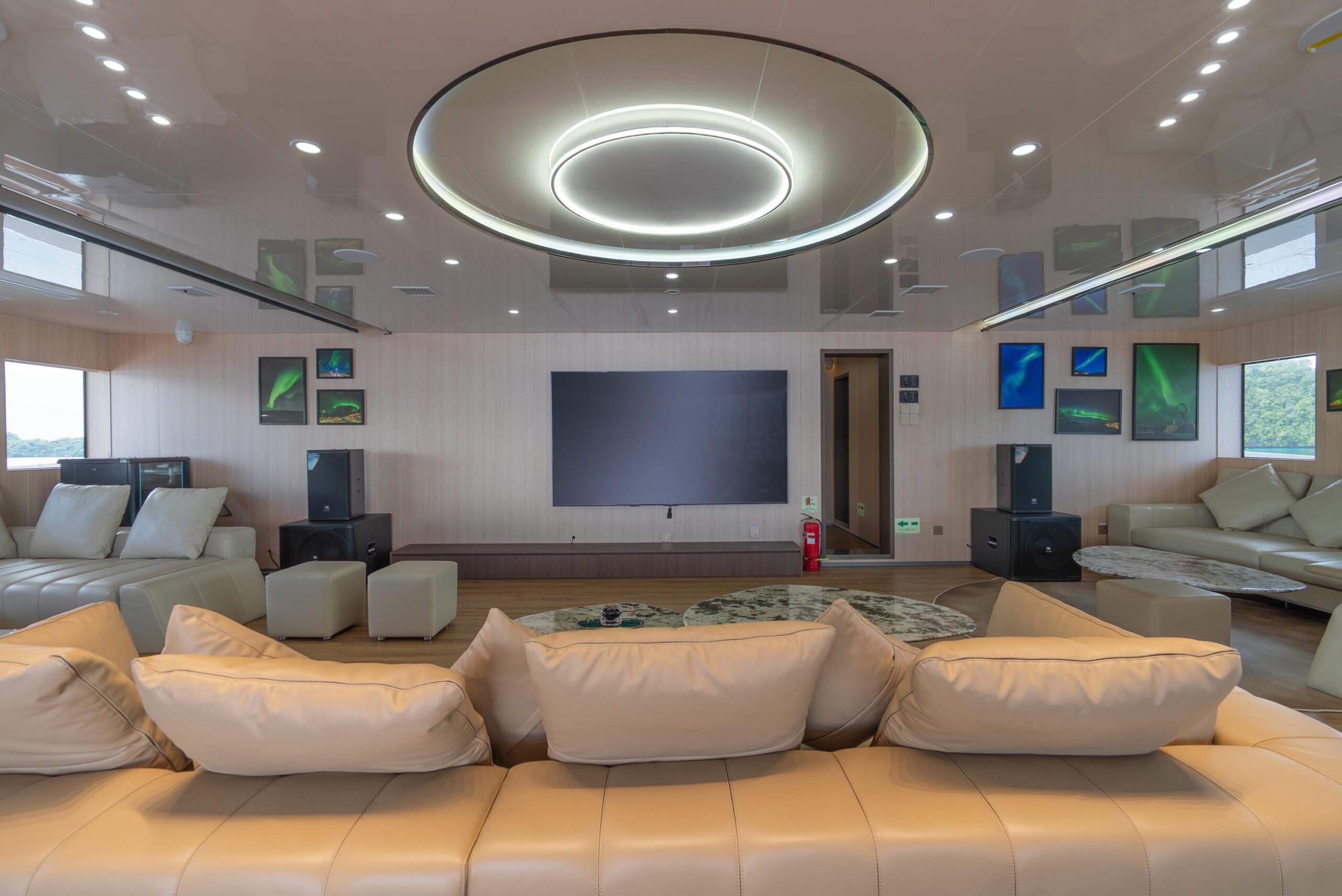 Верхняя палуба включает оставшиеся пять кают. Здесь расположен просторный апартамент владельца с панорамными окнами, ванной комнатой с ванной, а главной изюминкой является частный кинотеатр владельца с системой Dolby Digital, удобными диванами и 85-дюймовым Smart TV.
