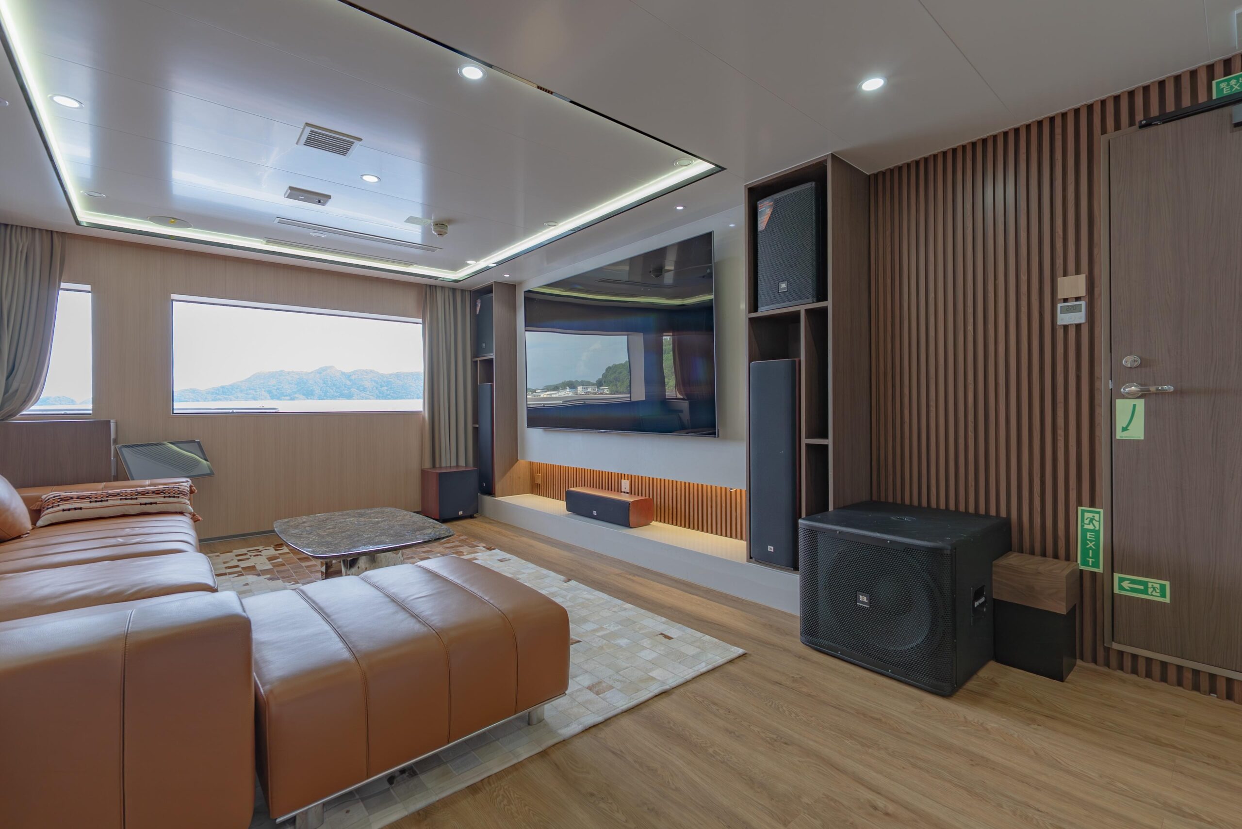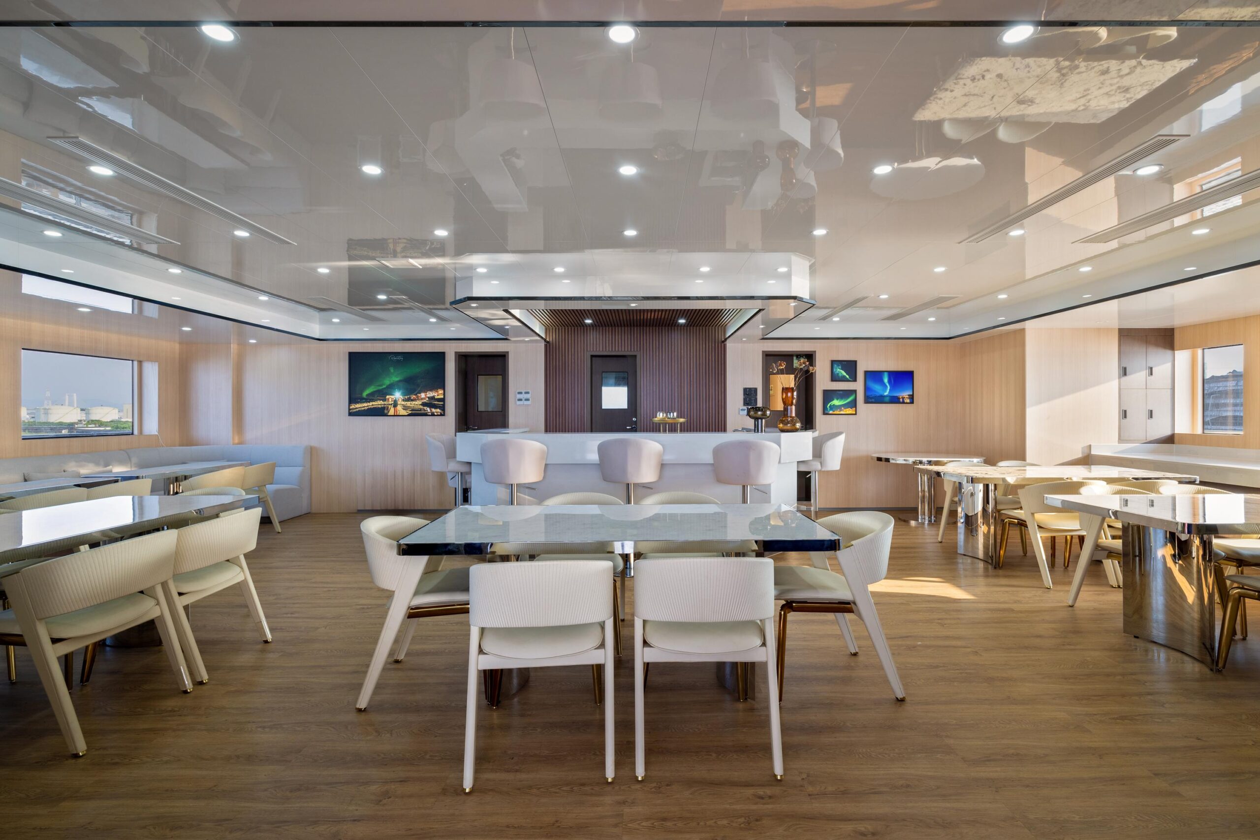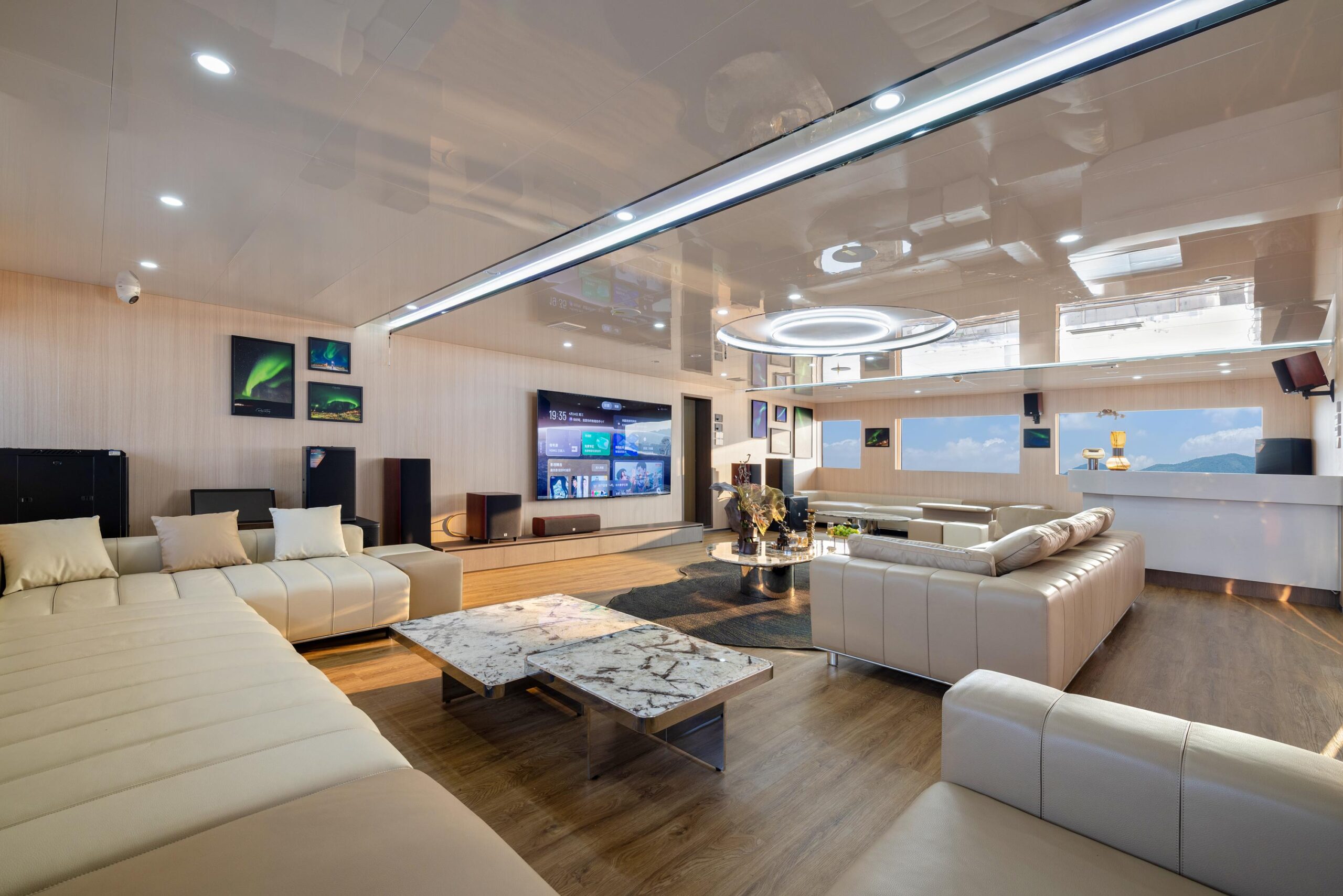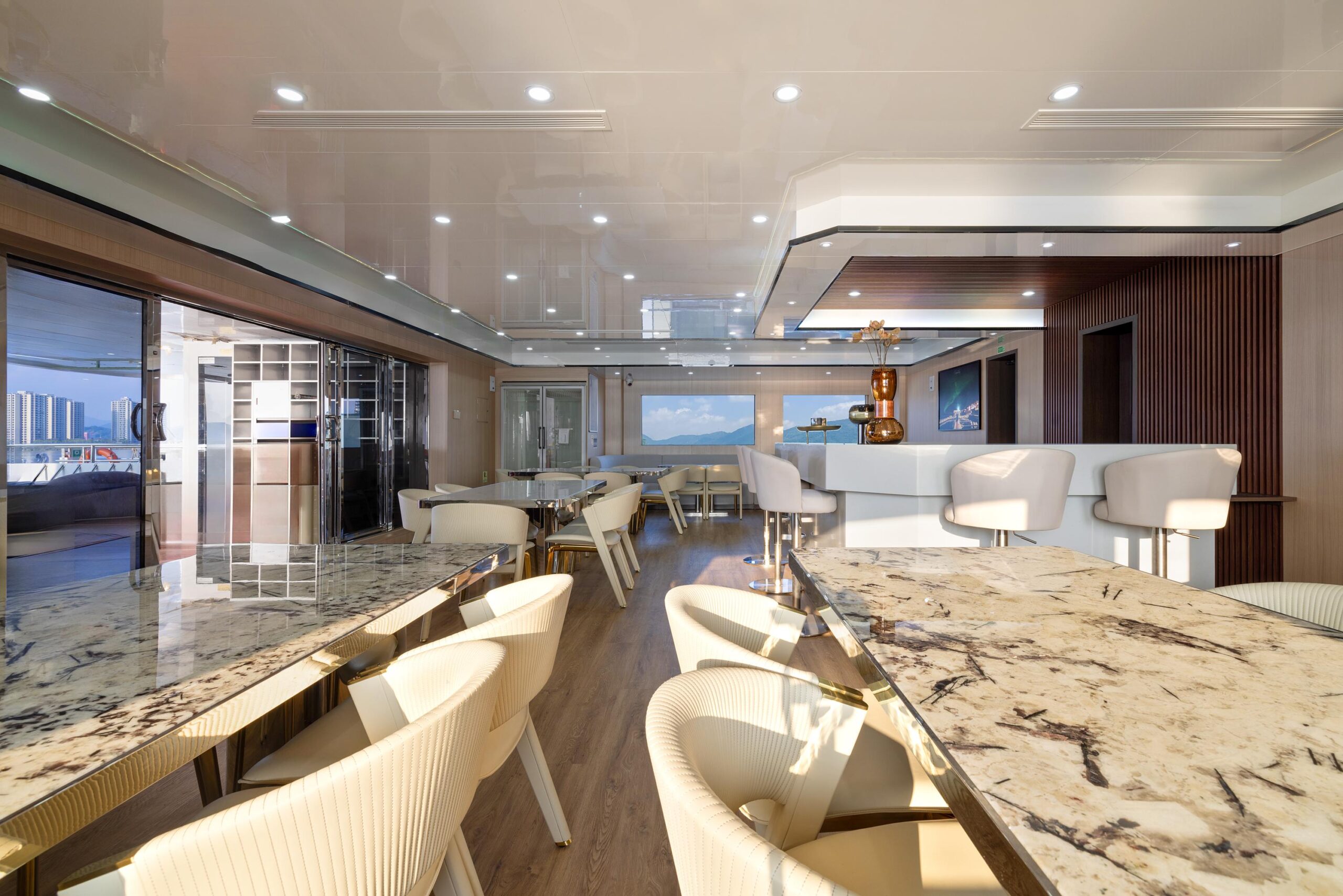В кормовой части расположен крытый салон для развлечений с несколькими зонами отдыха, индивидуальным освещением, современной аудиосистемой и ещё одним 85-дюймовым Smart TV. Рядом находится бар и раздвижные двери, ведущие на террасу с видом на море, оборудованную четырьмя обеденными столами на 6 персон и лаунж-зонами для приёма пищи на открытом воздухе.