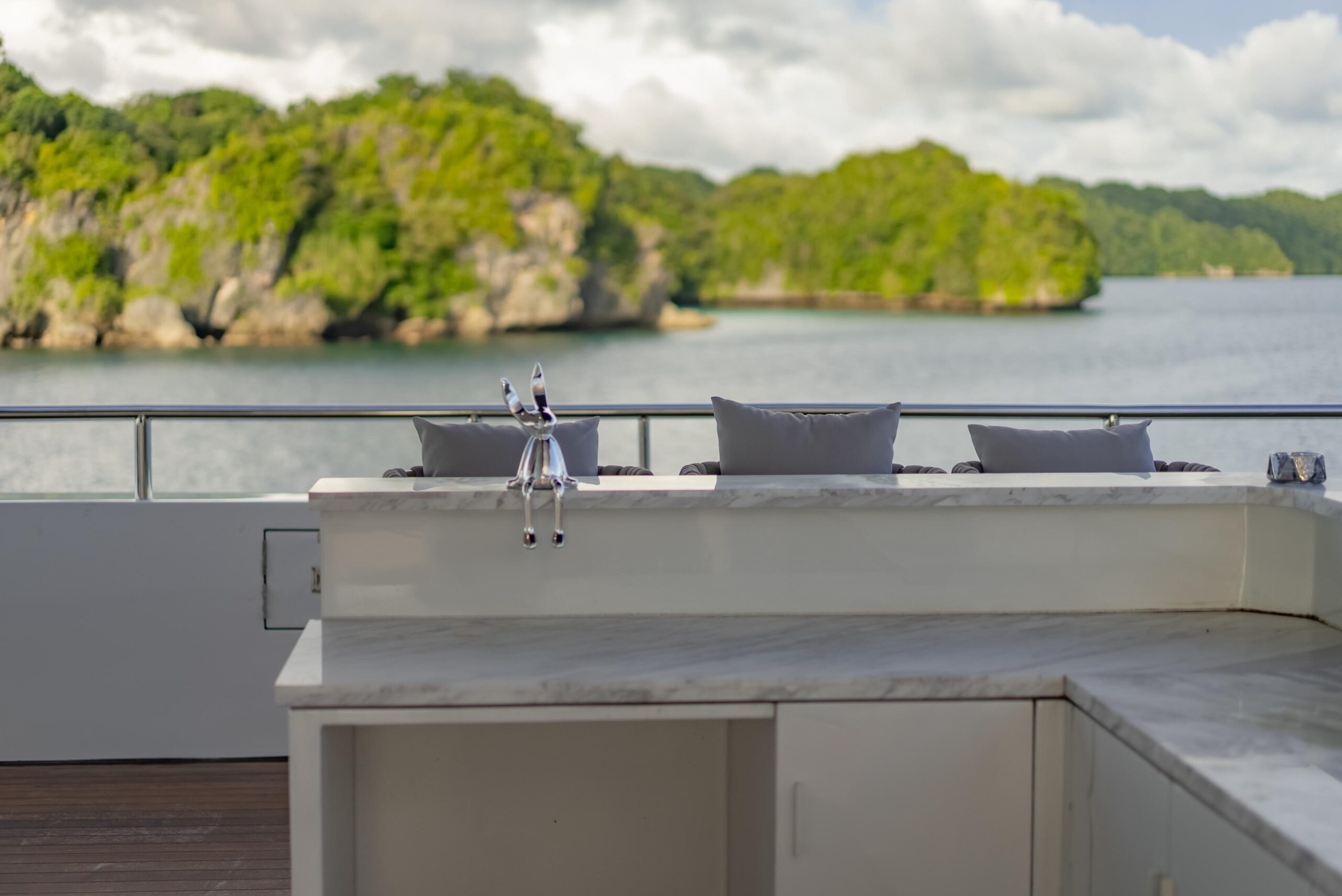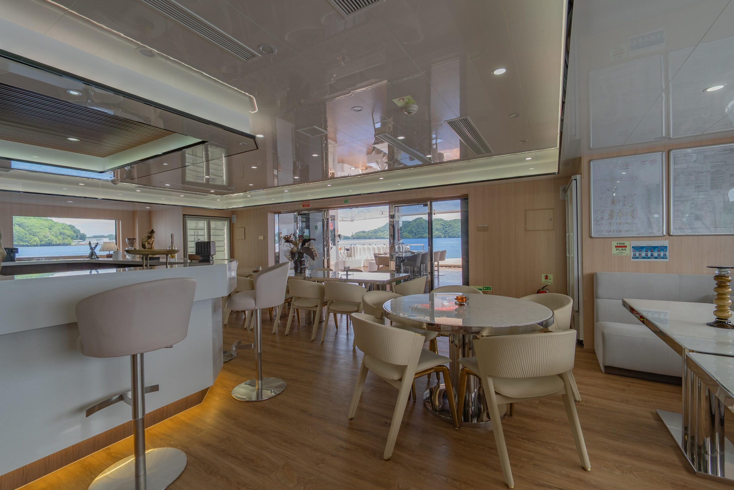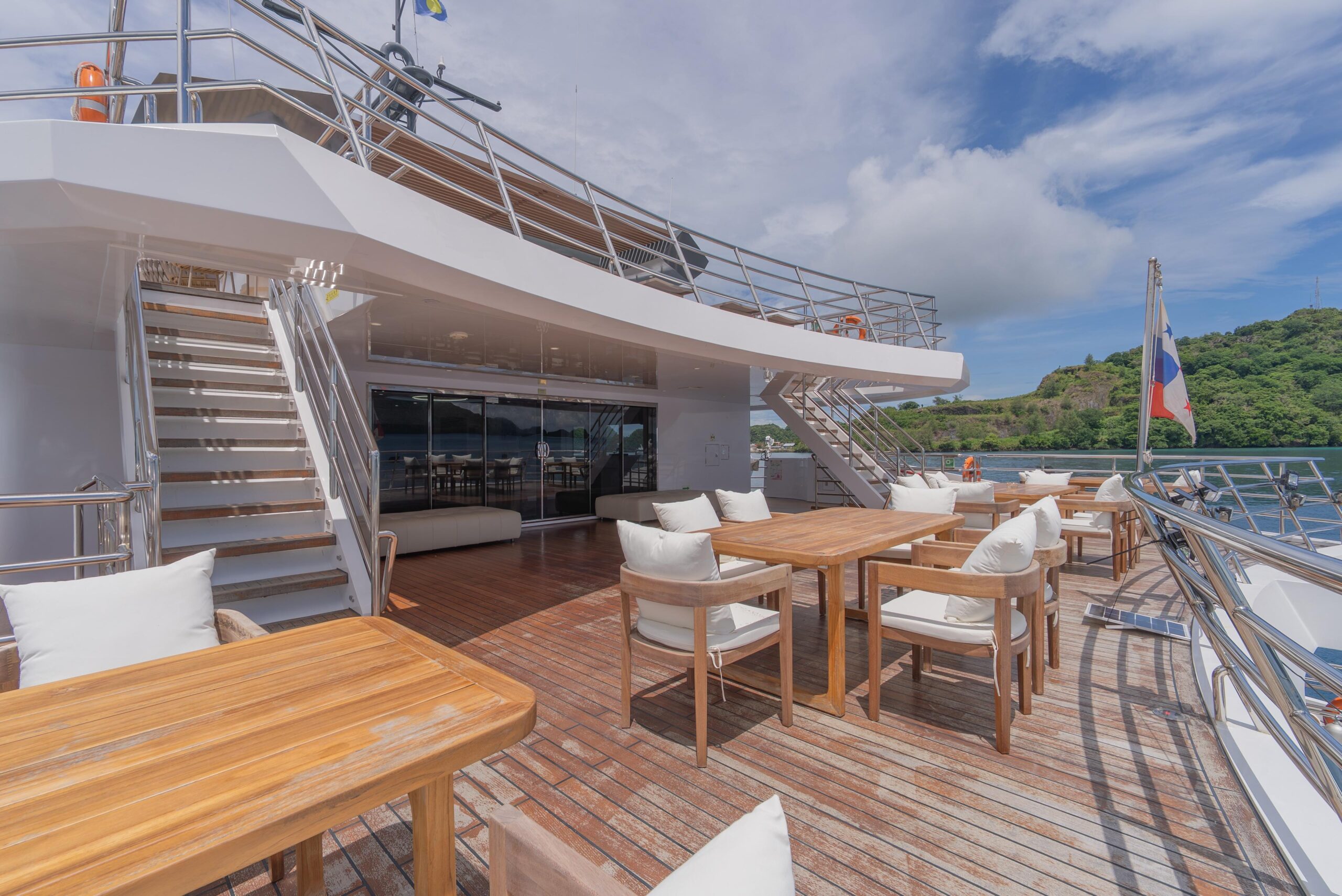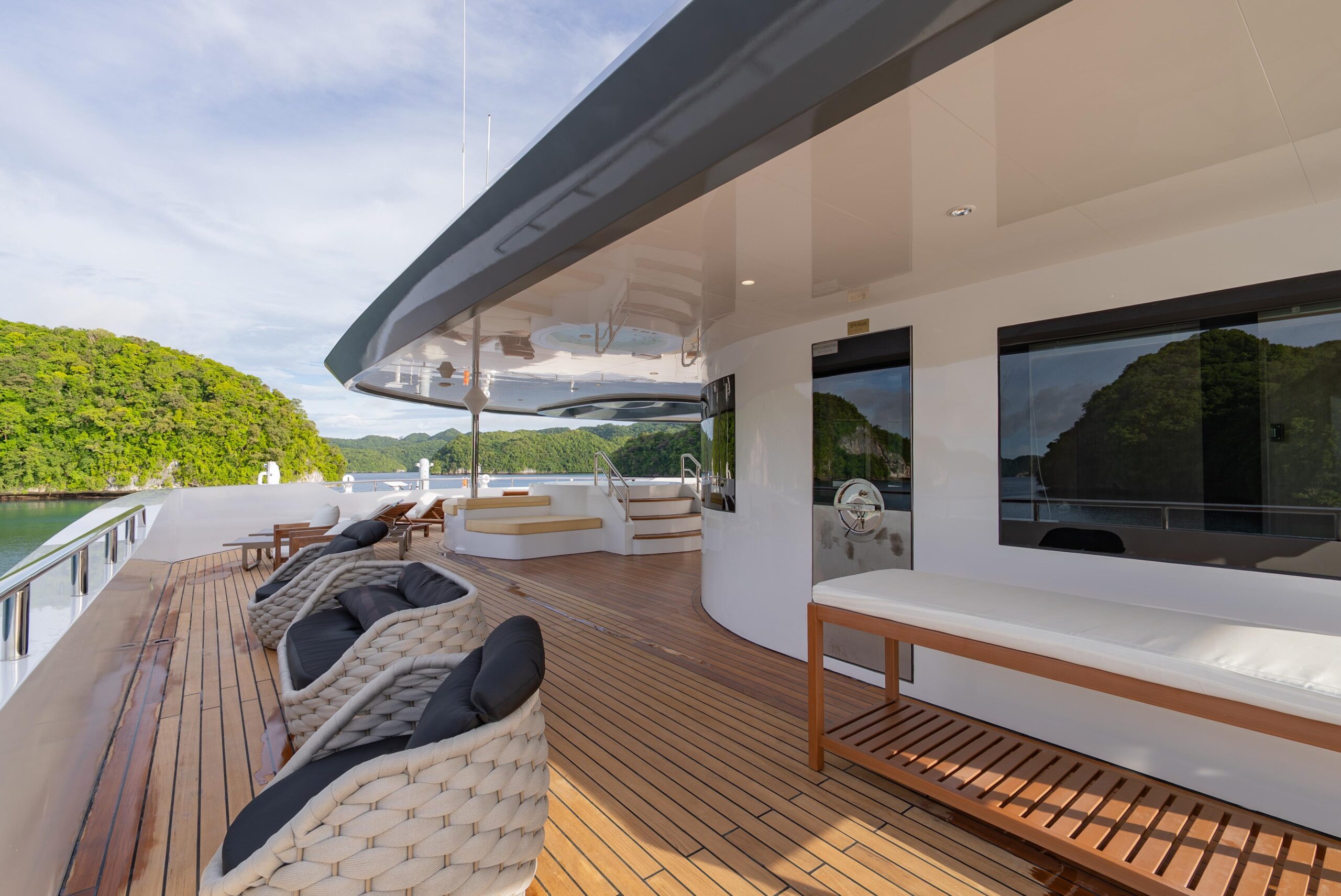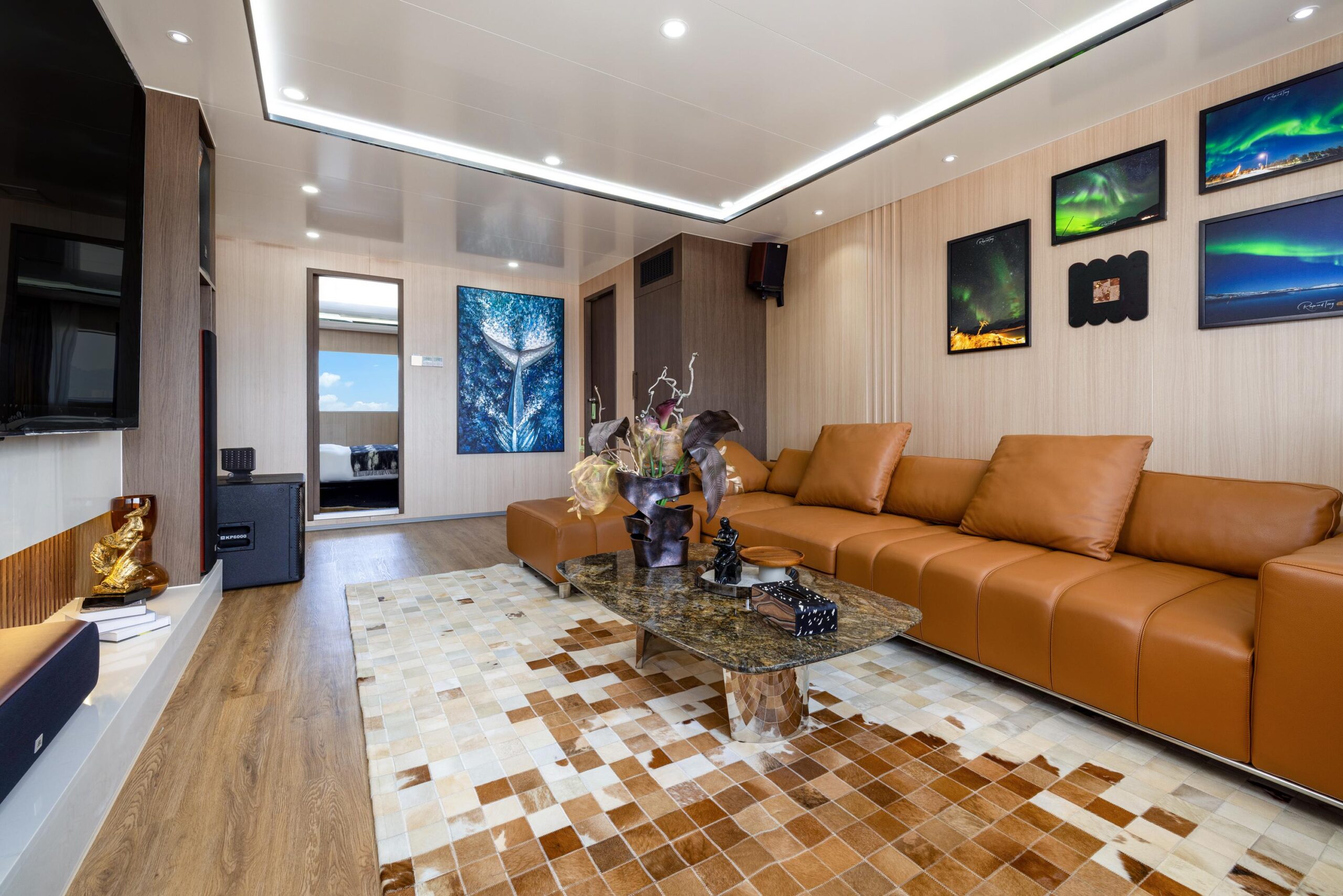В кормовой части расположен крытый салон для развлечений с несколькими зонами отдыха, индивидуальным освещением, современной аудиосистемой и ещё одним 85-дюймовым Smart TV. Рядом находится бар и раздвижные двери, ведущие на террасу с видом на море, оборудованную четырьмя обеденными столами на 6 персон и лаунж-зонами для приёма пищи на открытом воздухе.