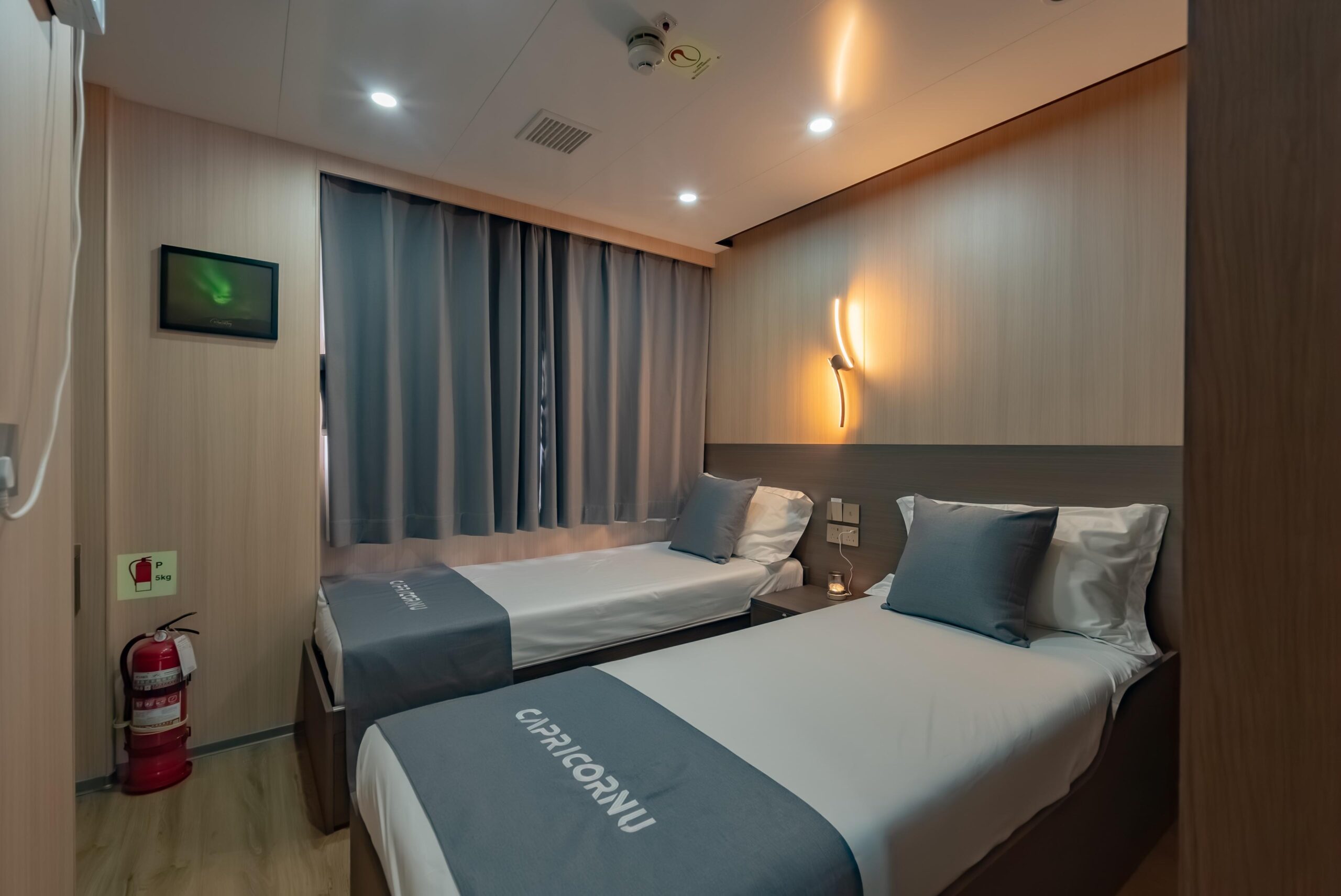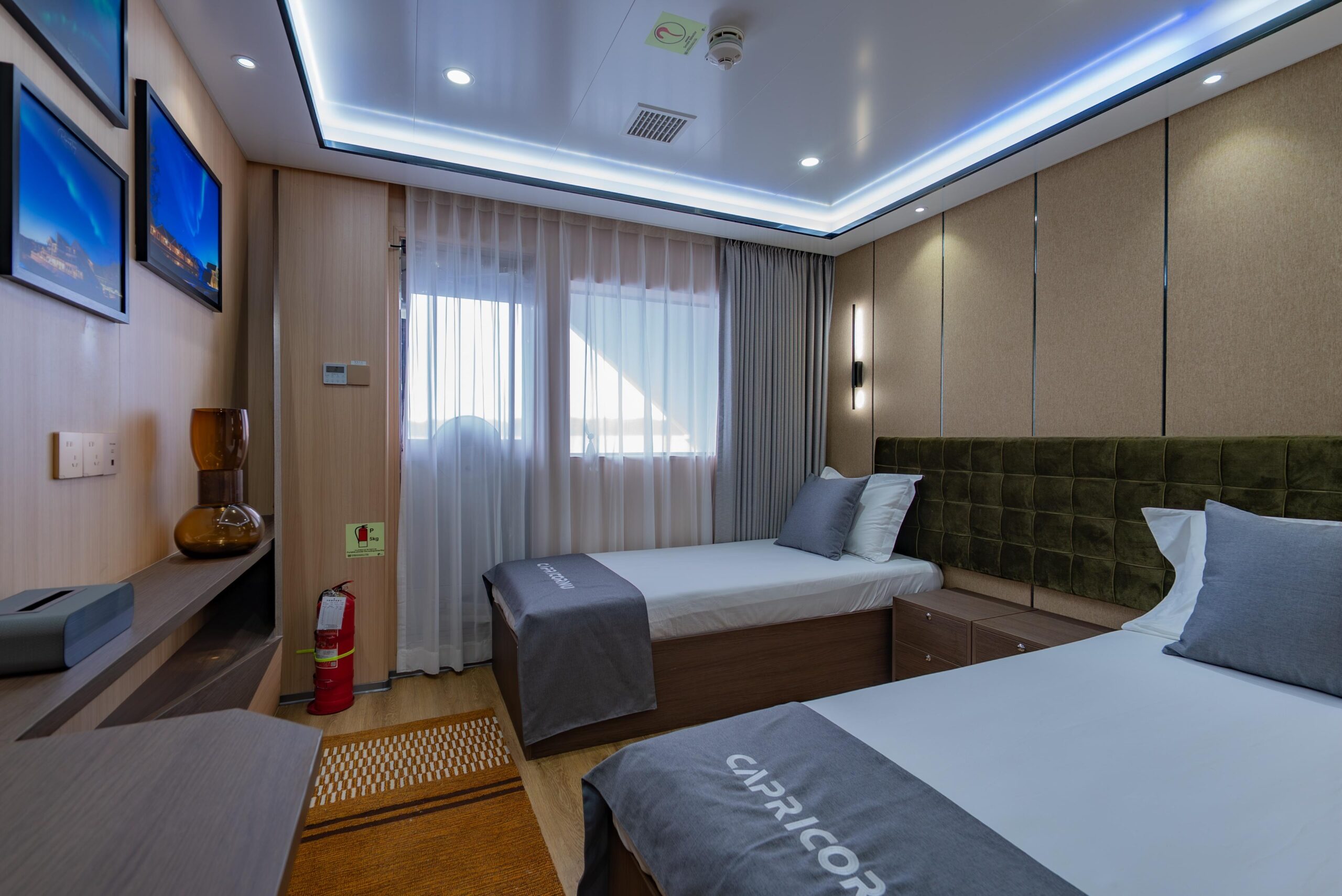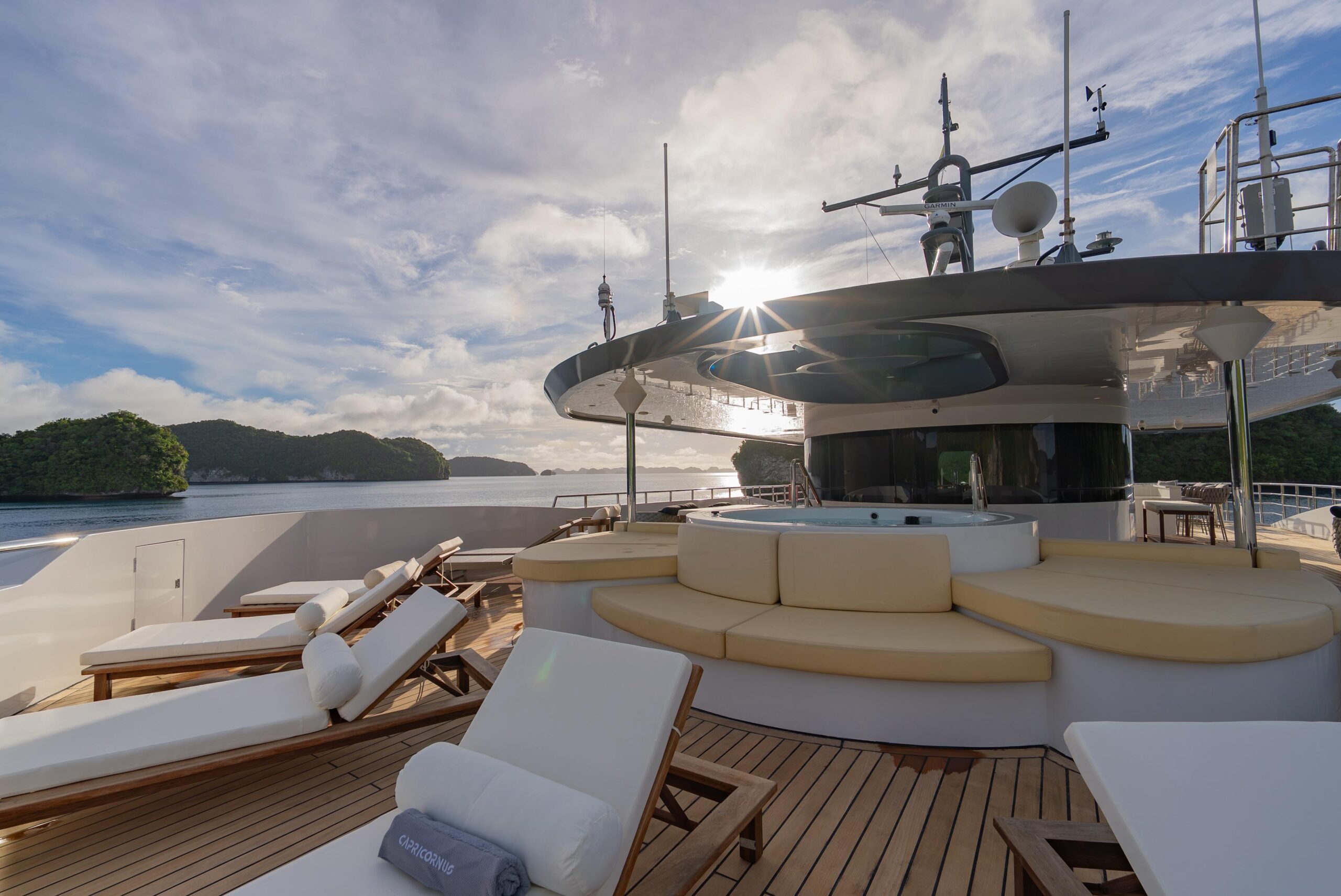 Capricornus располагает 15 гостевыми каютами с собственными ванными комнатами, расположенными на главной и верхней палубах.