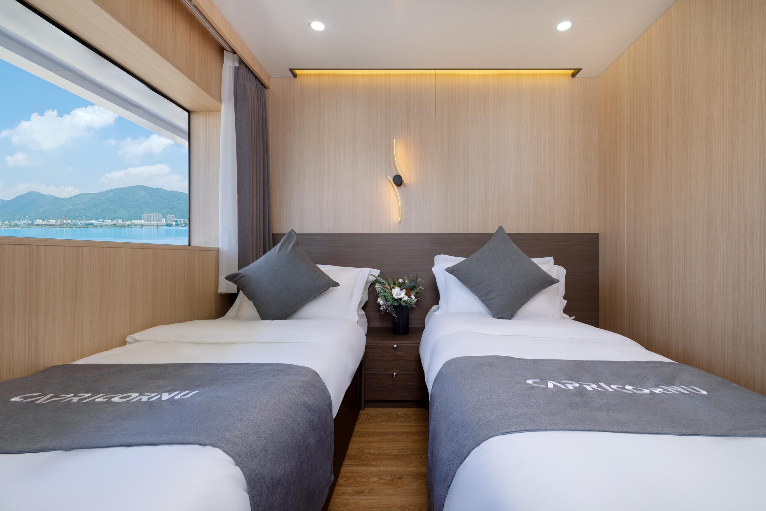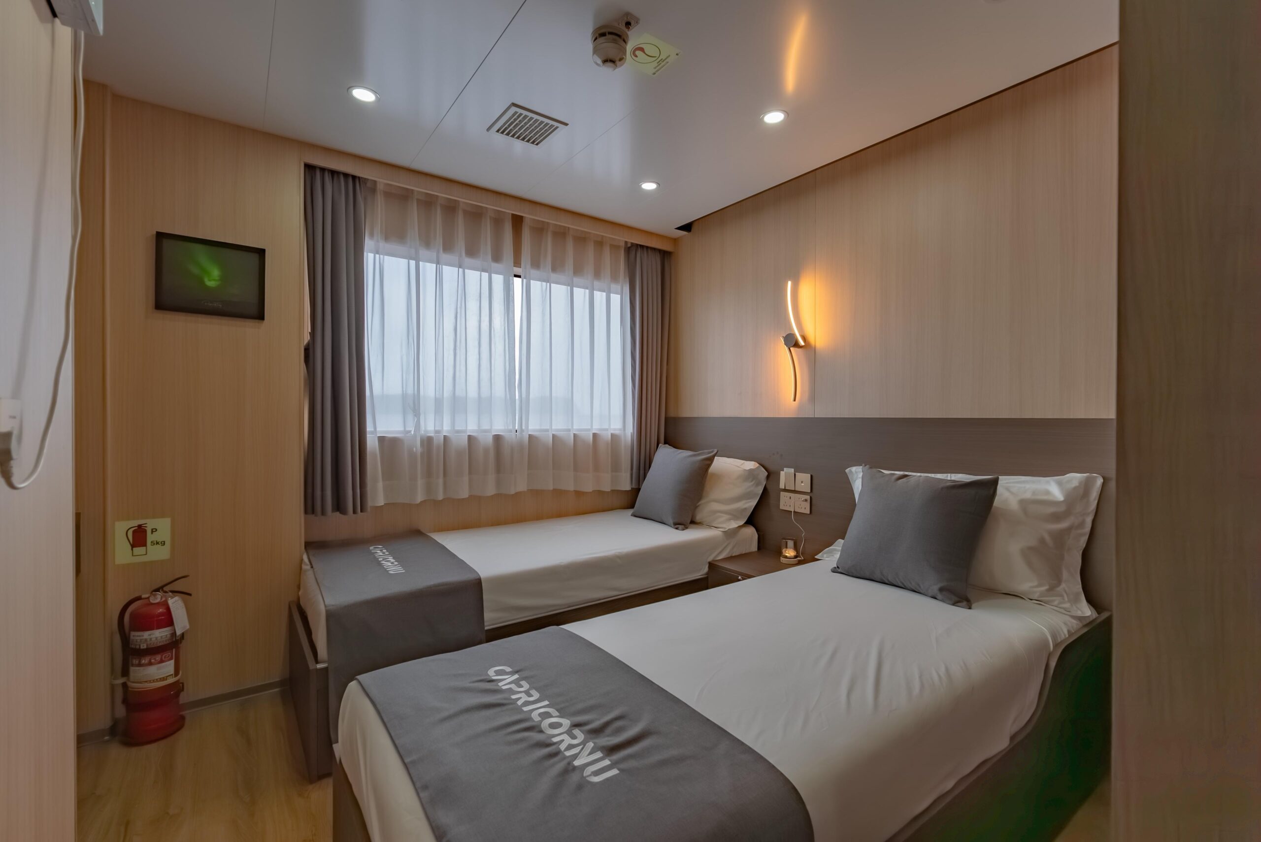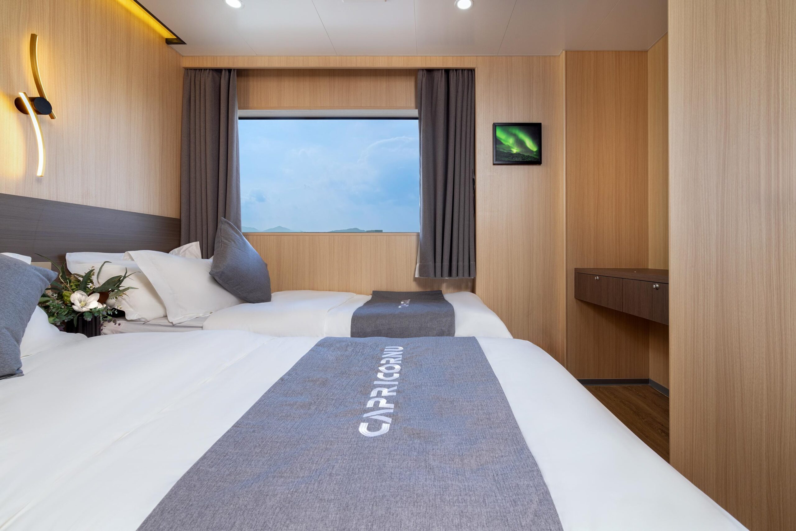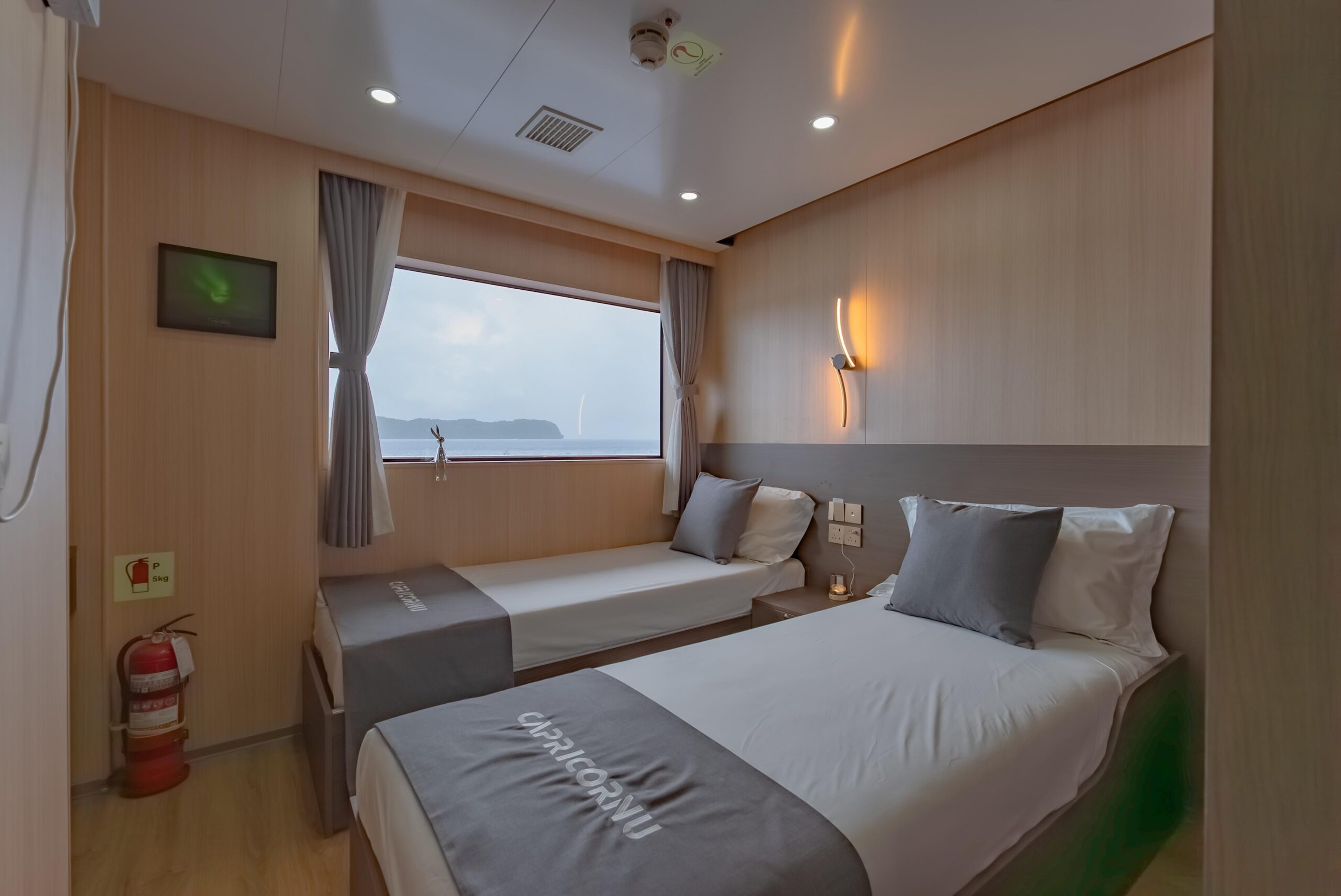Capricornus располагает 15 гостевыми каютами с собственными ванными комнатами, расположенными на главной и верхней палубах.