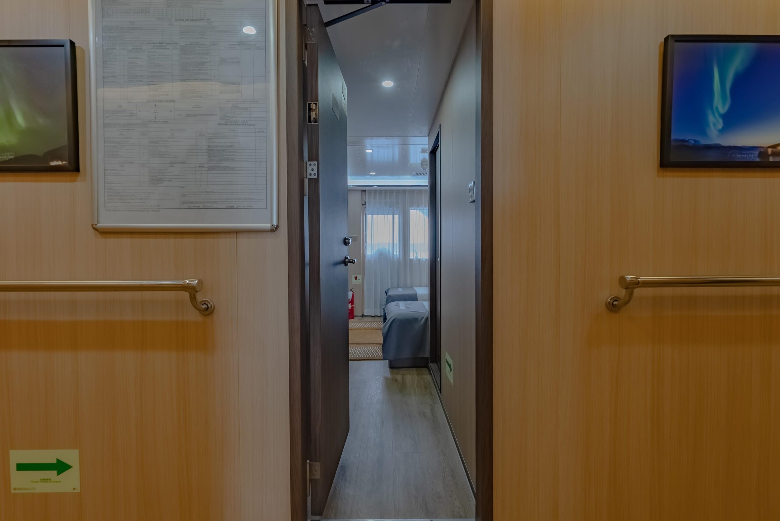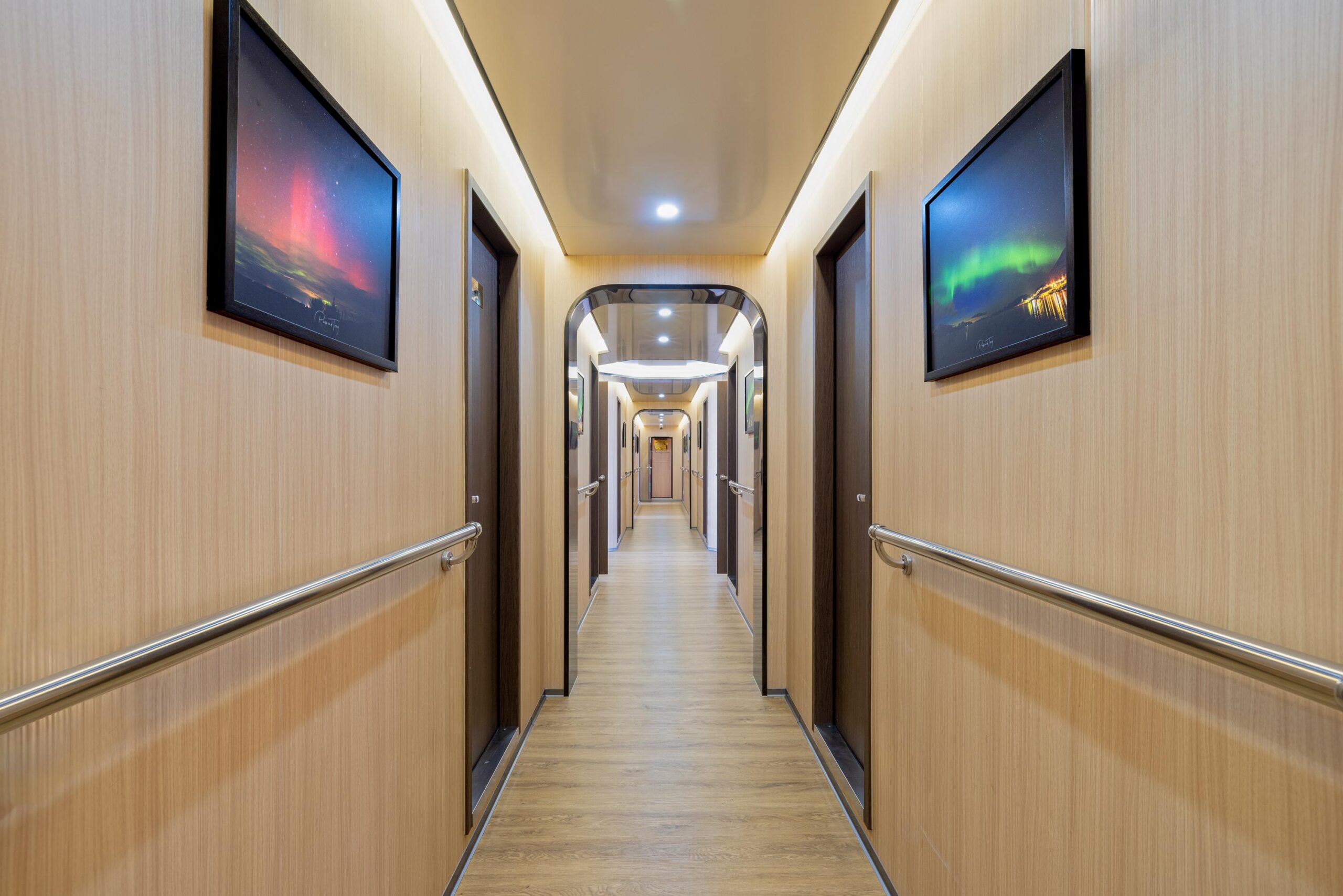 Десять из 15 кают расположены в носовой части салона и соединены впечатляющим центральным коридором: четыре двухместные каюты с балконами, две трансформируемые каюты с двумя кроватями и три трёхместные каюты, идеально подходящие для семей с детьми.
