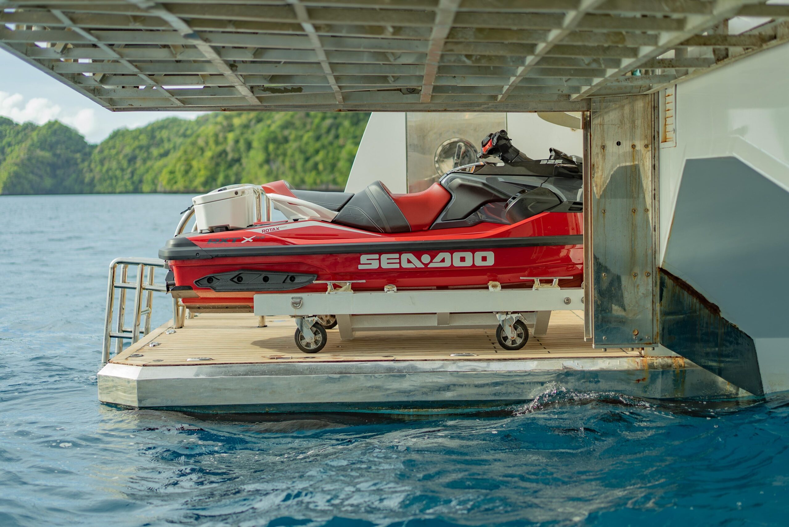 При посадке гости попадают на две просторные купальные платформы, каждая из которых оснащена гаражами с новыми Seadoo 325 RXT.