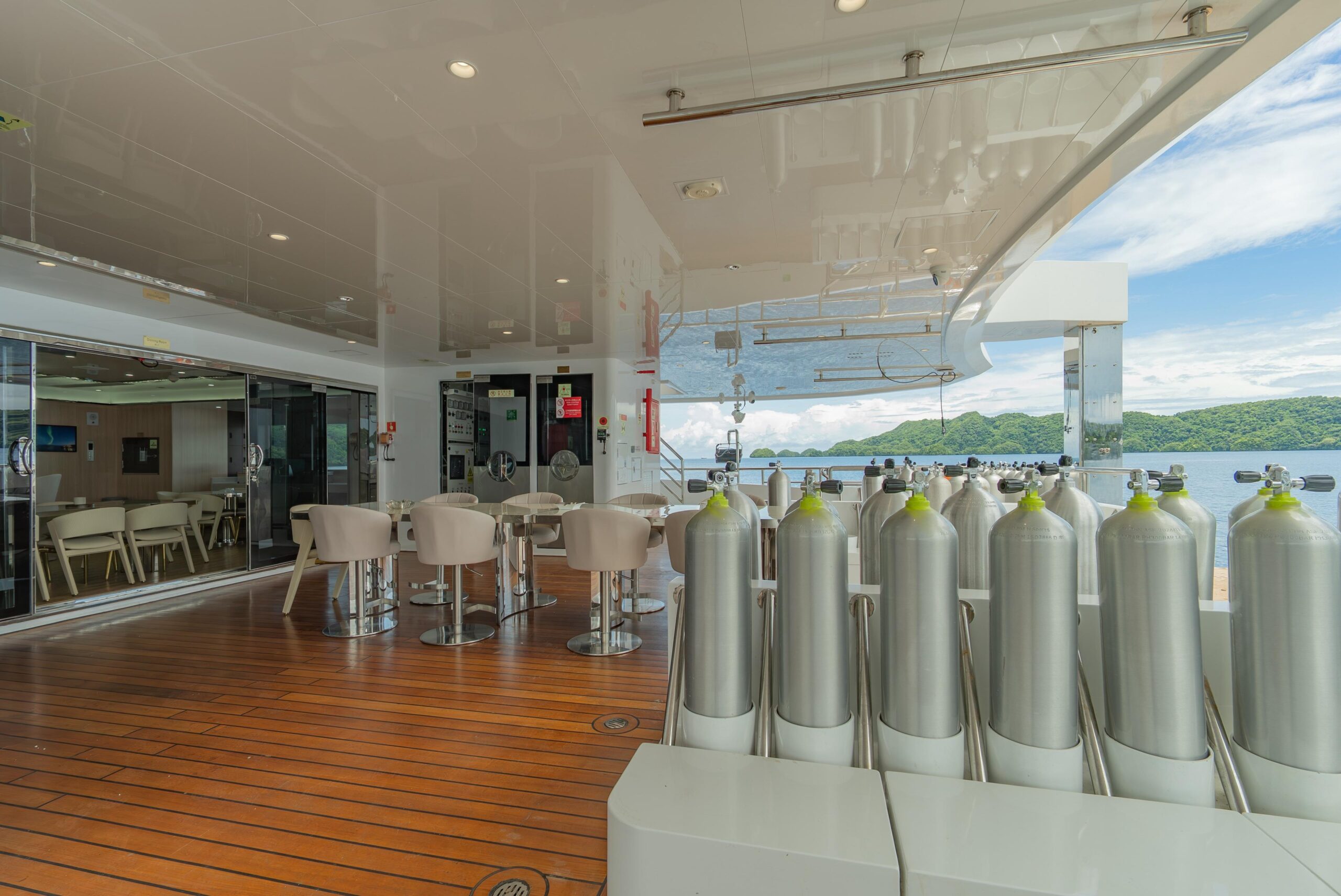 Корма главной палубы служит центром активностей с акцентом на дайвинг. Здесь расположены полностью оборудованный дайв-центр и обеденный стол на 8 человек.