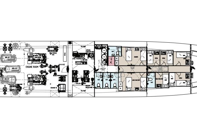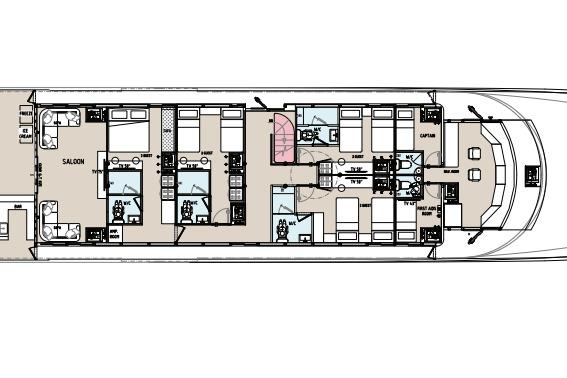 Для капитана предусмотрена отдельная каюта за ходовой рубкой на верхней палубе. Остальные каюты расположены на нижней палубе и включают одноместные каюты и каюты с двухъярусными кроватями. Также предусмотрены специализированные каюты для дайв-мастеров и инструкторов, а также помещения для персонала владельца и гостей.