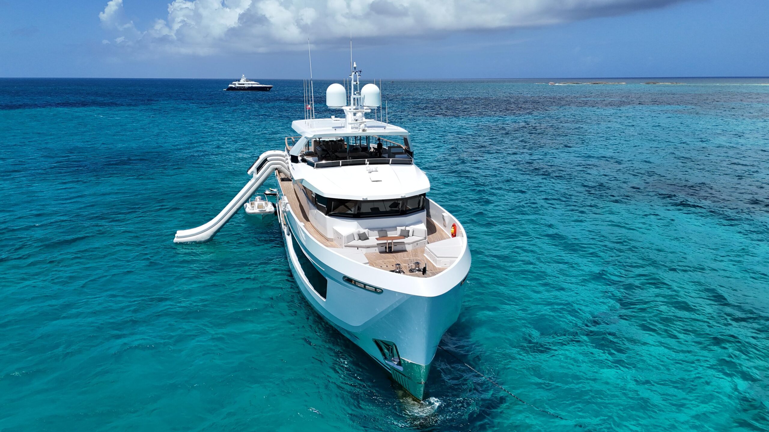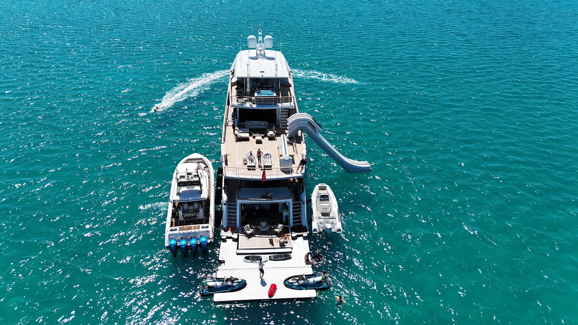 В кормовой части расположен бич-клаб с большой раздвижной дверью, оснащённый льдогенератором, холодильником, дневным санузлом, комбинированной стиральной/сушильной машиной и инструментальной кладовой, обеспечивая максимальное удобство и функциональность.