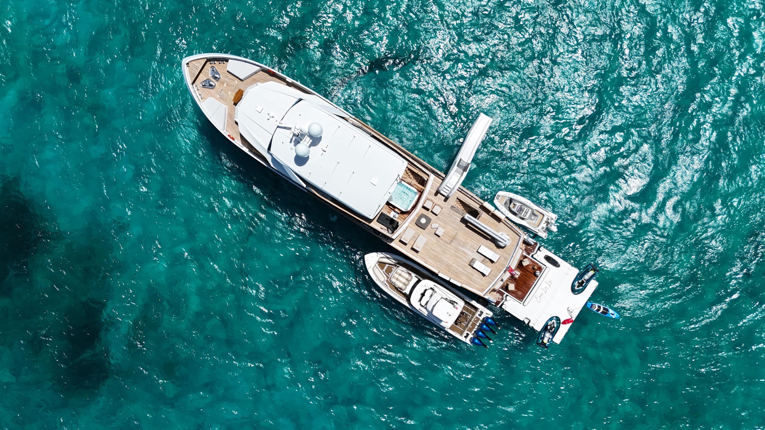 На нижней палубе расположены пять роскошных кают: две VIP-каюты, две каюты с кроватями queen-size и одна каюта с раздельными кроватями, а также прачечная с двумя профессиональными стиральными и сушильными машинами. Скай-лаундж, доступный через раздвижную стеклянную дверь шириной более 6 футов, идеально подходит для приёма гостей и оснащён индивидуальным мокрым баром, телевизором 100" и рабочей зоной. За скай-лаунджем на палубе мостика предусмотрено место для тендера RIB длиной 21 фут, двух гидроциклов Sea-Doo GTI, просторной зоны отдыха и тента от солнца.