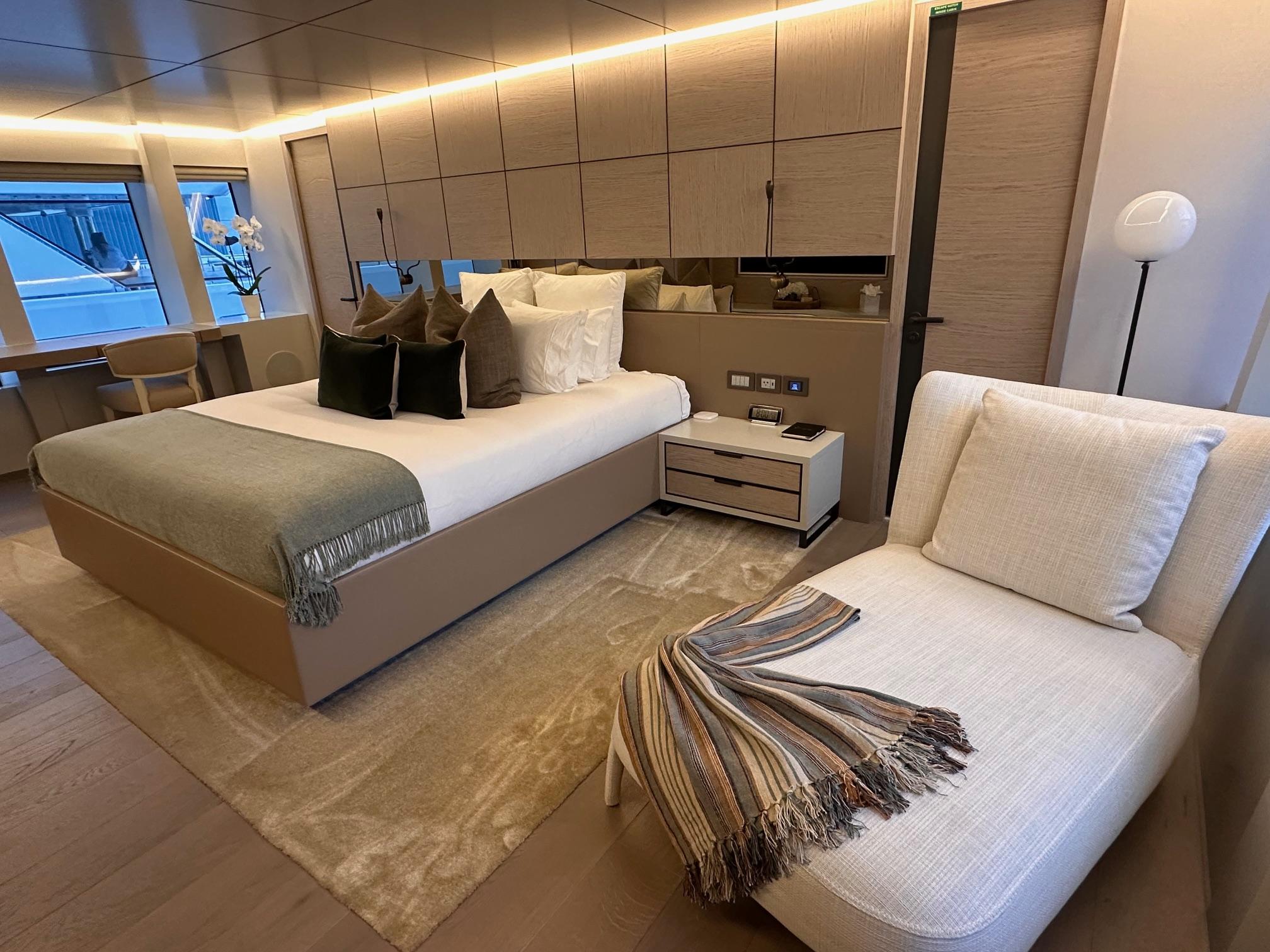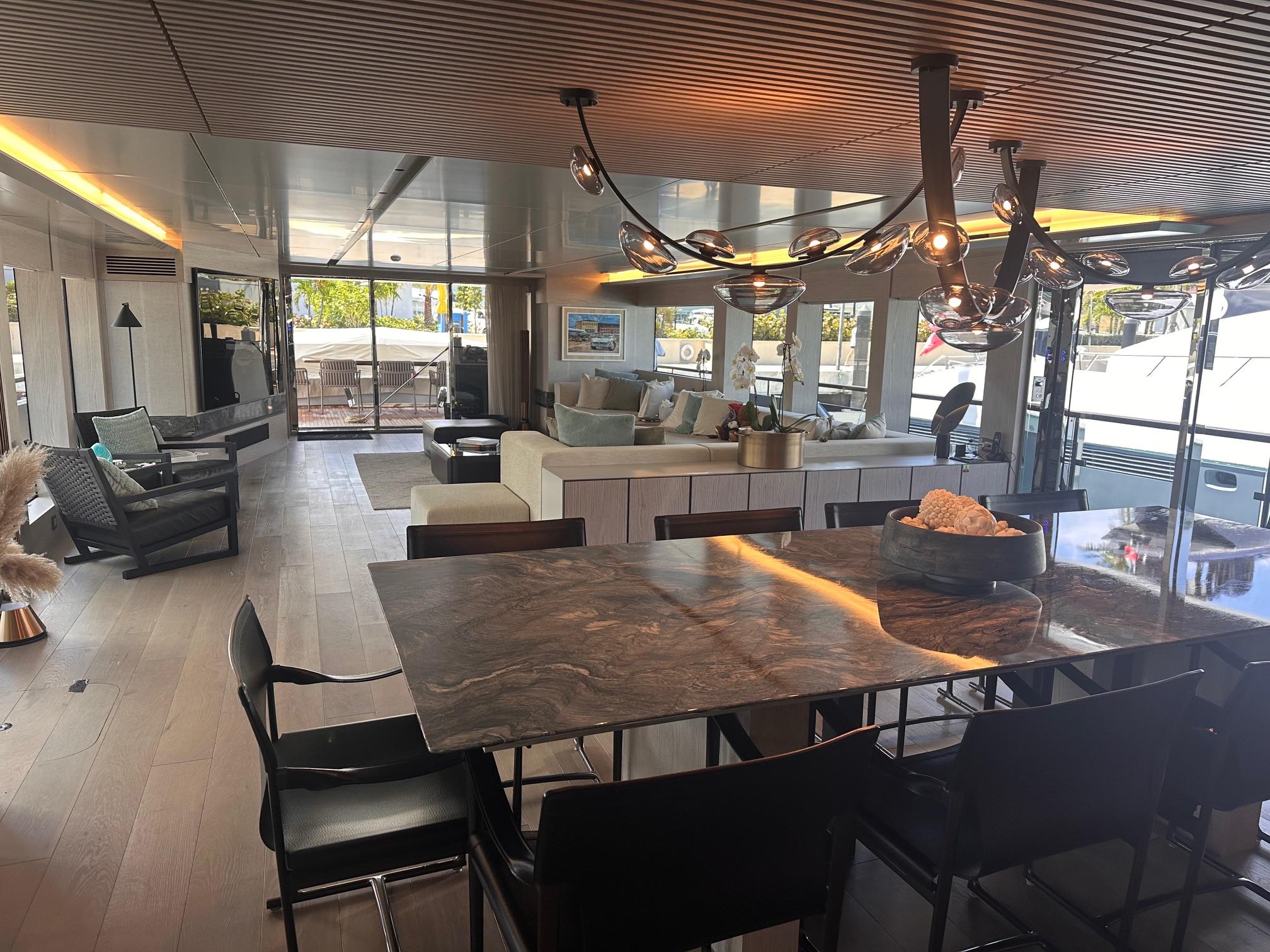 Мастер-каюта на главной палубе во всю ширину корпуса оснащена панорамными окнами, гардеробной и раздельными ванными комнатами «his & hers». Рядом расположен холл с рабочей зоной, имеющий отдельный вход из главного салона. Кормовая часть главной палубы оборудована баром с льдогенератором, холодильными ящиками, просторным лежаком для загара и лакированным тиком обеденным столом.