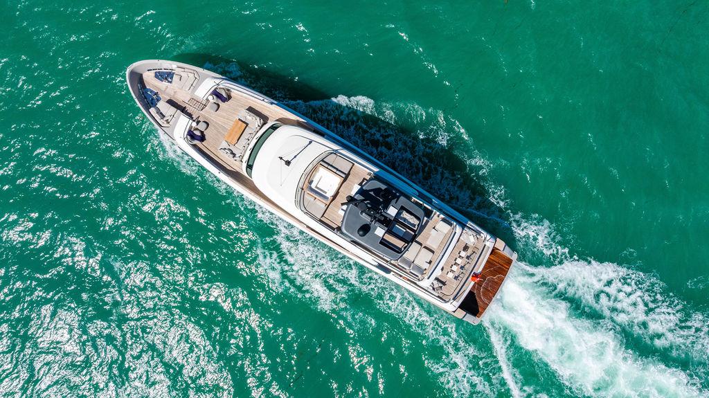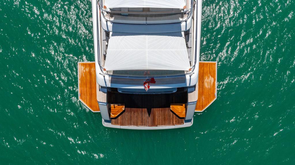 • Корма и Beach Club: На якоре корма превращается в beach club площадью около 20 м²: откидные боковые террасы создают широкую платформу у воды. Центральная гидравлическая секция транца опускается в море, облегчая спуск водных игрушек и тендеров.