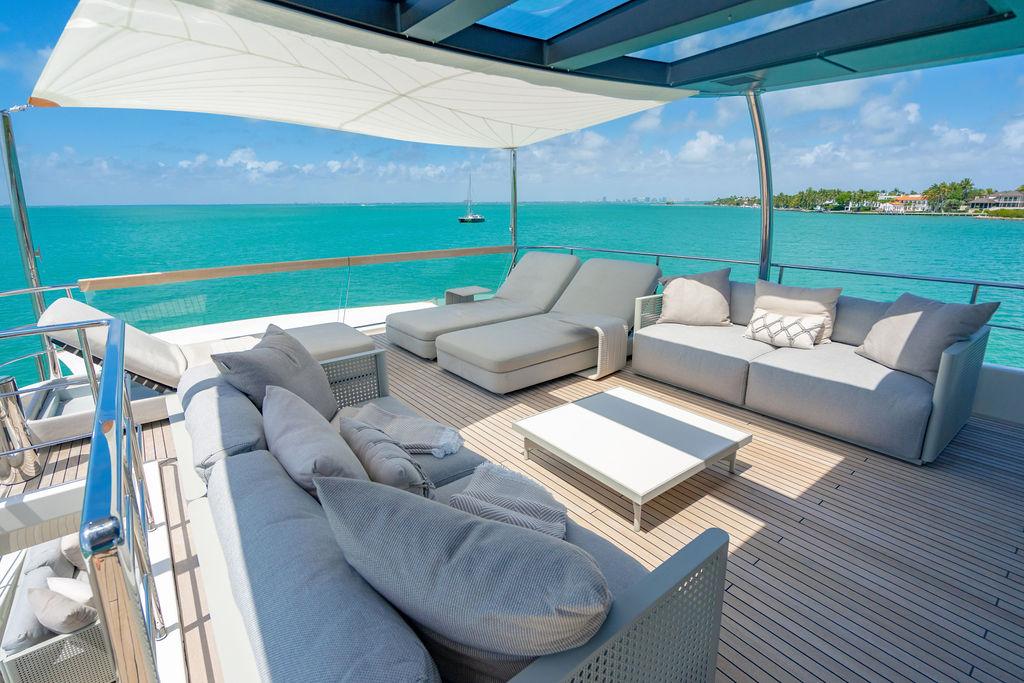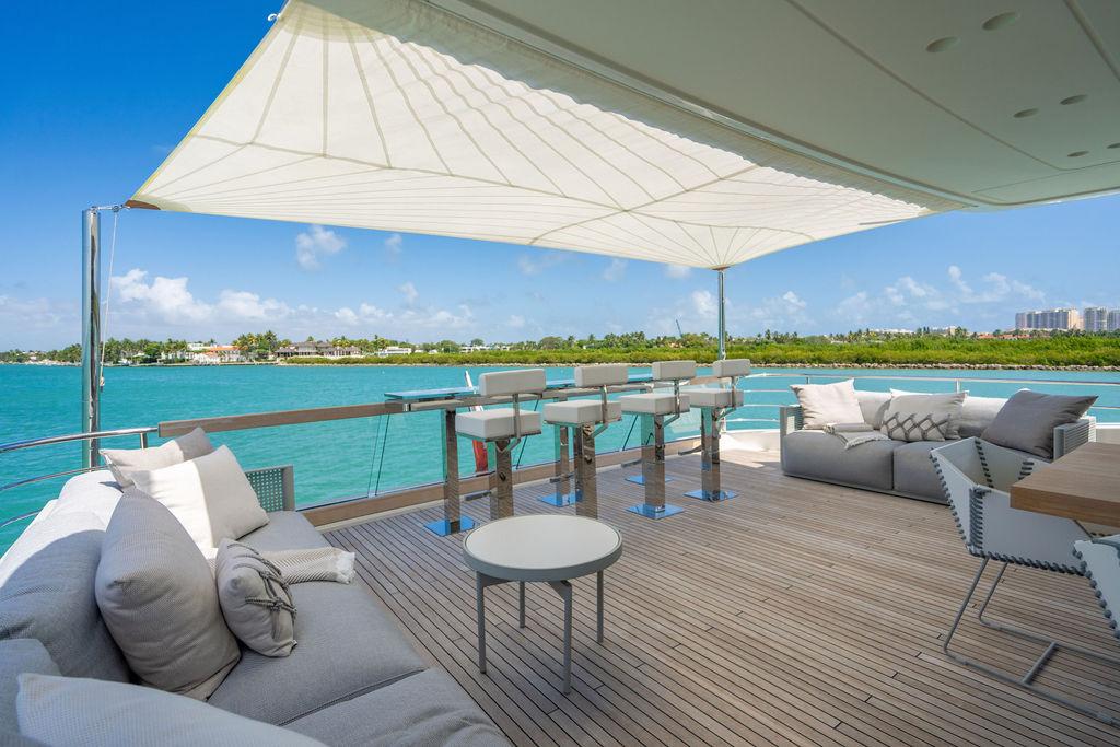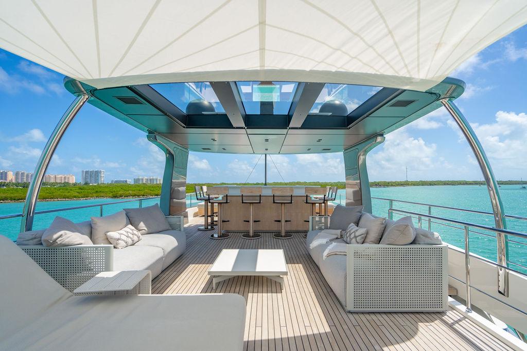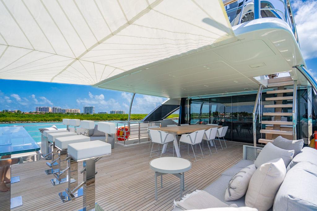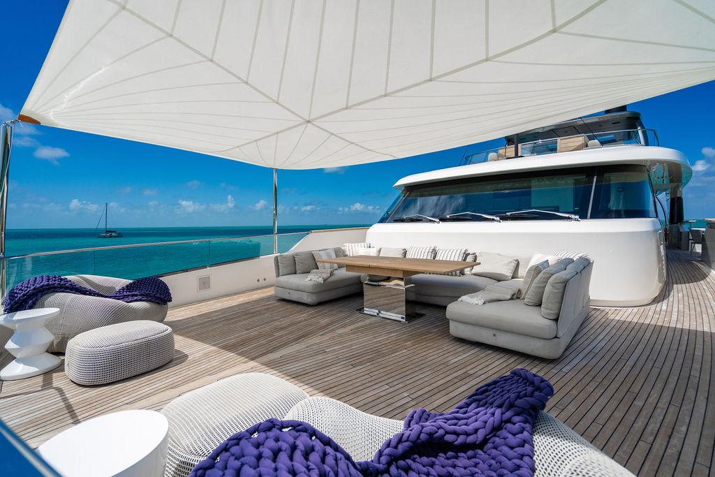• Солнечная палуба: Верхняя «корона» яхты — sundeck для загара и неформальных приёмов у бара, с превосходными видами и джакузи.
