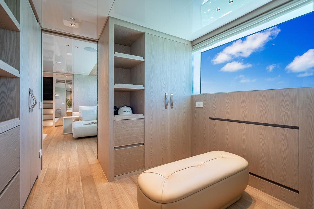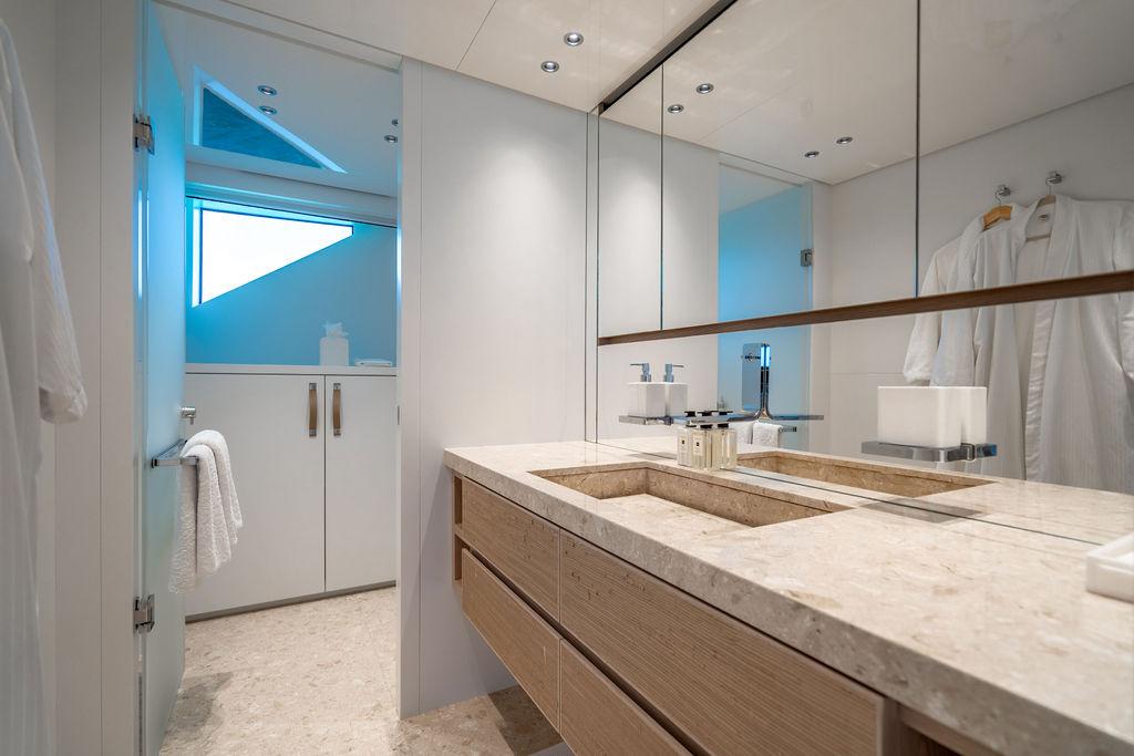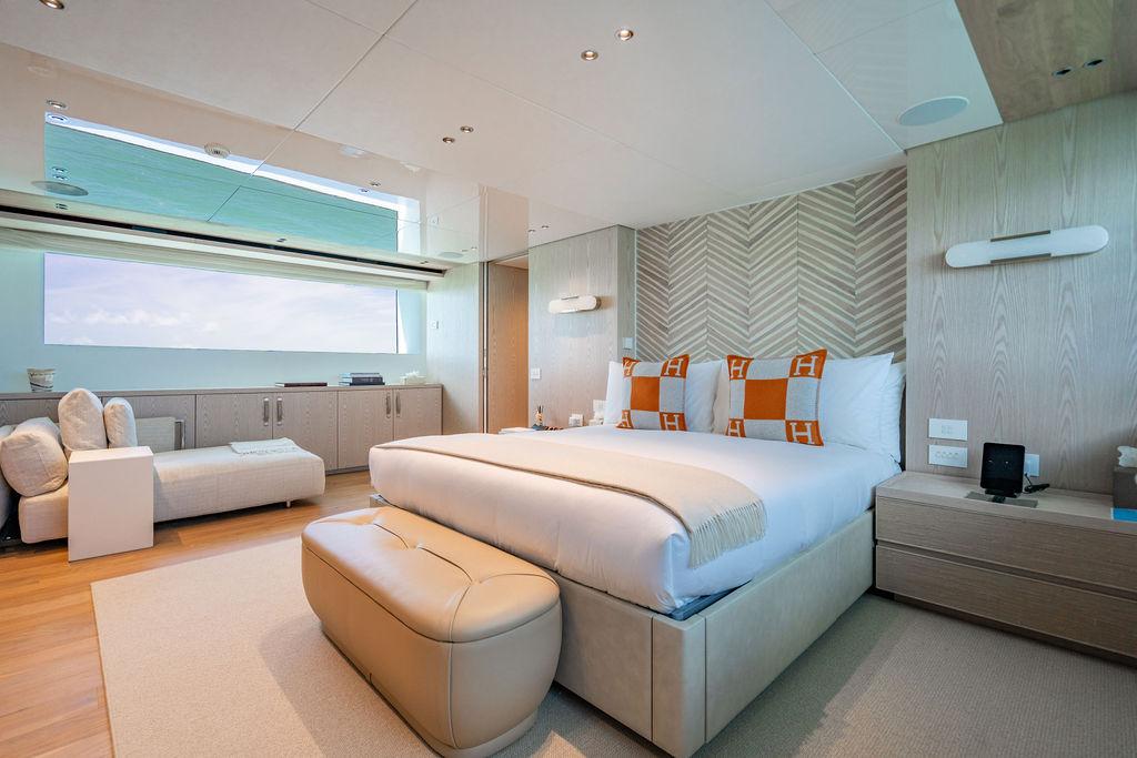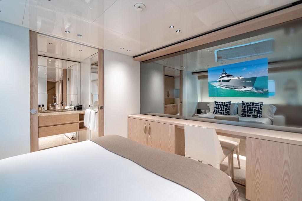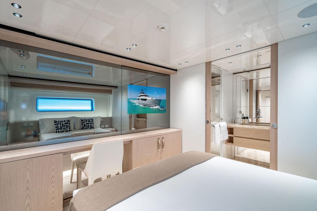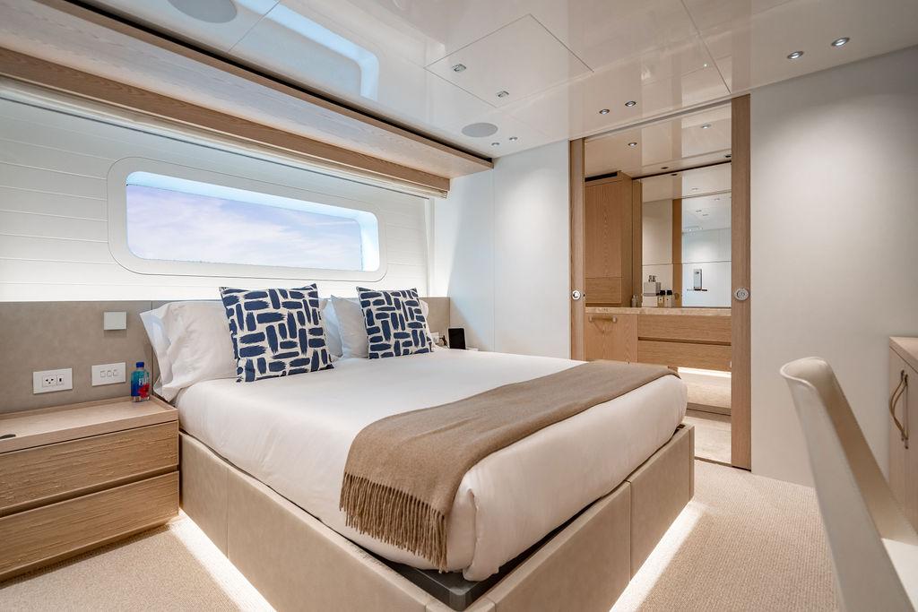 • Мастер-сьют (каюта владельца): Расположен впереди на главной палубе, full-beam. Кровать с обходом расположена чуть ближе к левому борту, просторная гардеробная, зона отдыха по правому борту. Рабочая зона с видом на воду — по левому борту. Ванная — с отдельными зонами туалета и душа, разделёнными раздвижной стеклянной дверью. Приватная лестница ведёт прямо на носовую палубу.