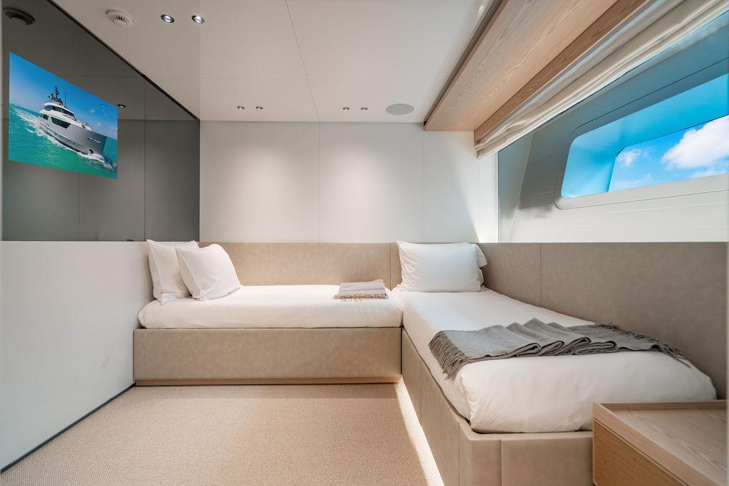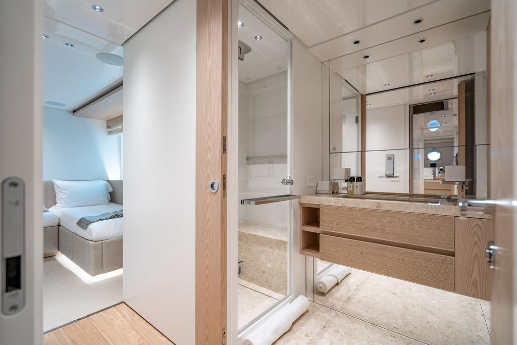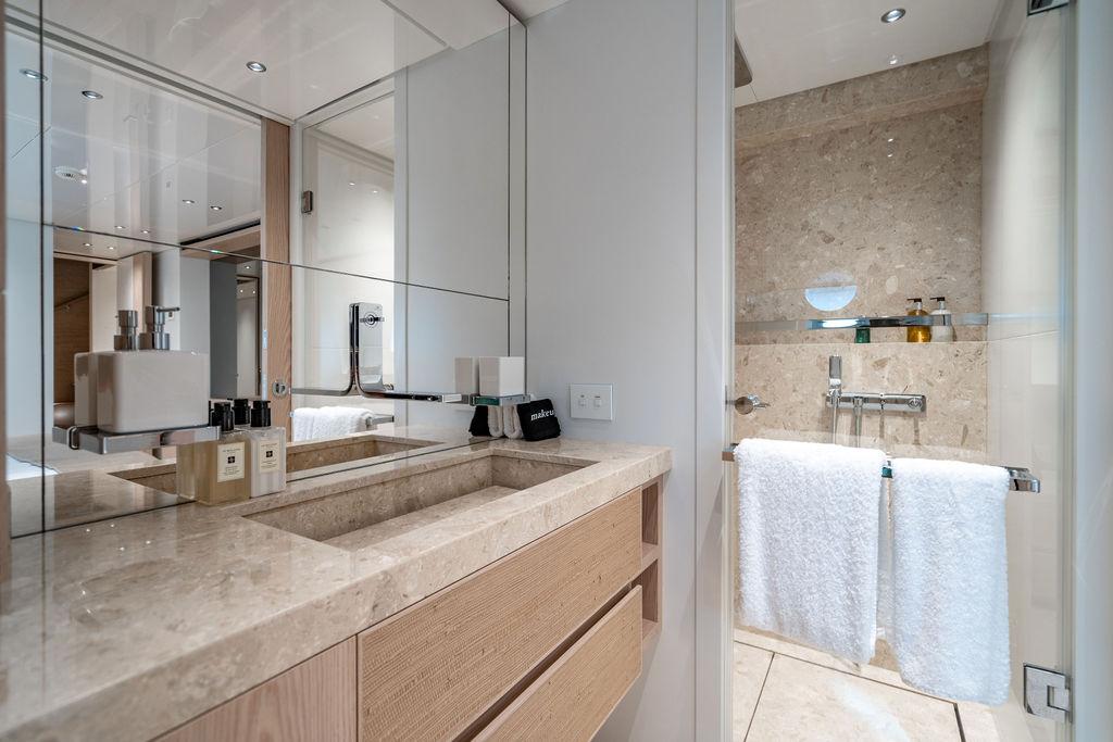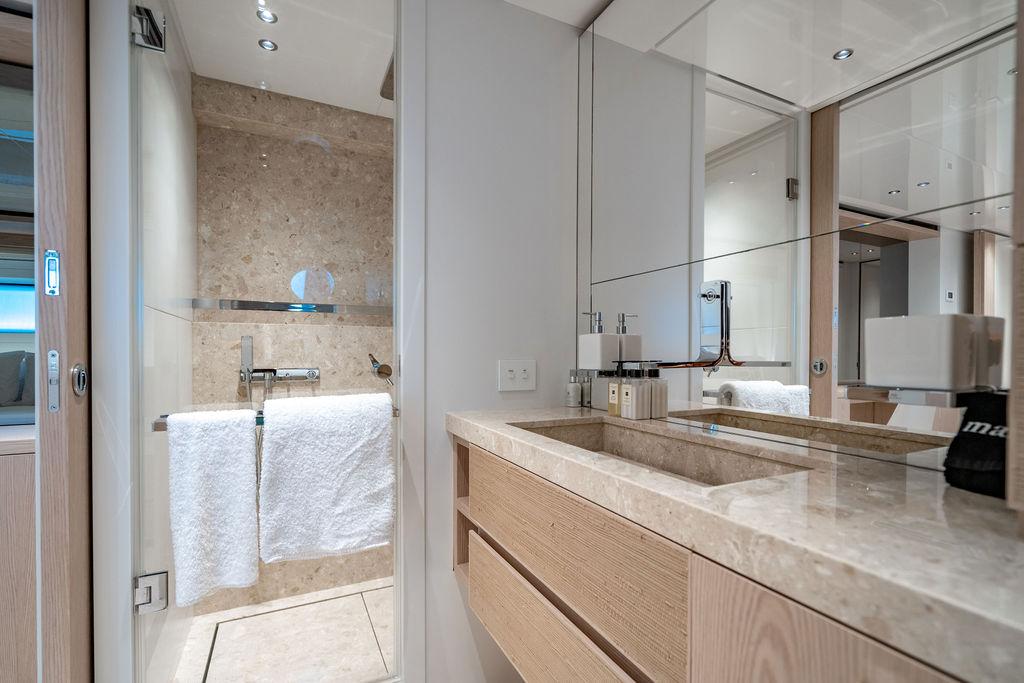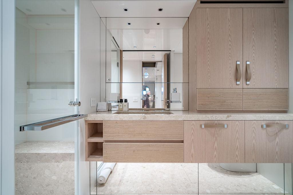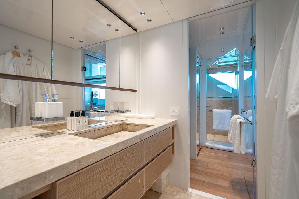 • Мастер-сьют (каюта владельца): Расположен впереди на главной палубе, full-beam. Кровать с обходом расположена чуть ближе к левому борту, просторная гардеробная, зона отдыха по правому борту. Рабочая зона с видом на воду — по левому борту. Ванная — с отдельными зонами туалета и душа, разделёнными раздвижной стеклянной дверью. Приватная лестница ведёт прямо на носовую палубу.