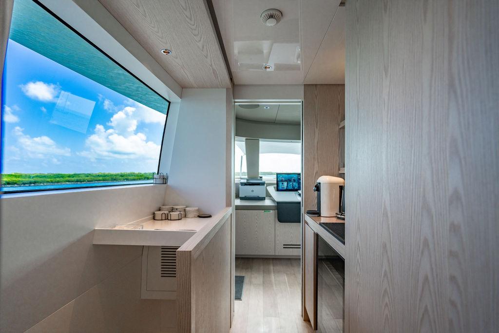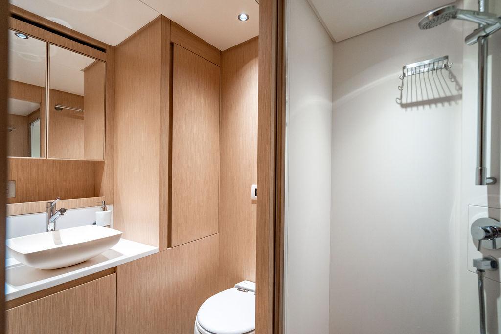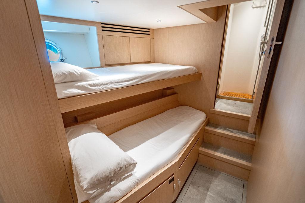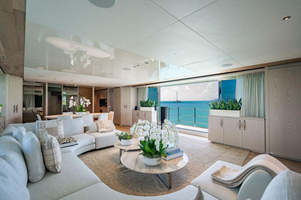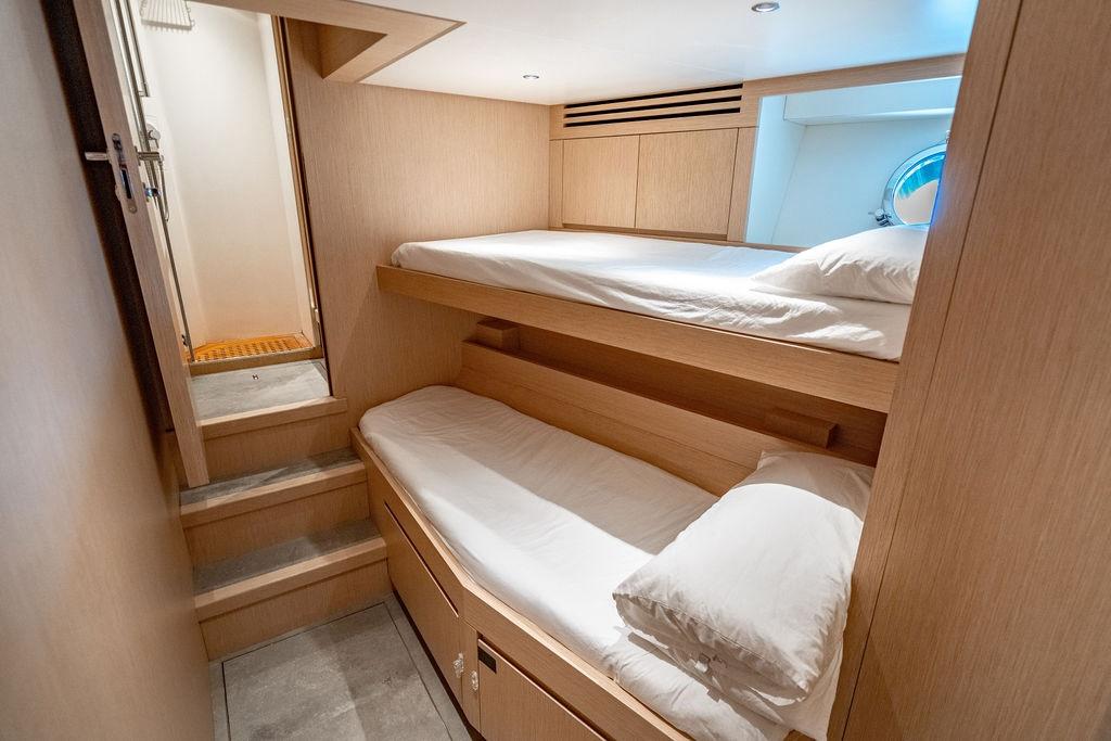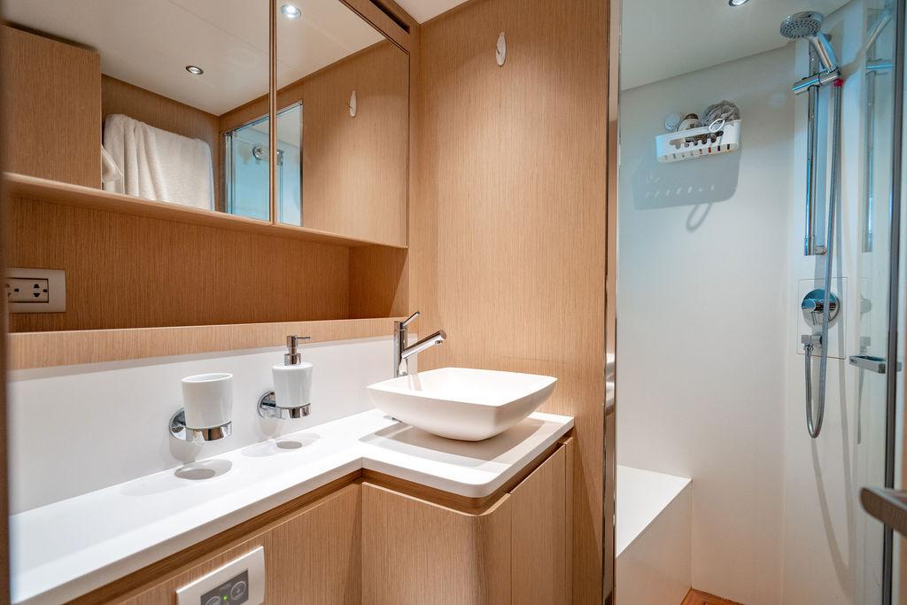 • Мастер-сьют (каюта владельца): Расположен впереди на главной палубе, full-beam. Кровать с обходом расположена чуть ближе к левому борту, просторная гардеробная, зона отдыха по правому борту. Рабочая зона с видом на воду — по левому борту. Ванная — с отдельными зонами туалета и душа, разделёнными раздвижной стеклянной дверью. Приватная лестница ведёт прямо на носовую палубу.