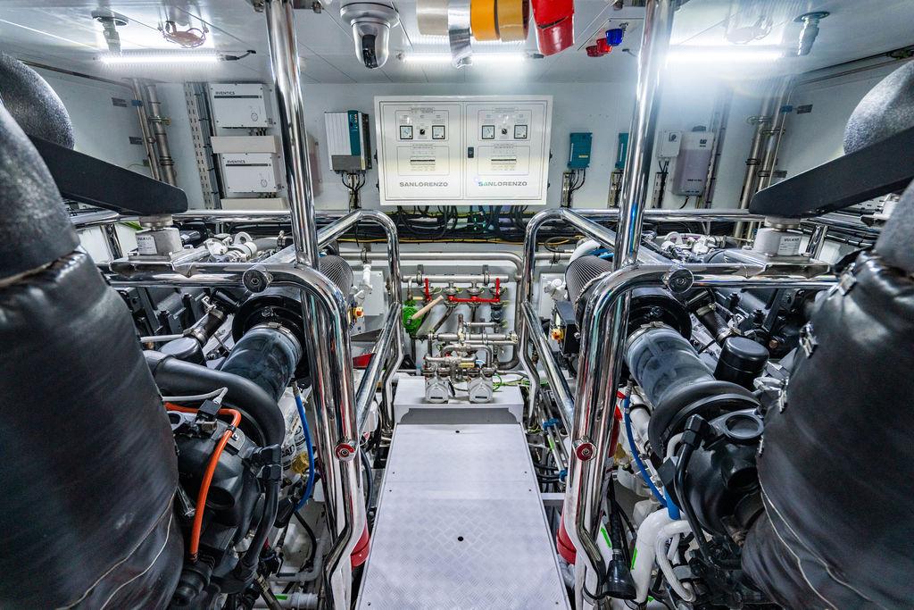 • Двигатели: Два CAT C32 по 1 622 л.с. каждый обеспечивают максимальную скорость 18 узлов, крейсерскую 14 узлов и максимальную дальность порядка 3 000 морских миль при экономичном ходе 11 узлов.