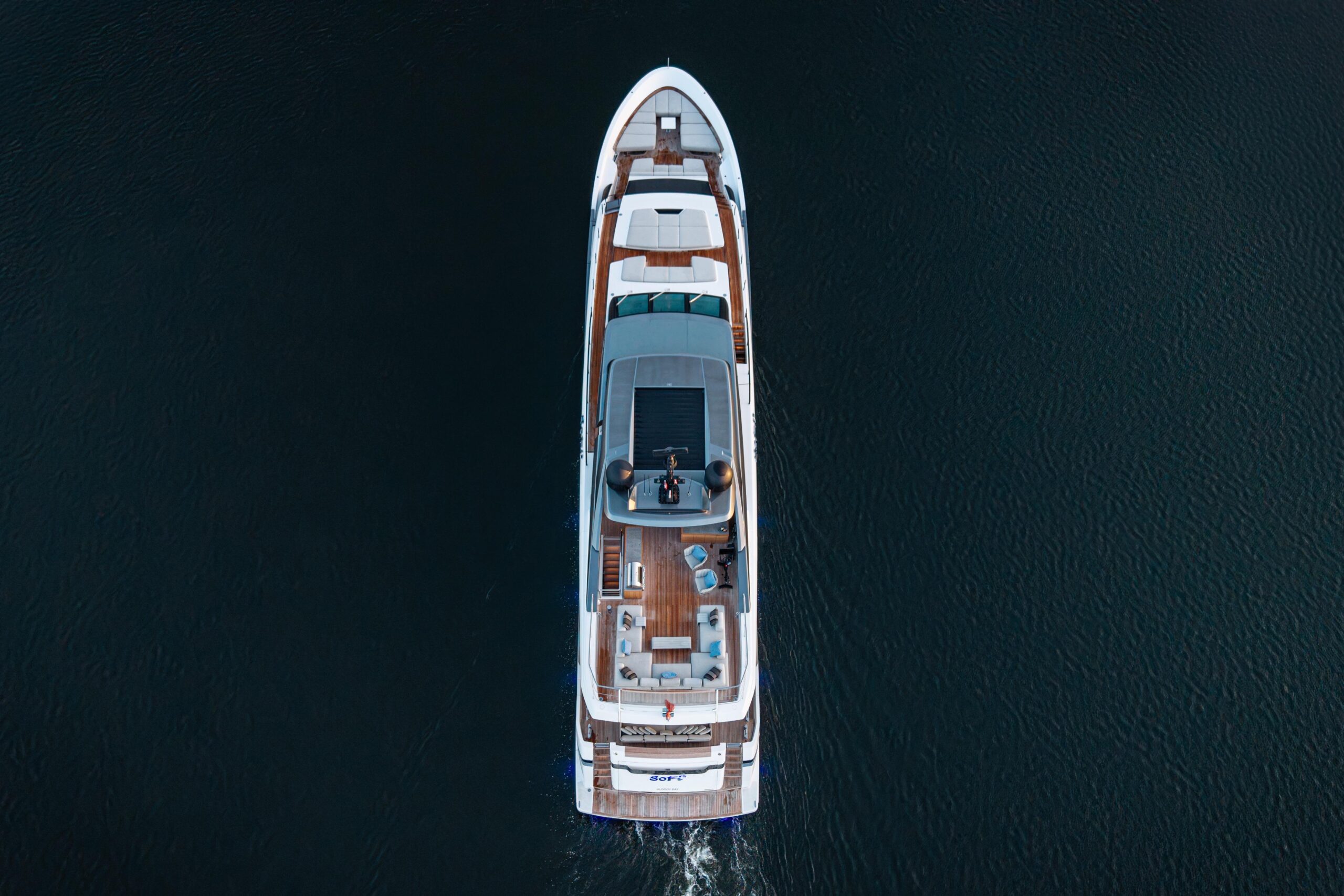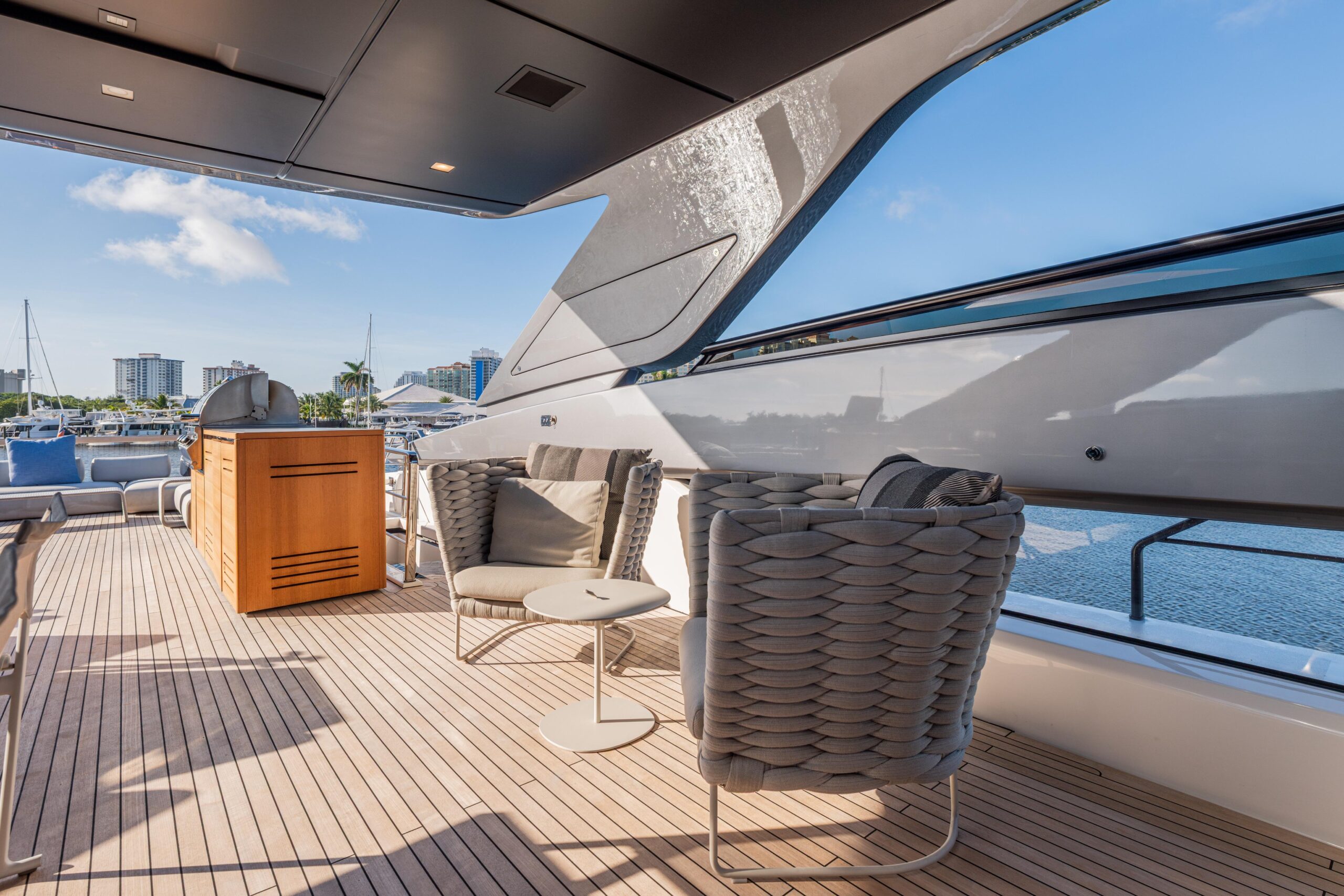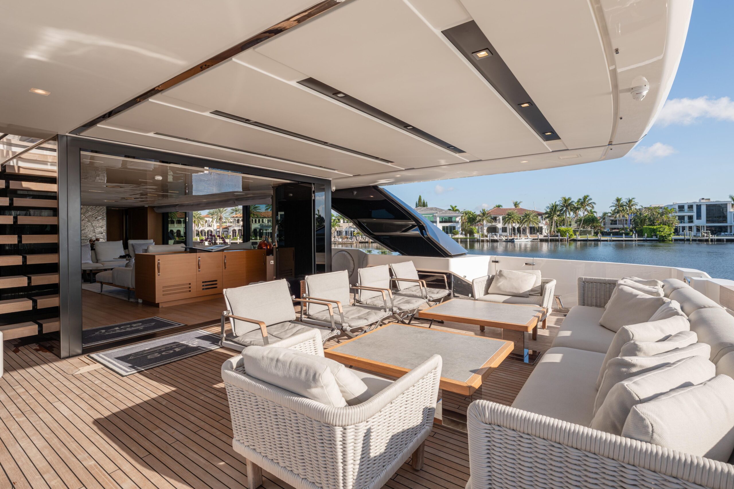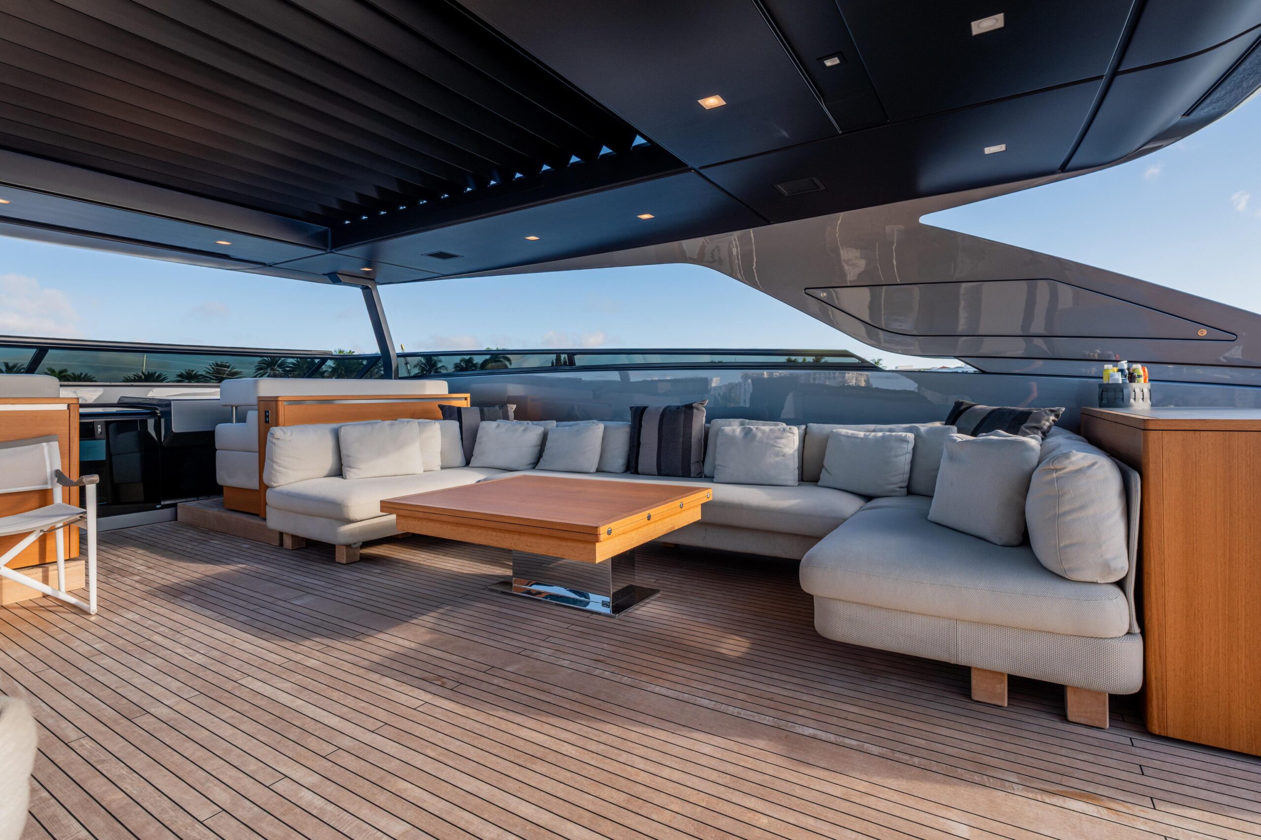 Яхта располагает несколькими зонами отдыха на открытом воздухе, включая просторный флайбридж и хорошо оборудованную кормовую палубу, идеально подходящие для принятия солнечных ванн, ужинов и наслаждения видами. Гидравлическая купальная платформа обеспечивает удобный доступ к воде для купания и водных развлечений.