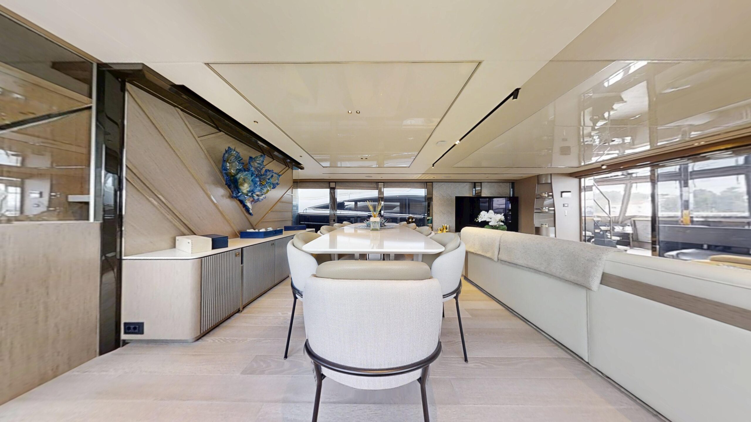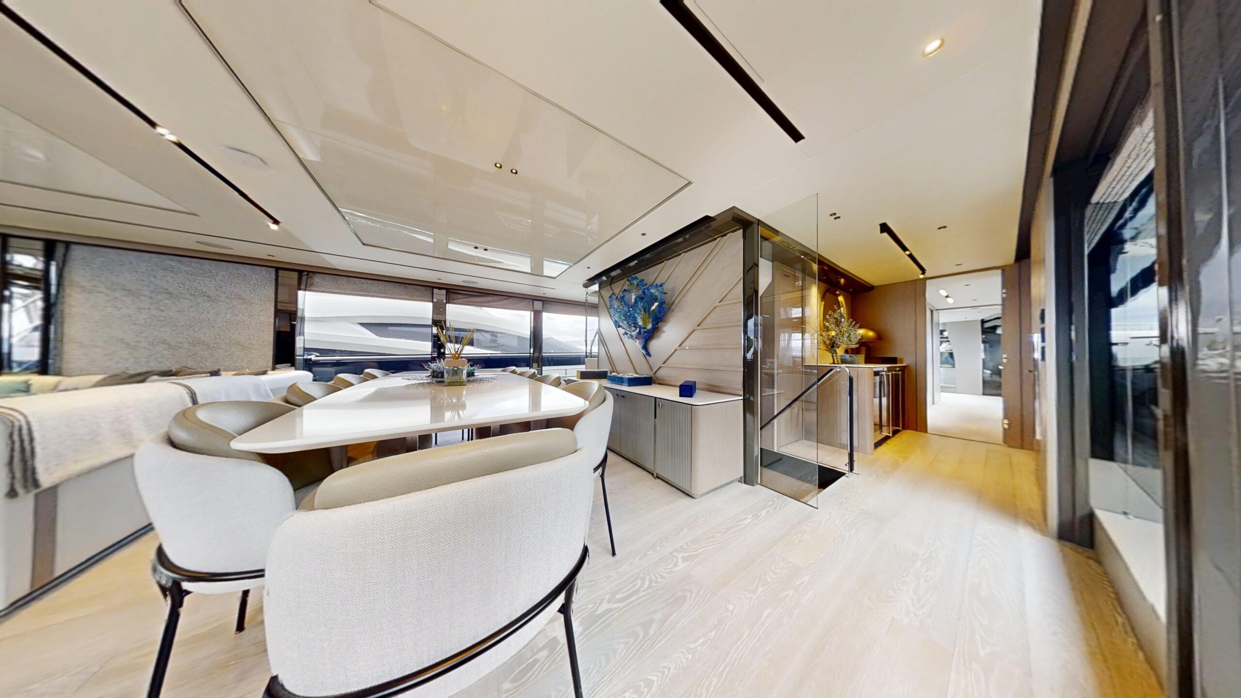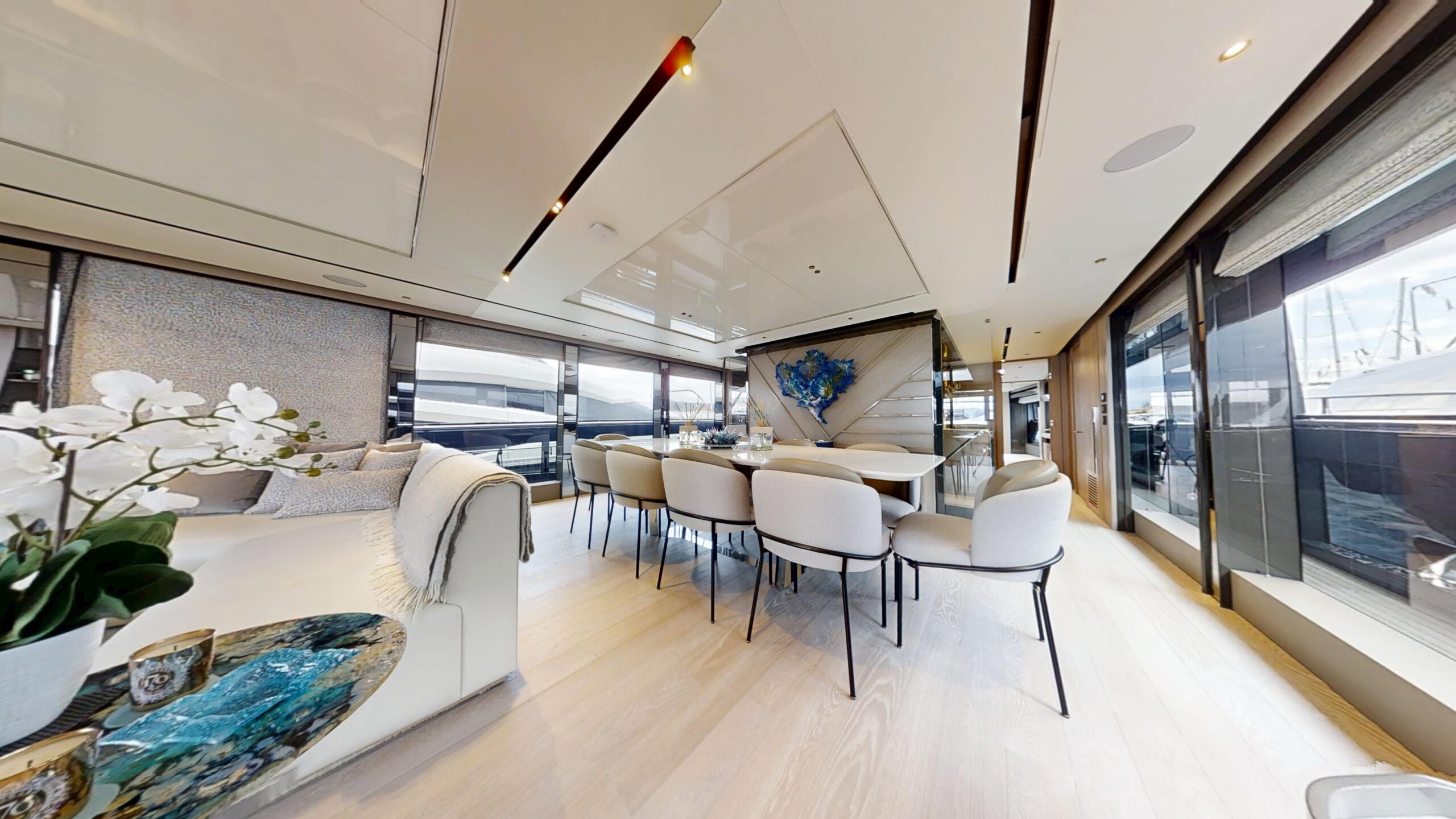 Салон оформлен в стиле пентхауса с окнами от пола до потолка, электрическими жалюзи, индивидуальным обеденным столом из кварца и премиальными AV-системами по всей яхте.