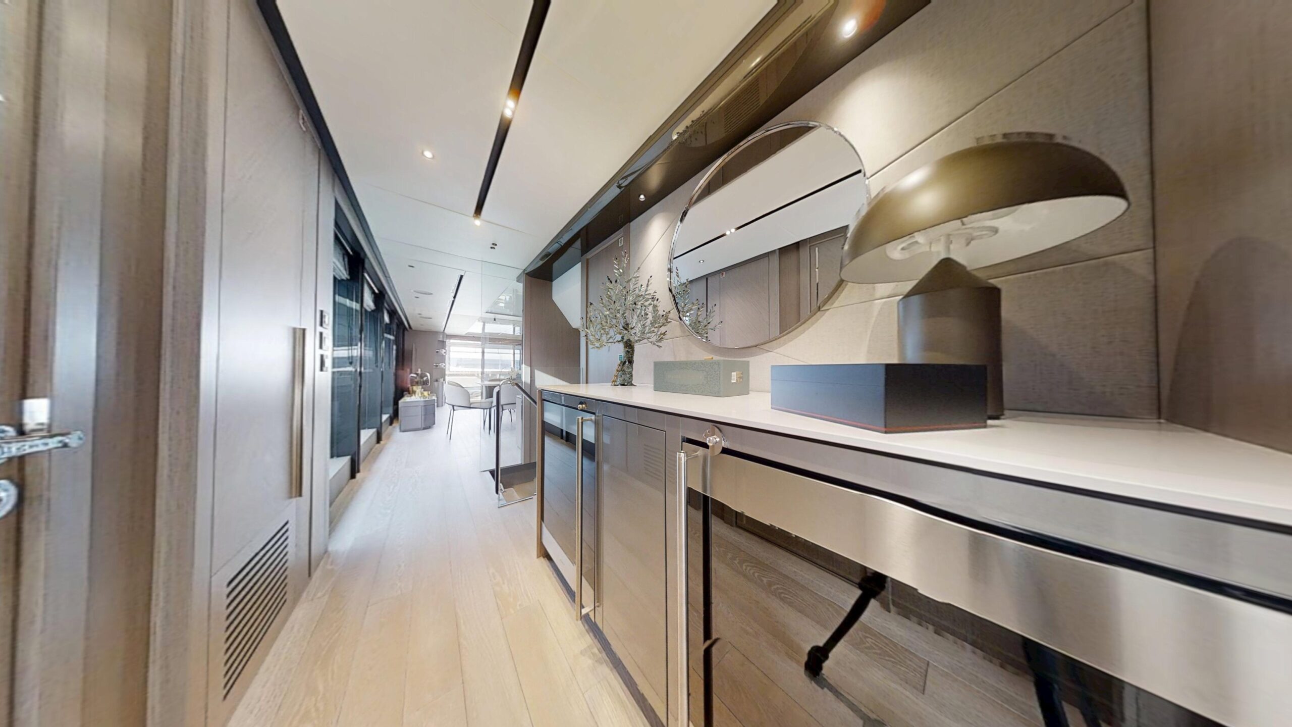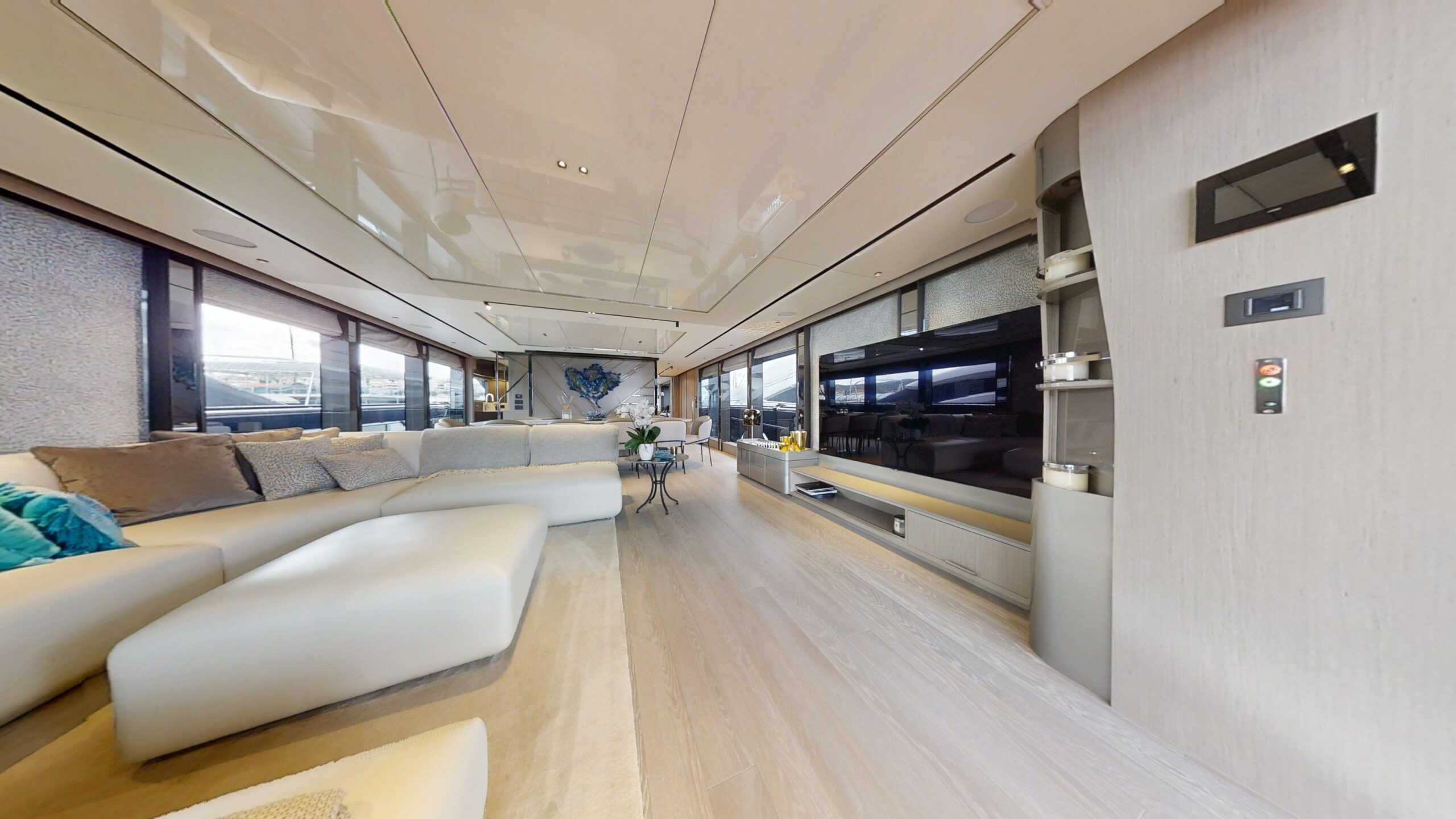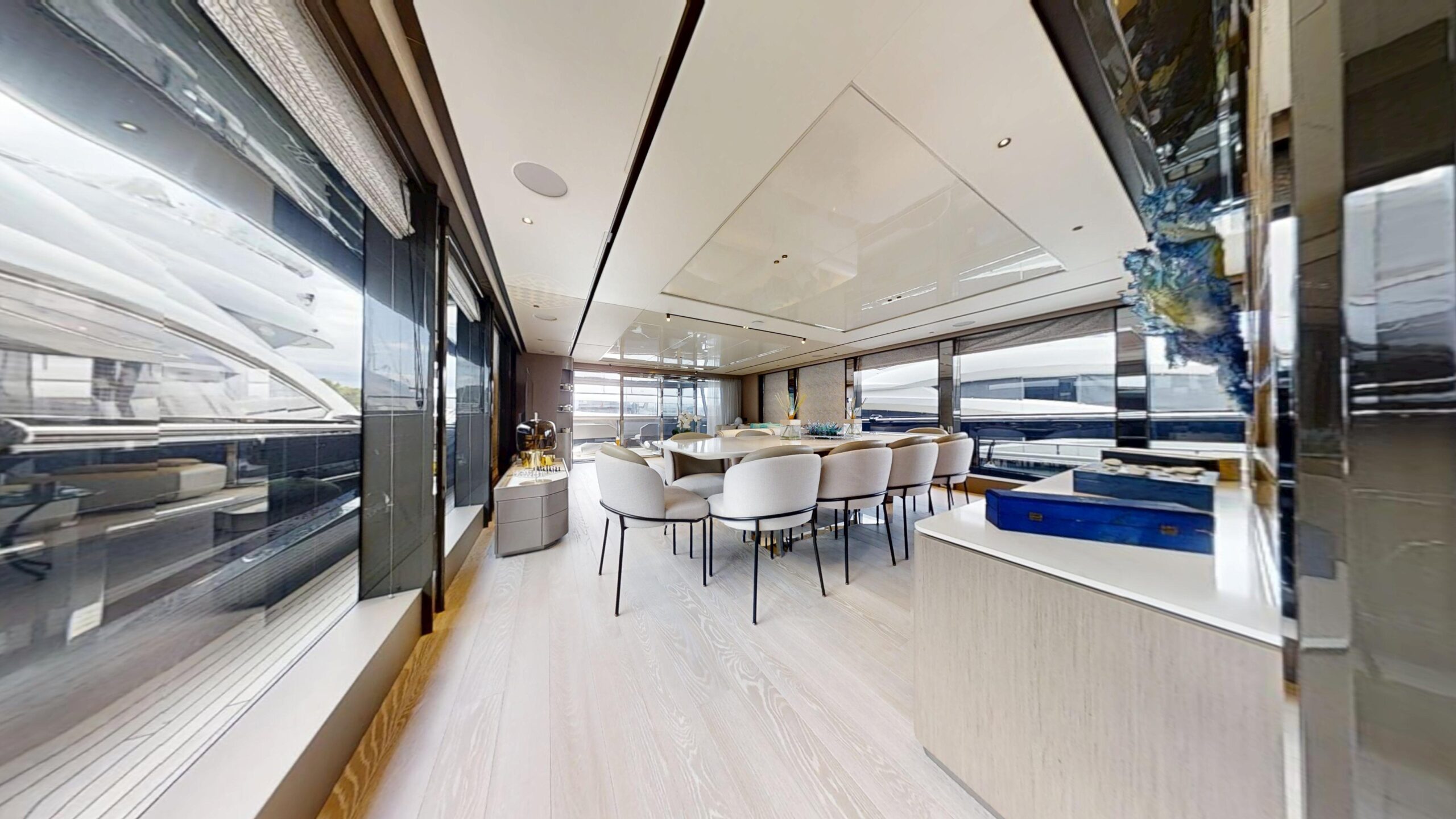 Салон оформлен в стиле пентхауса с окнами от пола до потолка, электрическими жалюзи, индивидуальным обеденным столом из кварца и премиальными AV-системами по всей яхте.