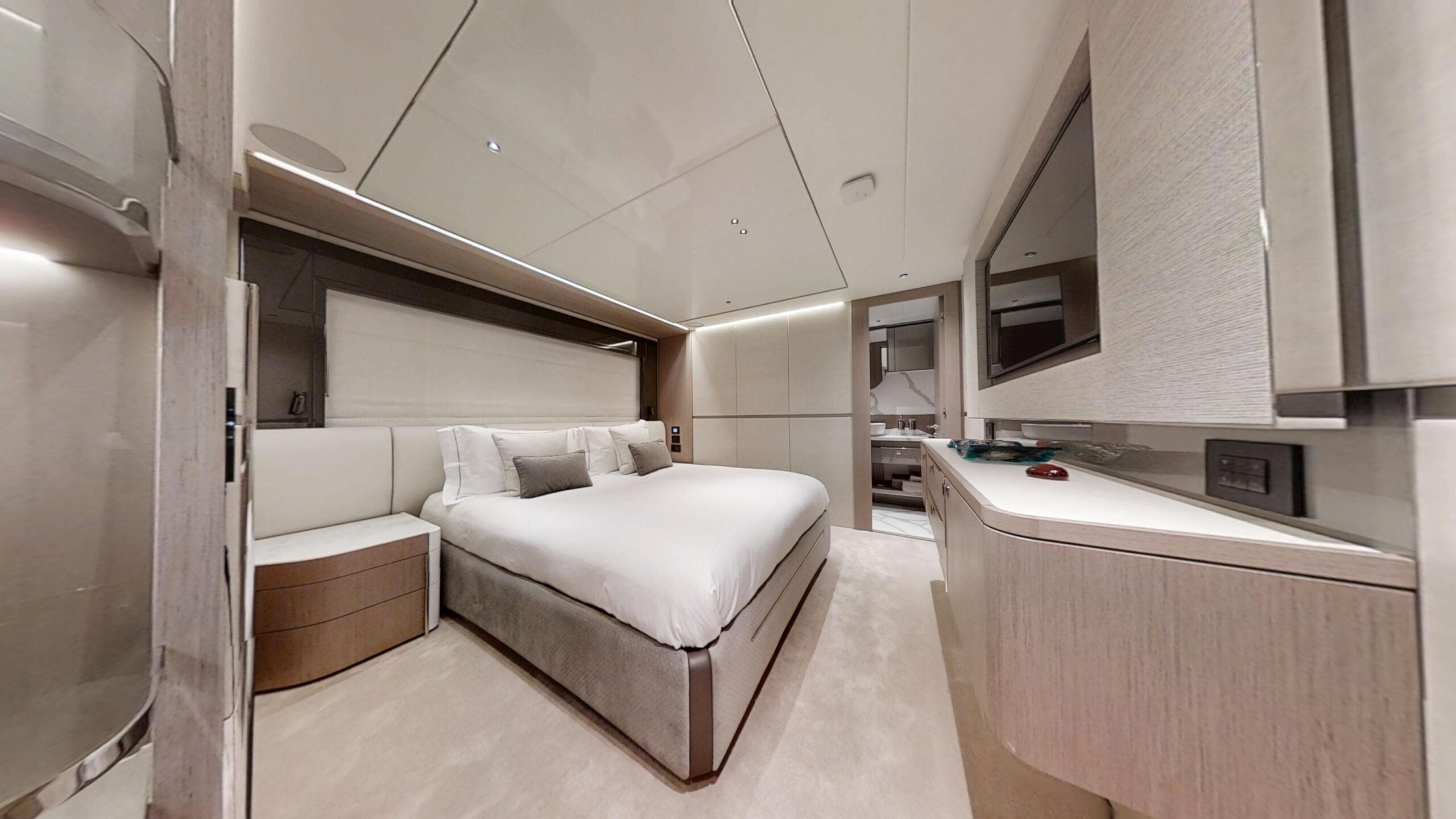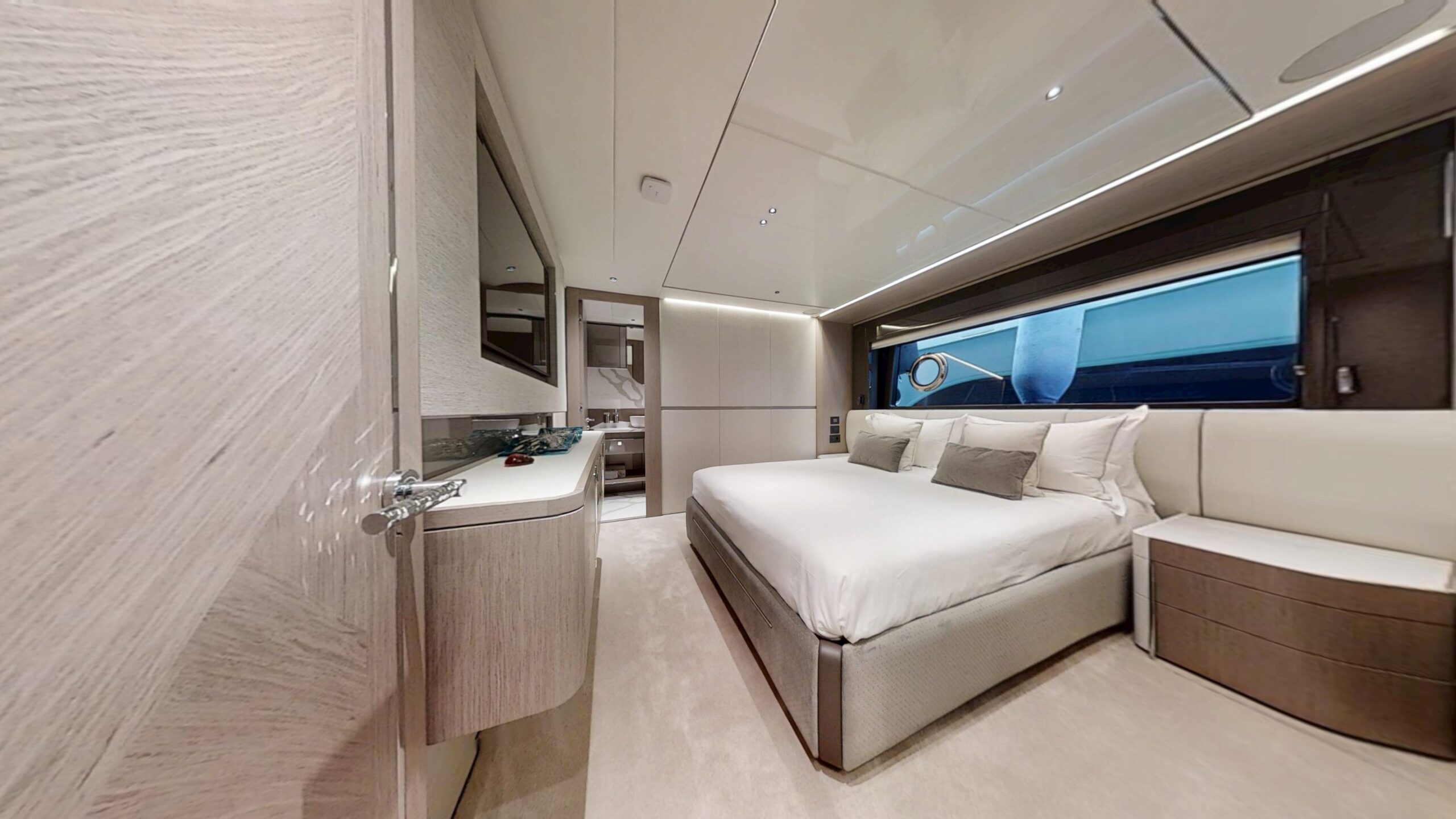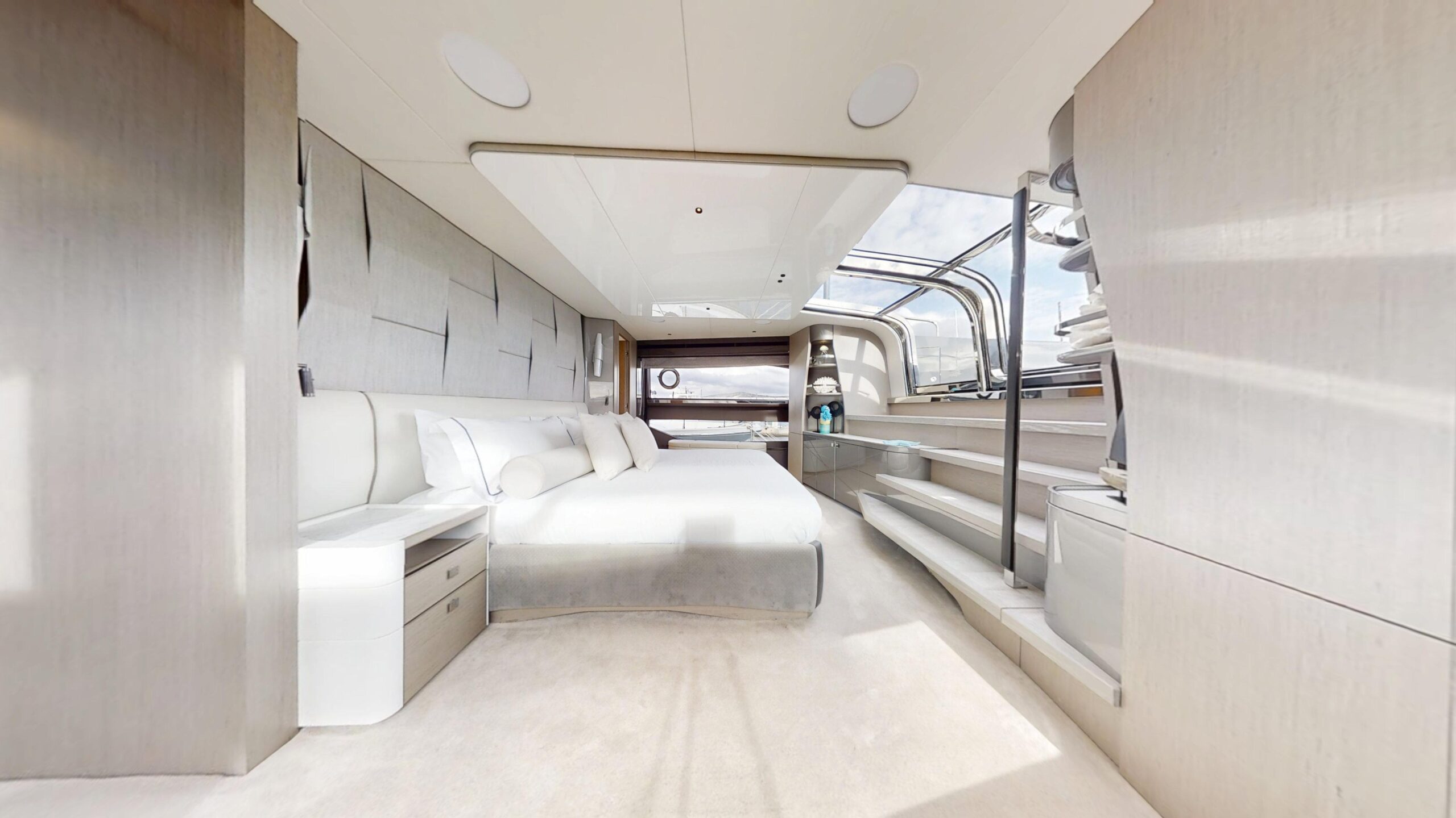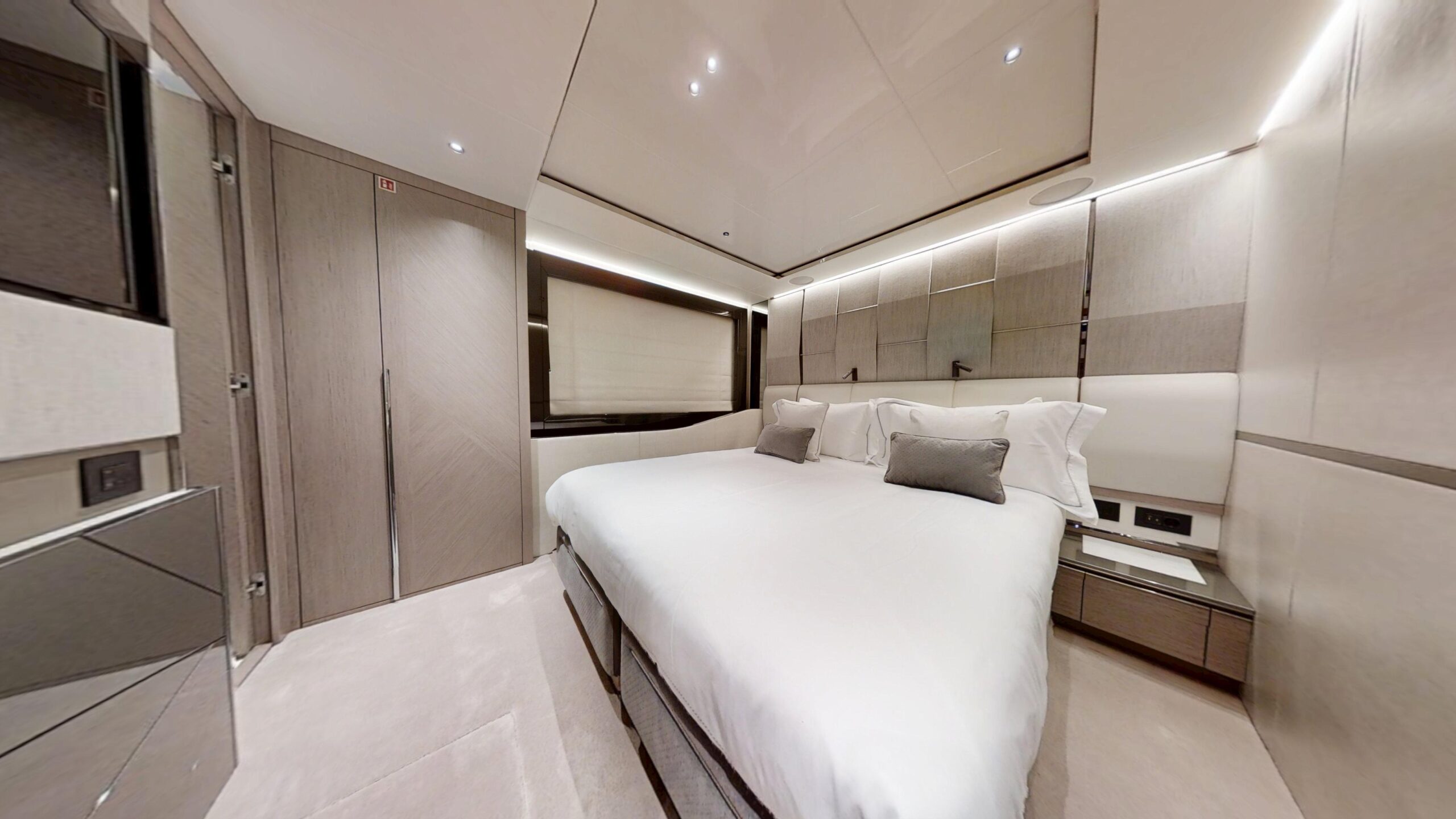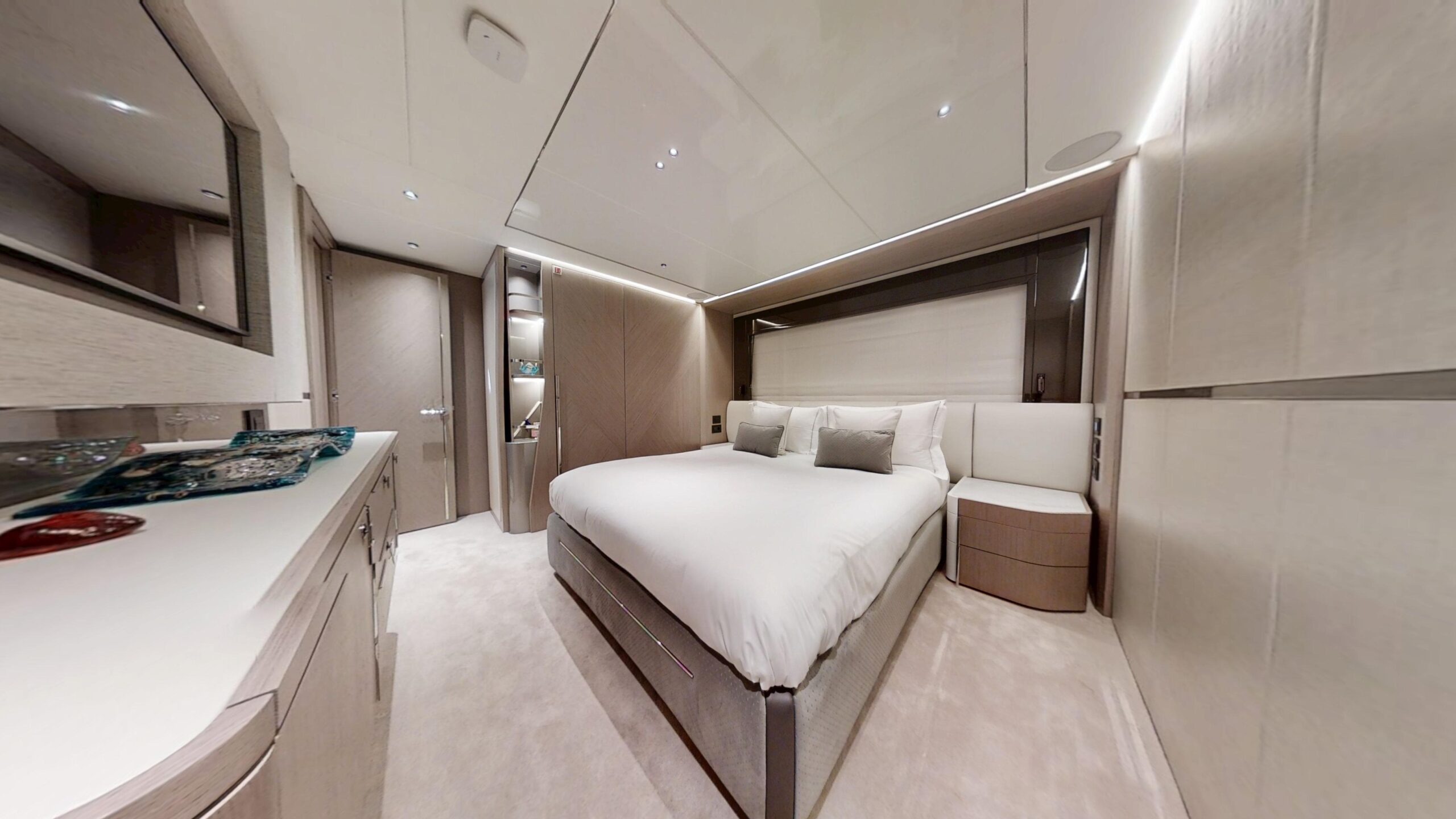 Безусловной изюминкой является мастер-каюта во всю ширину корпуса на главной палубе — с панорамными видами, частной носовой террасой, гардеробной и встроенным рабочим/туалетным столиком. Четыре дополнительные гостевые каюты на нижней палубе обеспечивают комфорт и универсальность для семьи или чартерного использования.