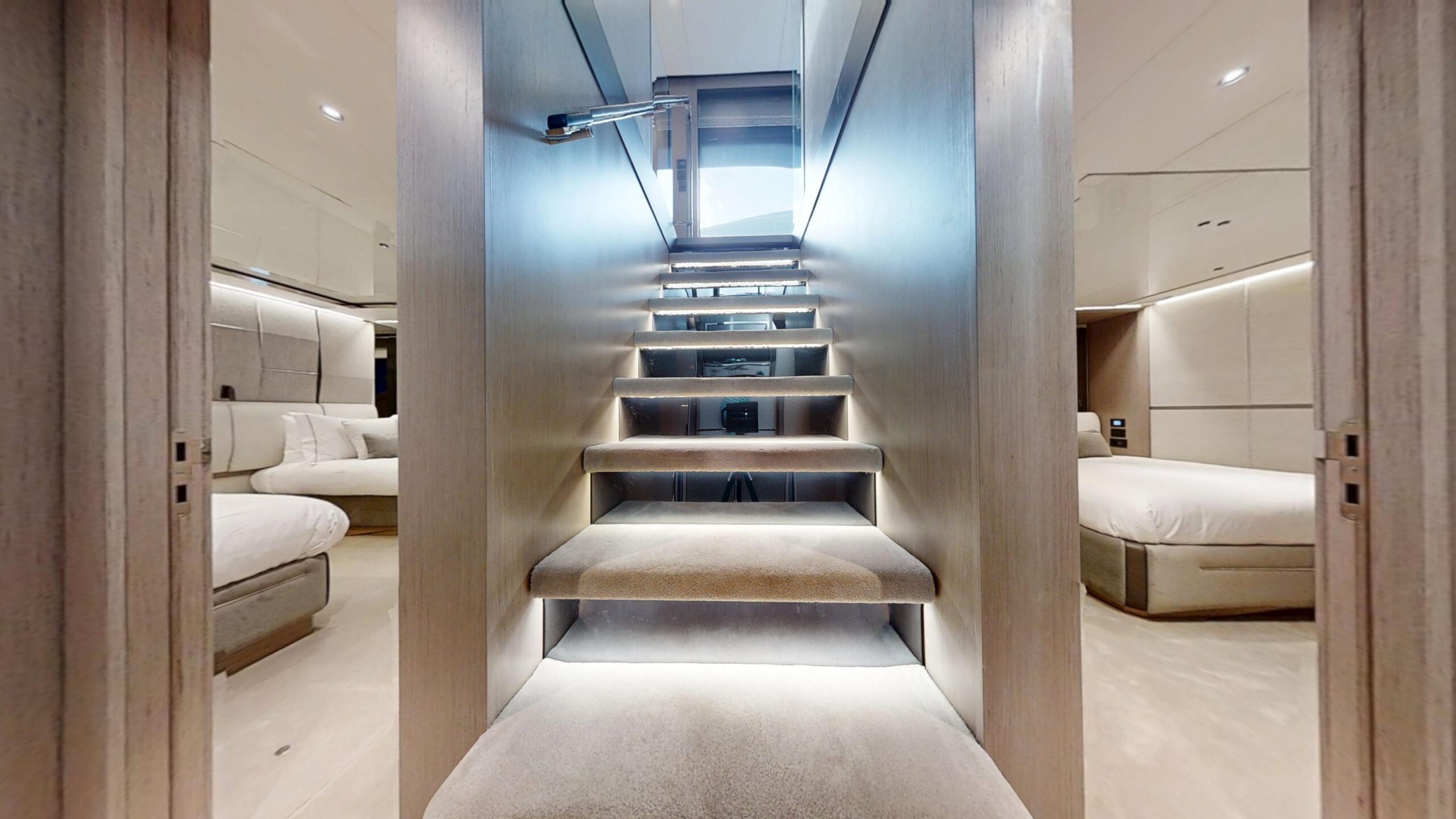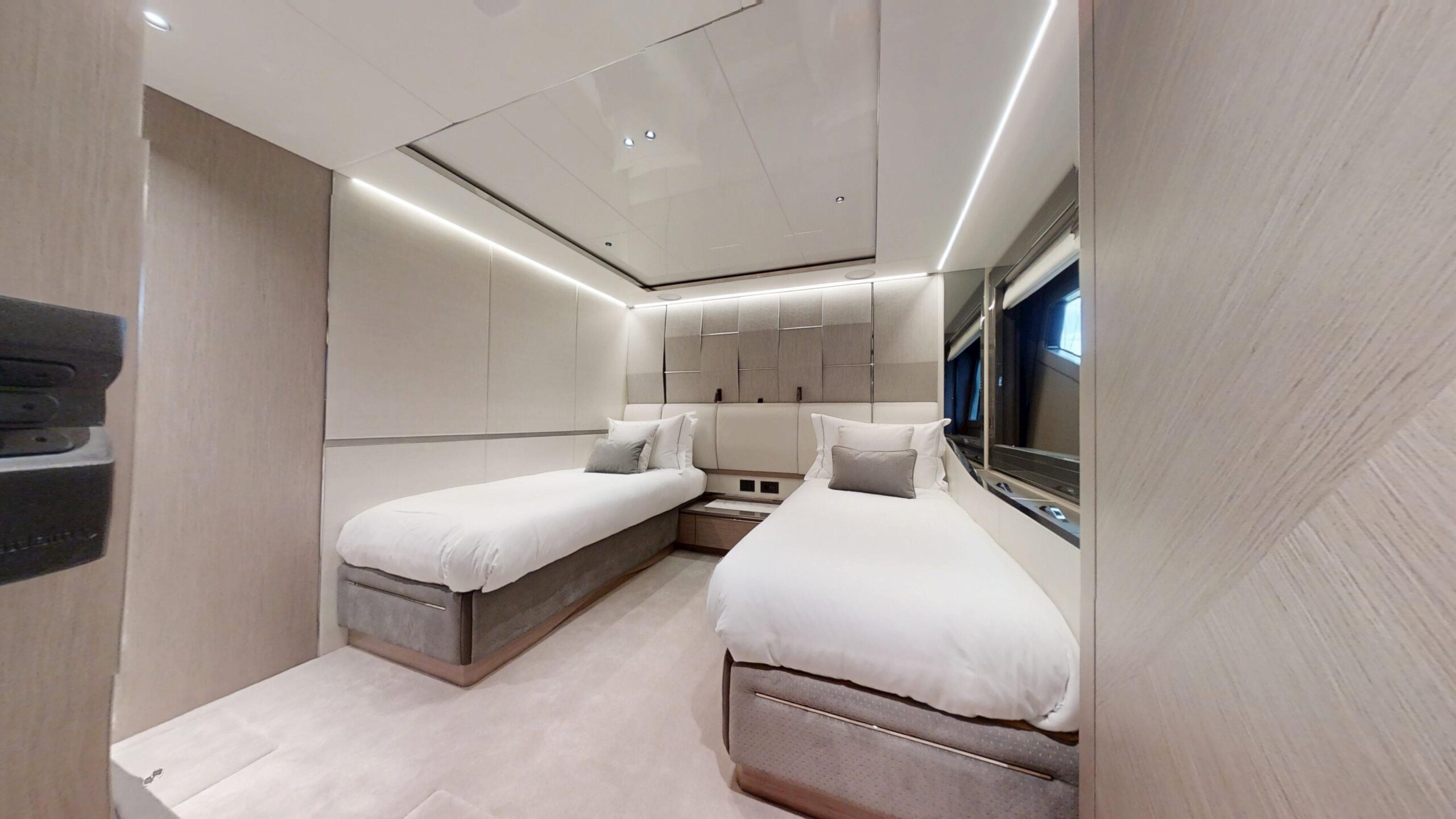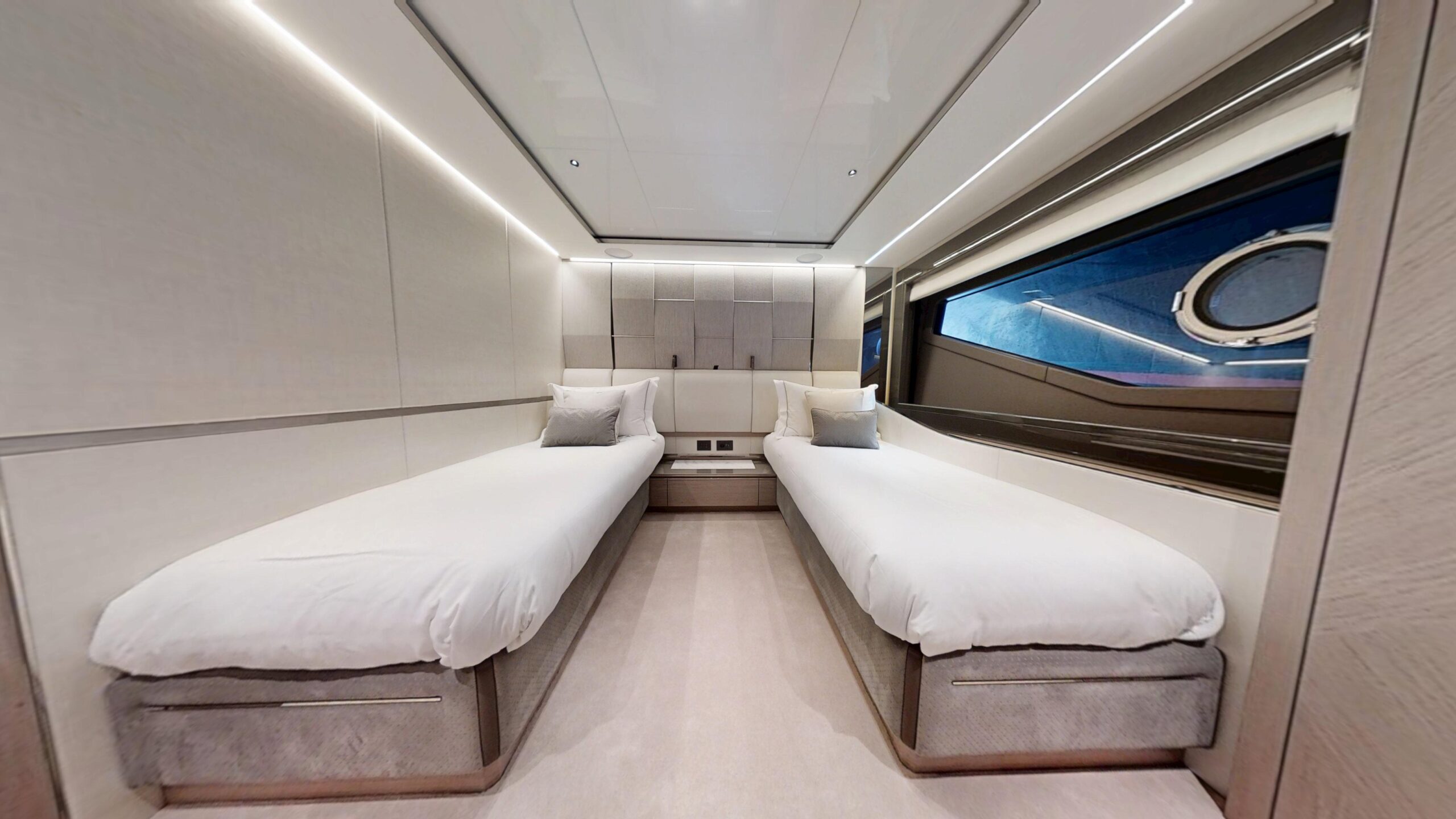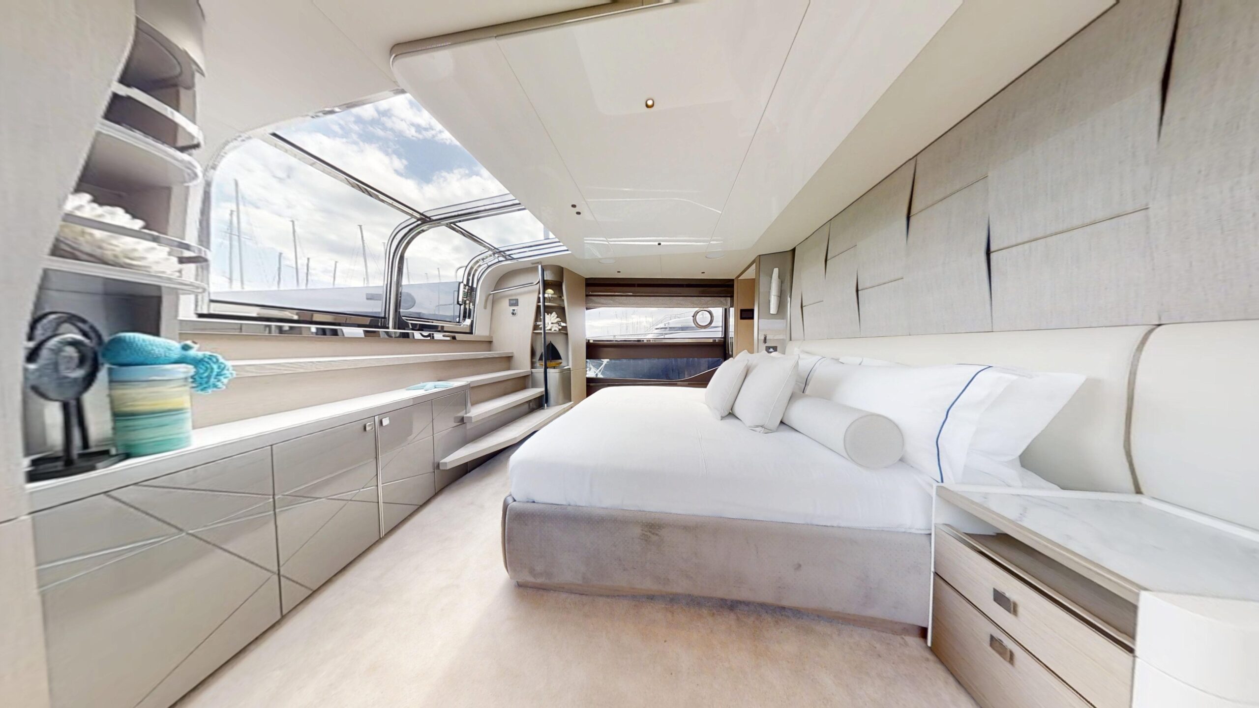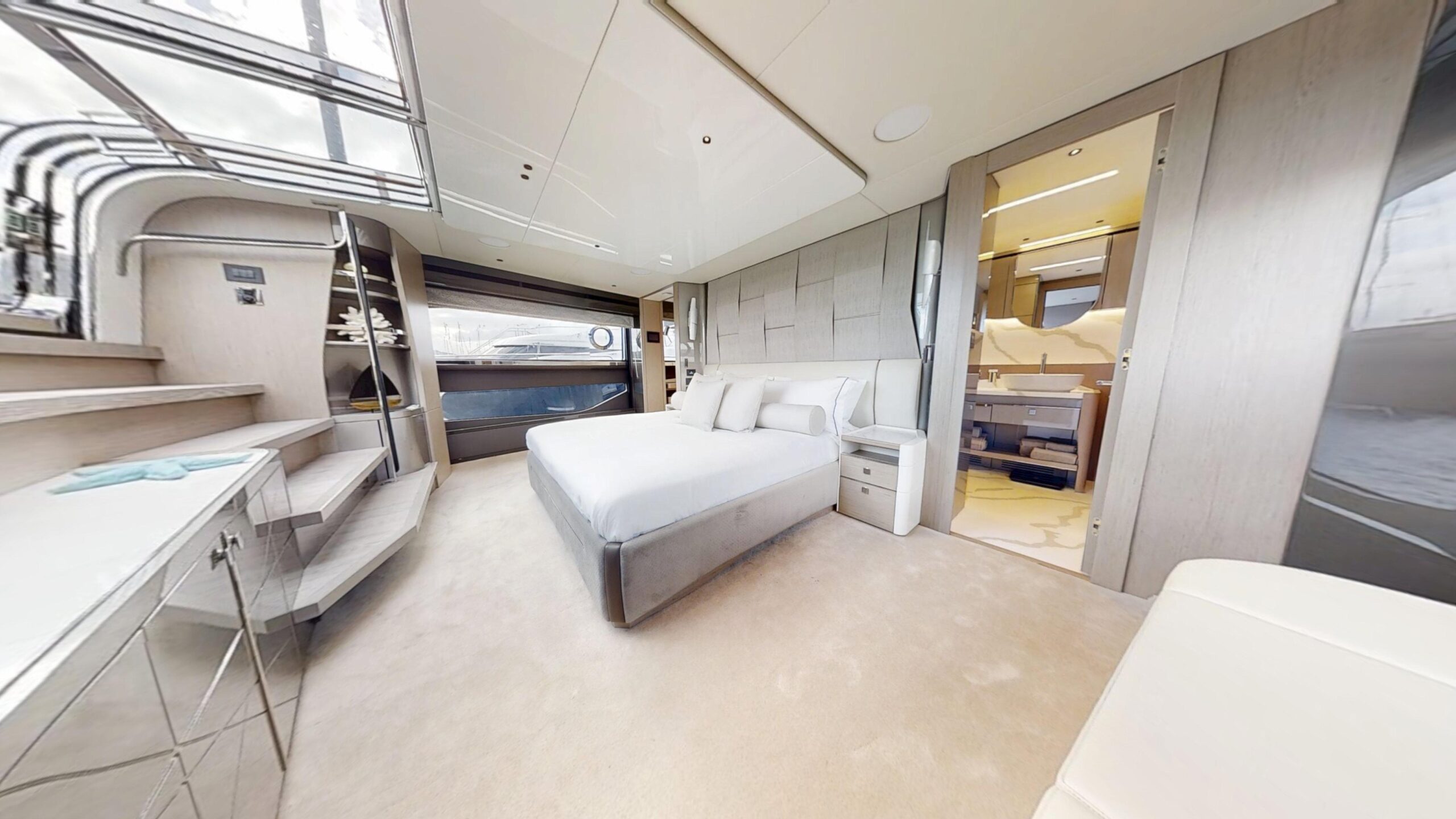 Безусловной изюминкой является мастер-каюта во всю ширину корпуса на главной палубе — с панорамными видами, частной носовой террасой, гардеробной и встроенным рабочим/туалетным столиком. Четыре дополнительные гостевые каюты на нижней палубе обеспечивают комфорт и универсальность для семьи или чартерного использования.